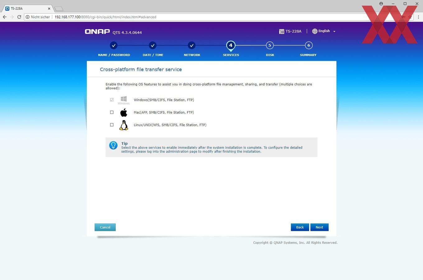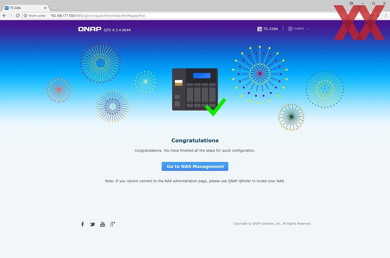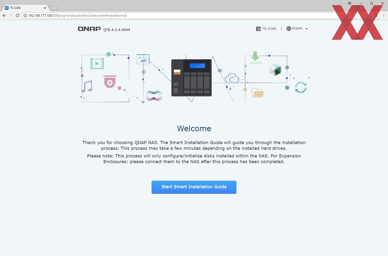 Wer ein aktuelles QNAP-NAS in Betrieb nehmen möchte, hat verschiedene Möglichkeiten: Die erste wäre es, das NAS über den HDMI-Port mit einem Bildschirm zu verbinden - sofern dieser vorhanden ist - und darüber die geführte Installation vorzunehmen. Bei dem TS-228A ist diese Option allerdings mangels HDMI-Schnittstelle nicht vorhanden. Als zweite Option lässt sich mithilfe der Software QFinder Pro von QNAPs Website ein Programm installieren, welches das NAS im Netzwerk findet und den Nutzer so einfach auf das Webinterface bringt, welcher dann per "intelligenter Installation" geführt die Konfiguration und Einrichtung vornehmen kann. Wer die per DHCP der TS-228A zugewiesene IP auch anderweitig, z.B. über den Router, herausfindet, benötigt QFinder natürlich nicht unbedingt, sondern kann auch direkt über die IP den "Smart Installation Guide" aufrufen.