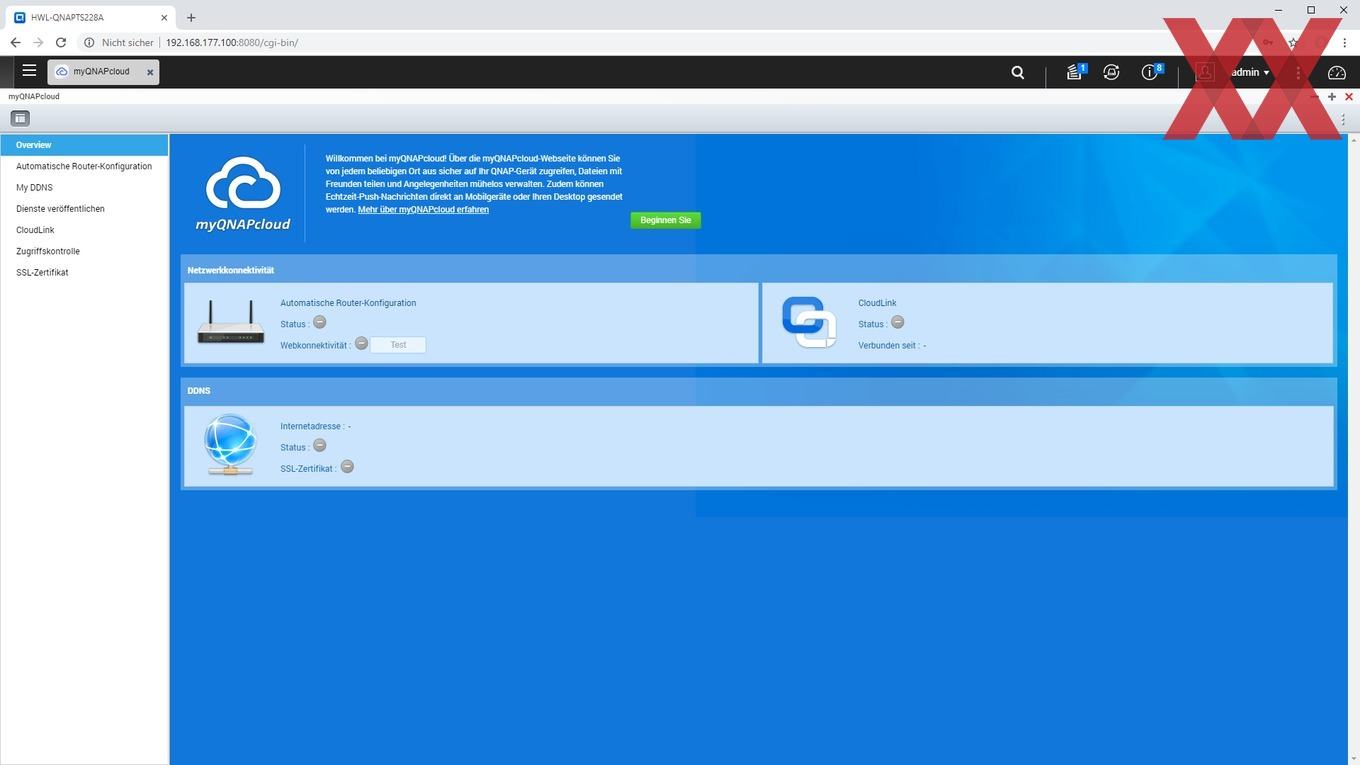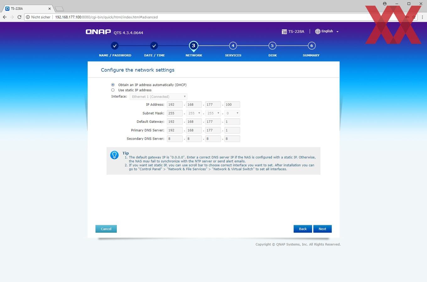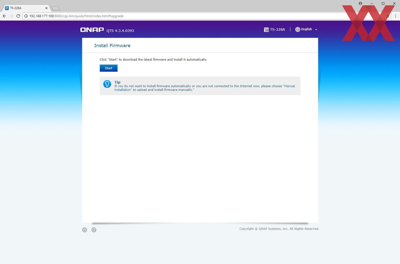 Wer ein aktuelles QNAP-NAS in Betrieb nehmen möchte, hat verschiedene Möglichkeiten: Die erste wäre es, das NAS über den HDMI-Port mit einem Bildschirm zu verbinden - sofern dieser vorhanden ist - und darüber die geführte Installation vorzunehmen. Bei dem TS-228A ist diese Option allerdings mangels HDMI-Schnittstelle nicht vorhanden. Als zweite Option lässt sich mithilfe der Software QFinder Pro von QNAPs Website ein Programm installieren, welches das NAS im Netzwerk findet und den Nutzer so einfach auf das Webinterface bringt, welcher dann per "intelligenter Installation" geführt die Konfiguration und Einrichtung vornehmen kann. Wer die per DHCP der TS-228A zugewiesene IP auch anderweitig, z.B. über den Router, herausfindet, benötigt QFinder natürlich nicht unbedingt, sondern kann auch direkt über die IP den "Smart Installation Guide" aufrufen.