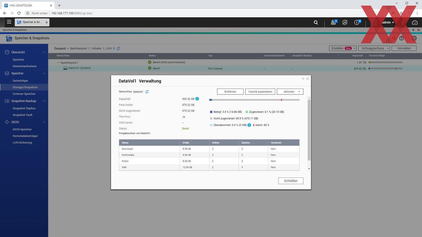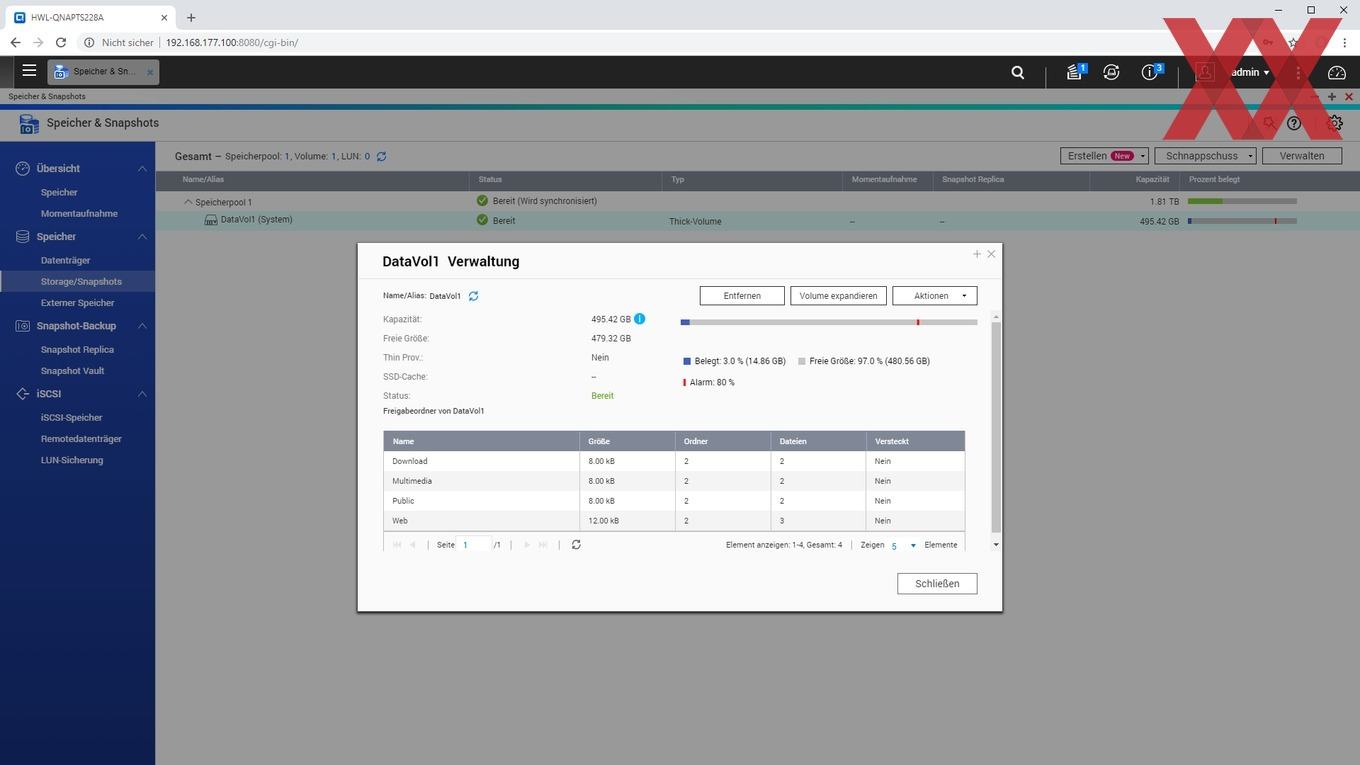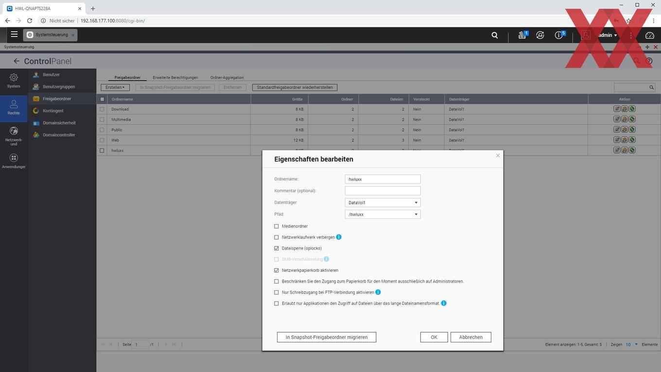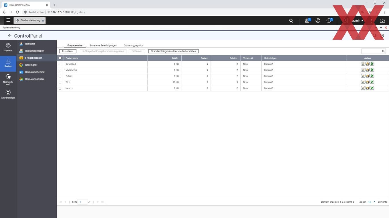 Auf den angelegten logischen Datenträgern (Volumes) lassen sich dann sehr flexibel Ordner anlegen, für die je nach Benutzer oder Benutzergruppe unterschiedliche Zugriffsberechtigungen vergeben werden können. Auch können wie üblich per USB angeschlossene externe Datenträger als Freigabeordner angelegt werden.