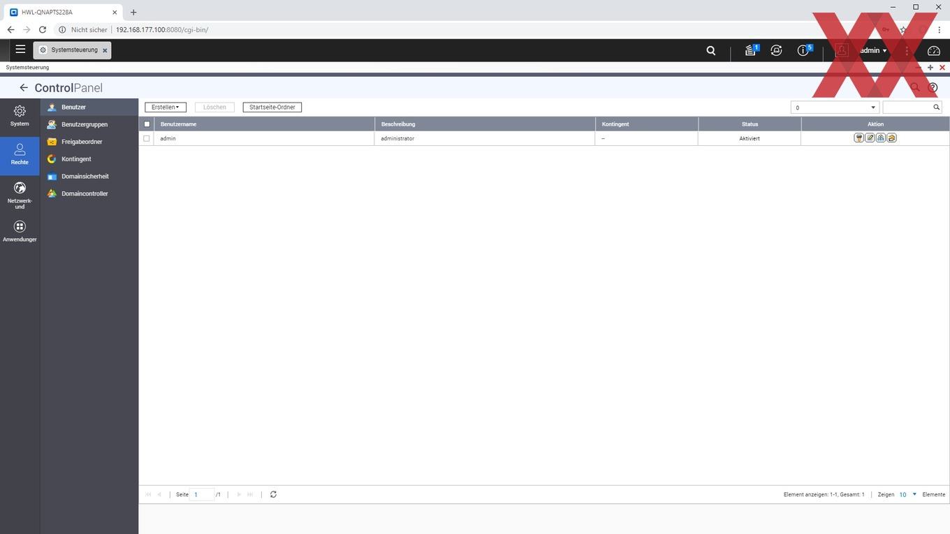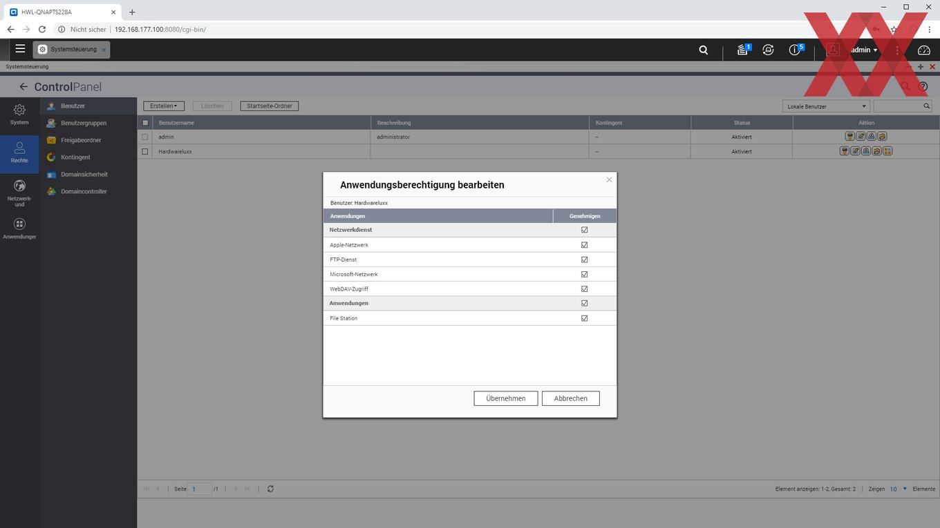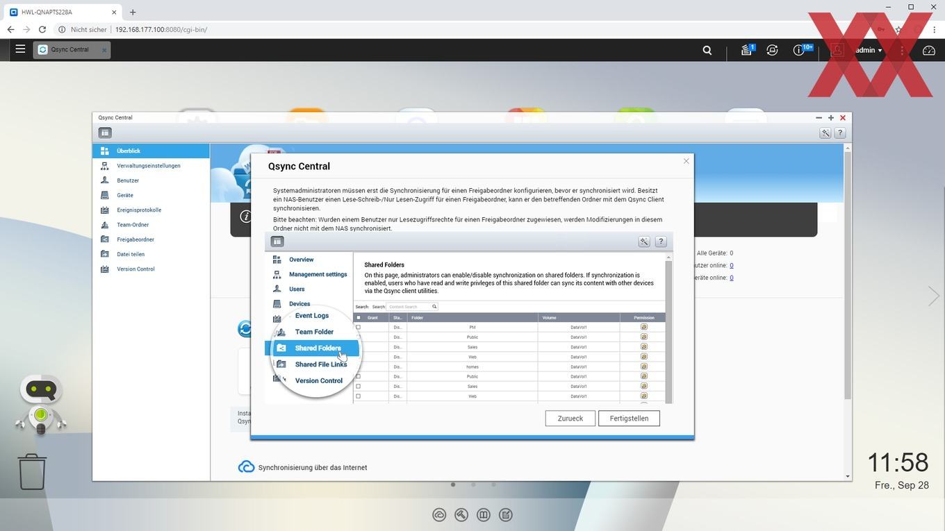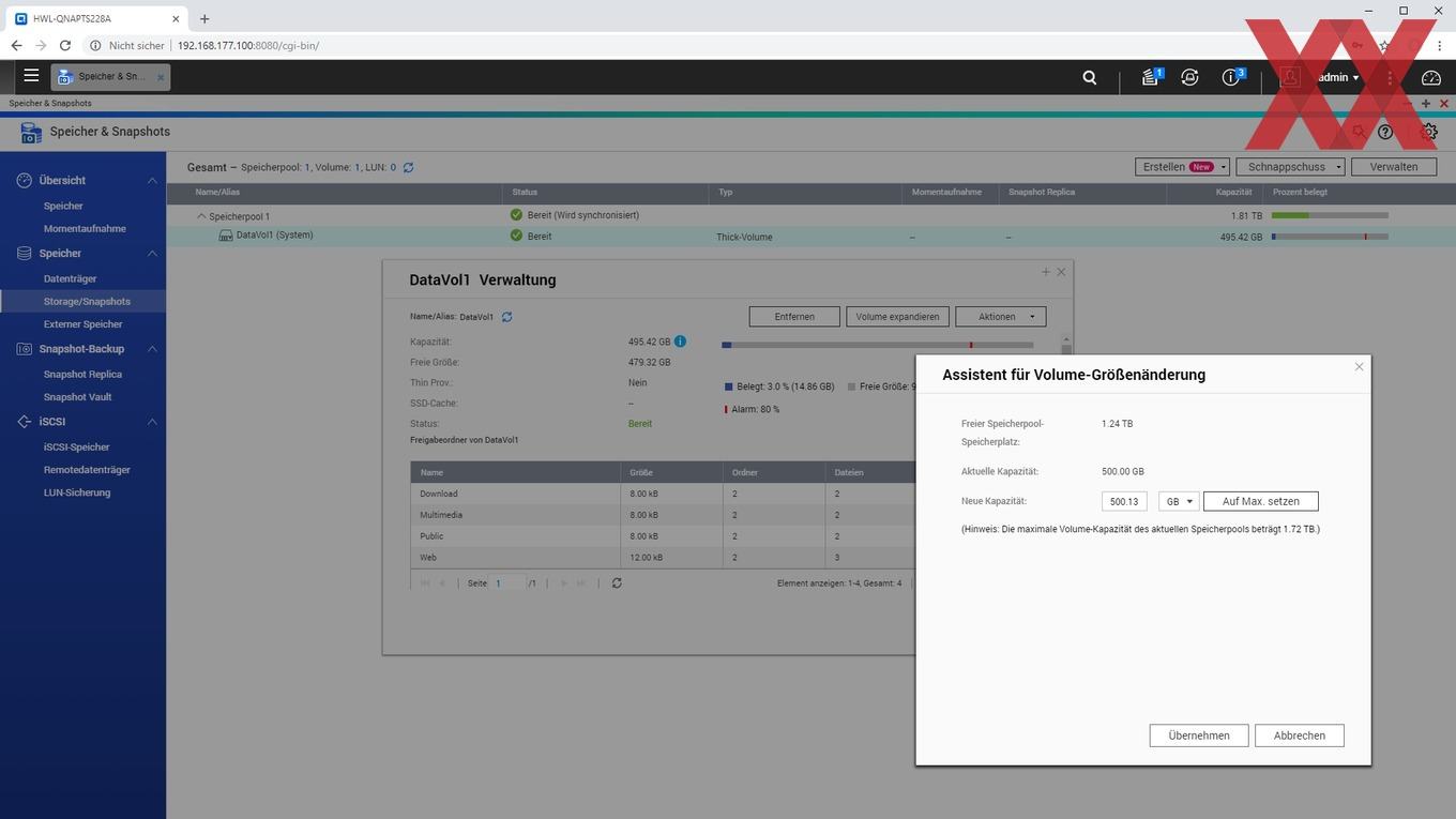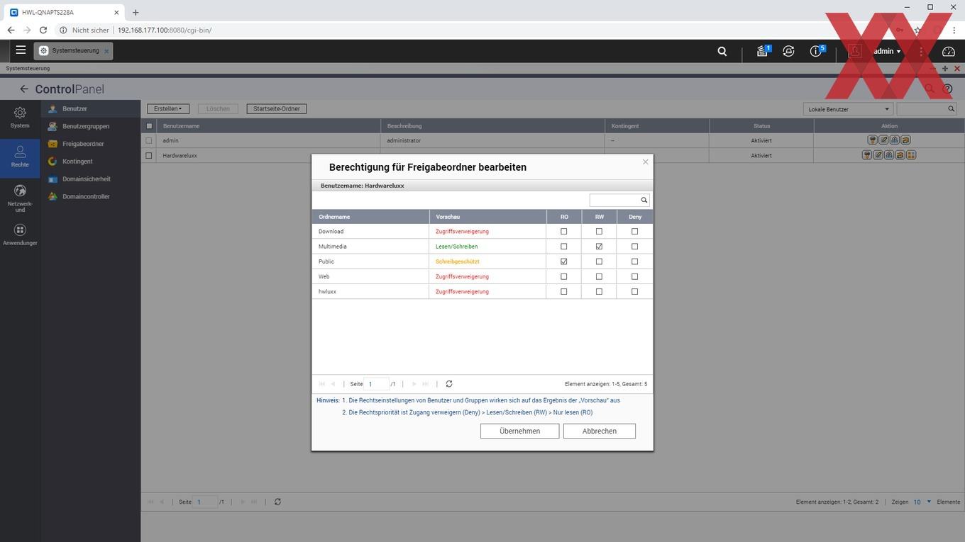 Auf den angelegten logischen Datenträgern (Volumes) lassen sich dann sehr flexibel Ordner anlegen, für die je nach Benutzer oder Benutzergruppe unterschiedliche Zugriffsberechtigungen vergeben werden können. Auch können wie üblich per USB angeschlossene externe Datenträger als Freigabeordner angelegt werden.
