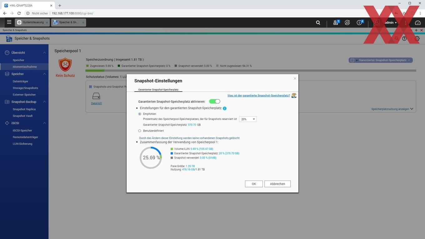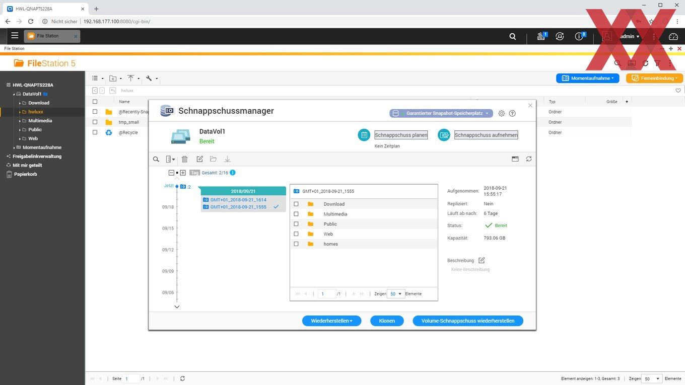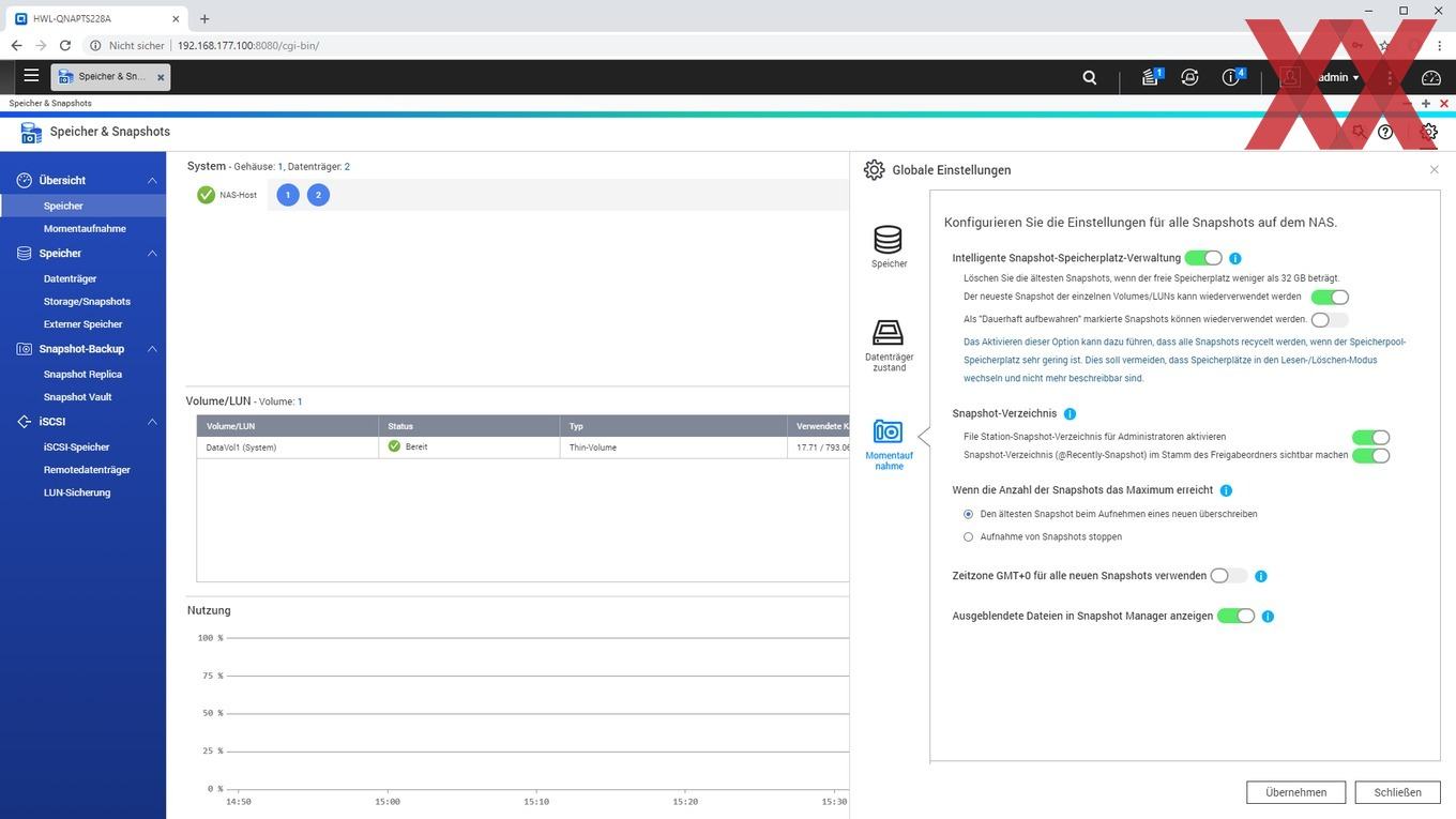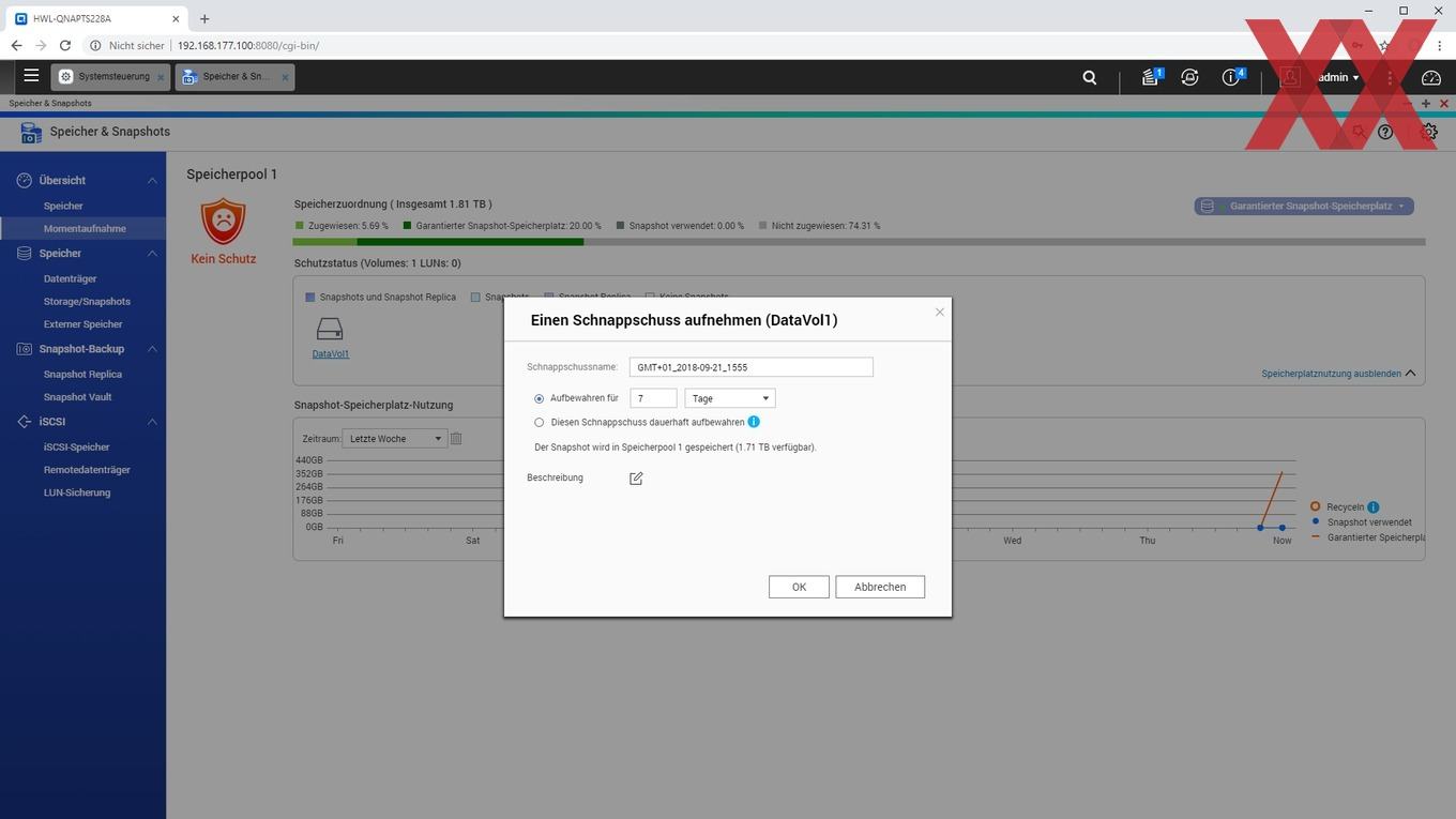 Ein weiteres noch relativ neues Feature von QTS ist das Anlegen von Snaphots, sofern kein statisches Einzelvolume, sondern ein Speicherpool verwendet und ein Teil der Kapazität dafür reserviert wird. QNAP verzichtet weiterhin auf eine btrfs-Implementierung und realisiert die Snapshot-Funktion mit dem altbekannten ext4-Filesystem. Es ist schön zu sehen, dass auch das Einsteigermodell TS-228A Snapshots nutzen kann, wenn der User dieses zugegebenermaßen fortgeschrittene Feature verwenden möchte.