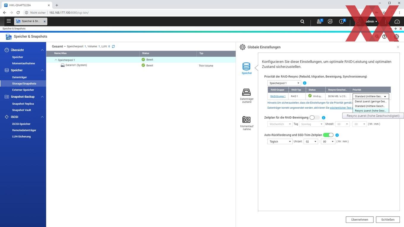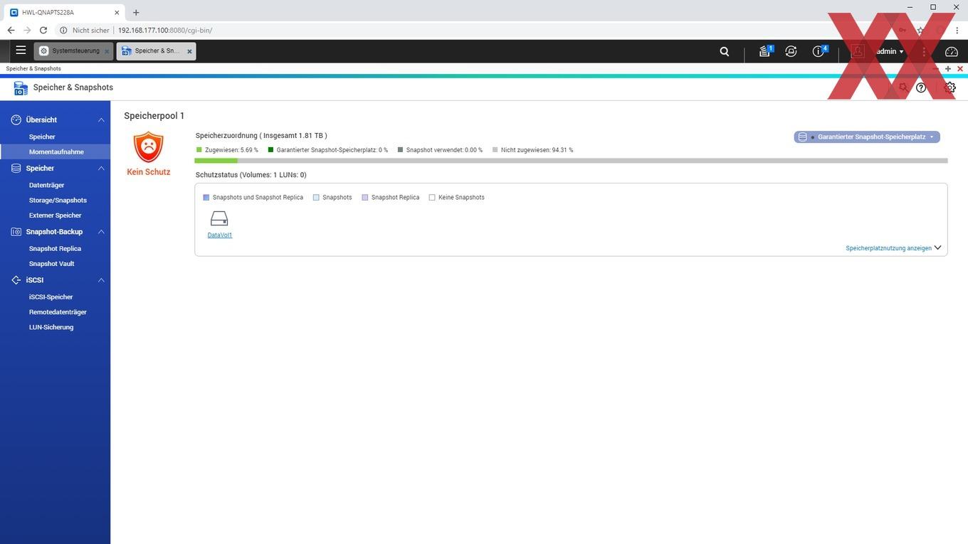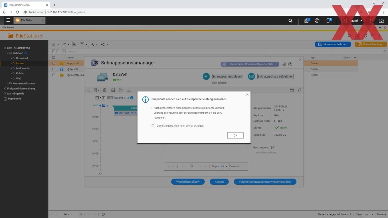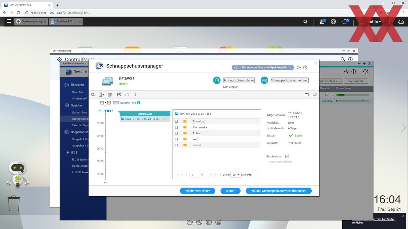 Ein weiteres noch relativ neues Feature von QTS ist das Anlegen von Snaphots, sofern kein statisches Einzelvolume, sondern ein Speicherpool verwendet und ein Teil der Kapazität dafür reserviert wird. QNAP verzichtet weiterhin auf eine btrfs-Implementierung und realisiert die Snapshot-Funktion mit dem altbekannten ext4-Filesystem. Es ist schön zu sehen, dass auch das Einsteigermodell TS-228A Snapshots nutzen kann, wenn der User dieses zugegebenermaßen fortgeschrittene Feature verwenden möchte.