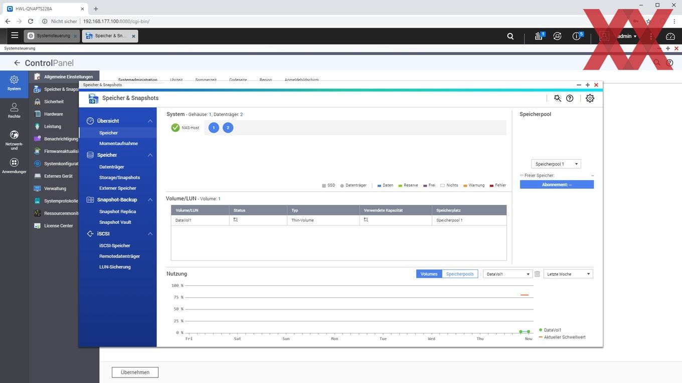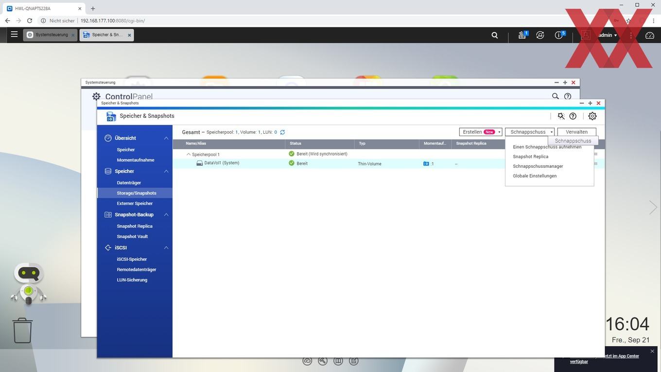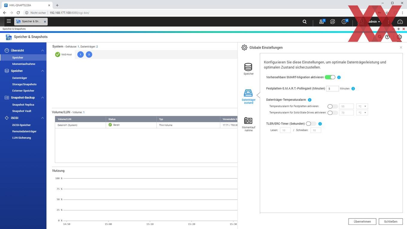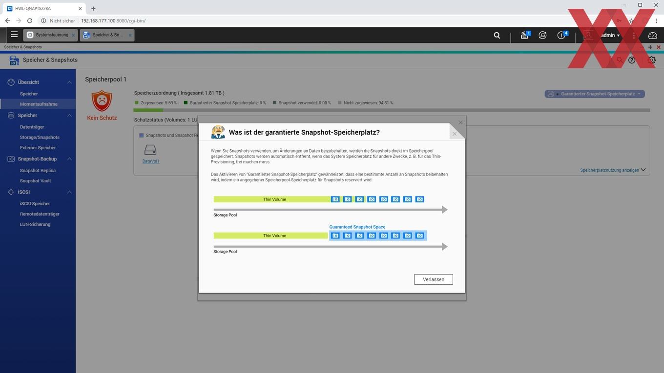 Ein weiteres noch relativ neues Feature von QTS ist das Anlegen von Snaphots, sofern kein statisches Einzelvolume, sondern ein Speicherpool verwendet und ein Teil der Kapazität dafür reserviert wird. QNAP verzichtet weiterhin auf eine btrfs-Implementierung und realisiert die Snapshot-Funktion mit dem altbekannten ext4-Filesystem. Es ist schön zu sehen, dass auch das Einsteigermodell TS-228A Snapshots nutzen kann, wenn der User dieses zugegebenermaßen fortgeschrittene Feature verwenden möchte.