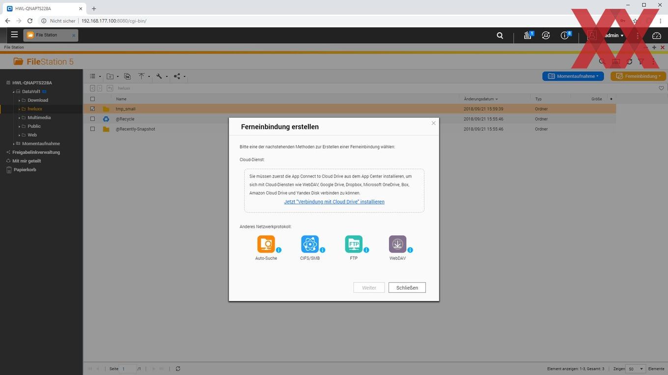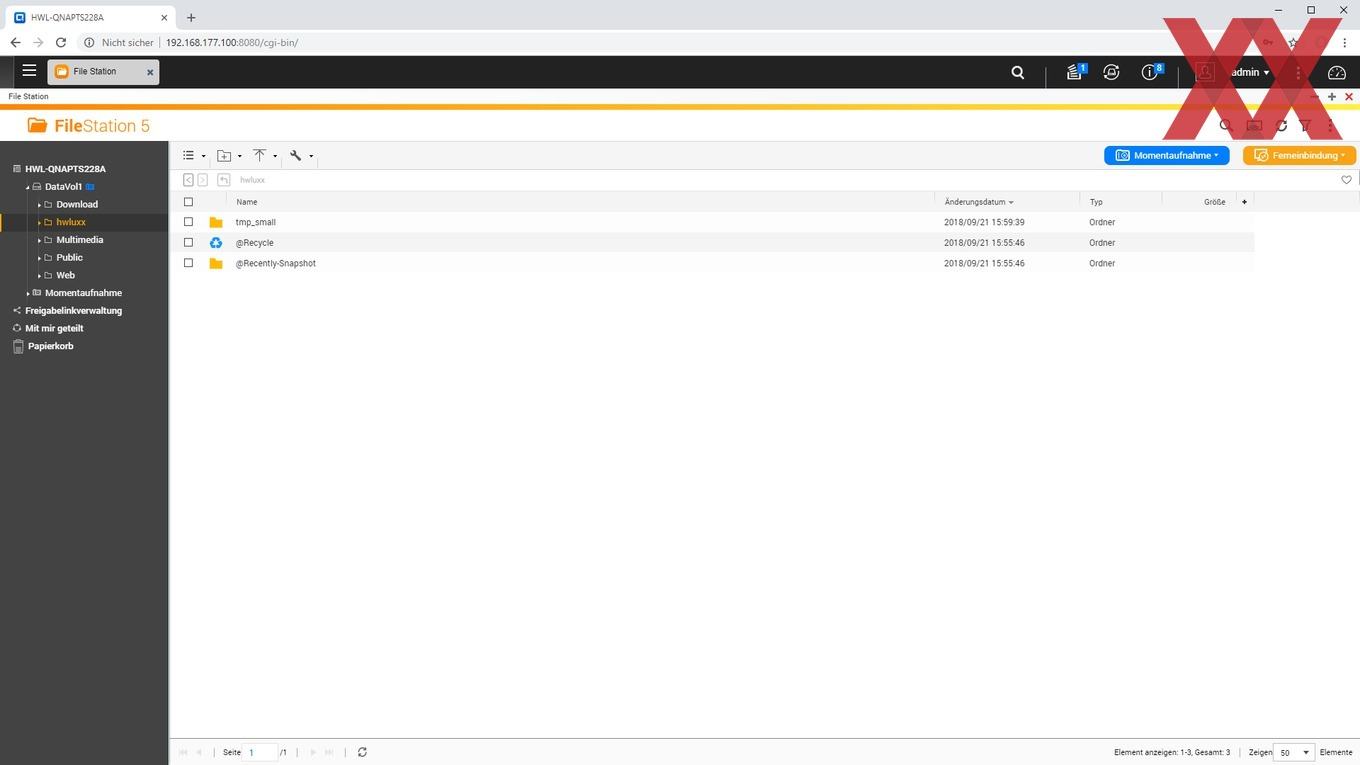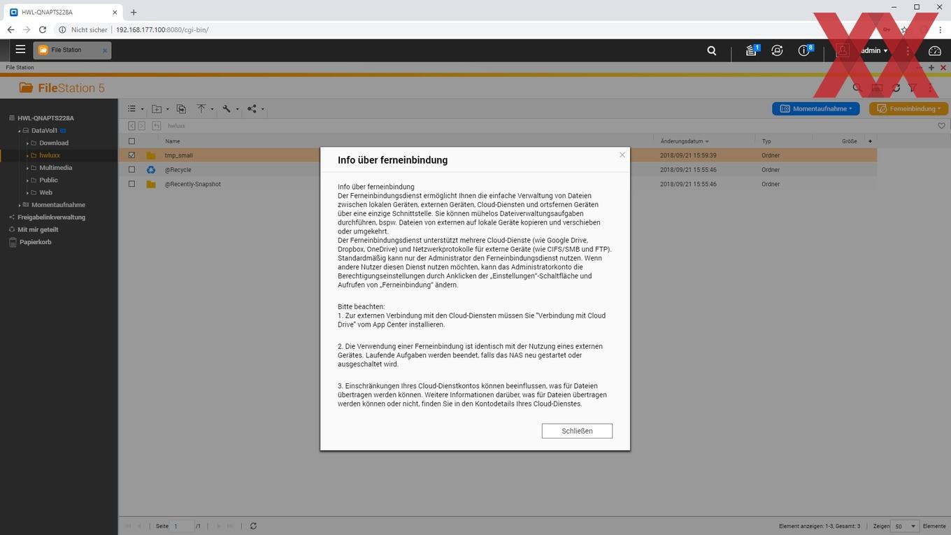 Mit der vorinstallierten File Station können die Dateien bzw. Verzeichnisse innerhalb der Freigabeordner auf dem NAS direkt über die Weboberfläche verwaltet werden. Auch können hier direkt Daten für den externen Zugriff über einen Downloadlink freigegeben werden. Weiterhin findet sich in der File Station ein direkter Zugriff auf die Snapshot-Funktionalität und ähnlich des Desktops bzw. Dateimanagers am Rechnern lassen sich Online-Speicherdienste wie Dropbox oder Onedrive hier ebenfalls einbinden.