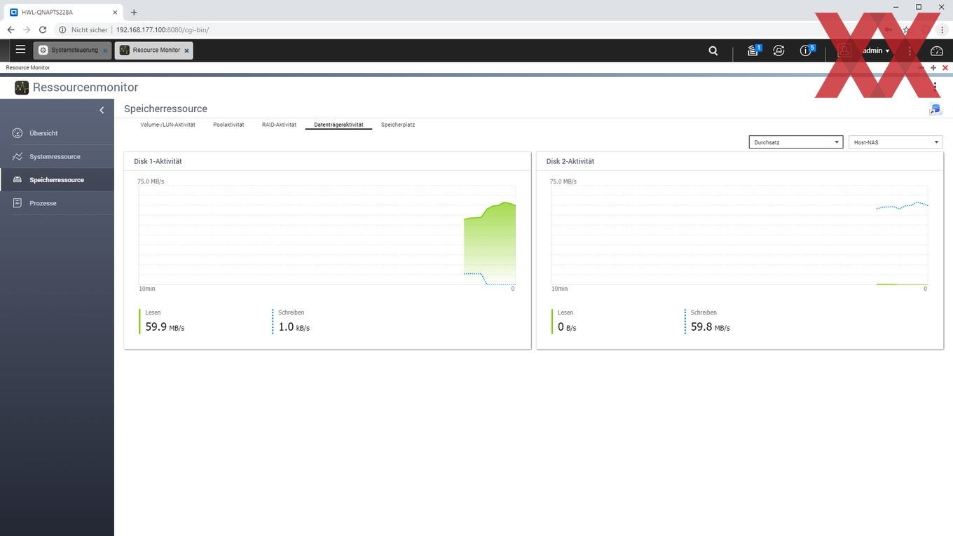 Als NAS ist eine wesentliche Funktionalität des TS-228A die Speicherung und Verwaltung von Daten. Die ein oder zwei 3,5-Zoll-Festplatten im TS-228A lassen sich in verschiedenen Modi nutzen, d.h. die Festplatten können entweder einzeln betrieben werden, oder per RAID 0, 1 oder "JBOD" kombiniert werden. Die Nutzung von 2,5-Zoll-Festplatten ist nicht vorgesehen, d.h. würden Bastellösungen erfordern.