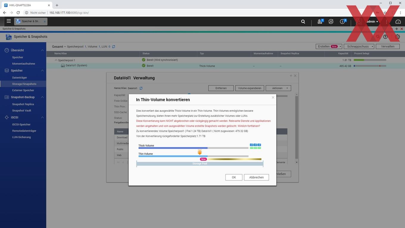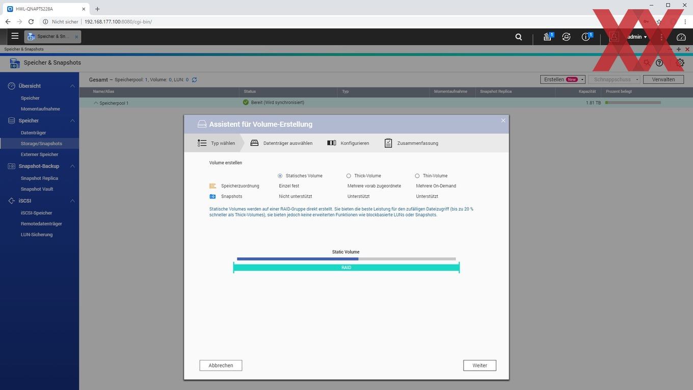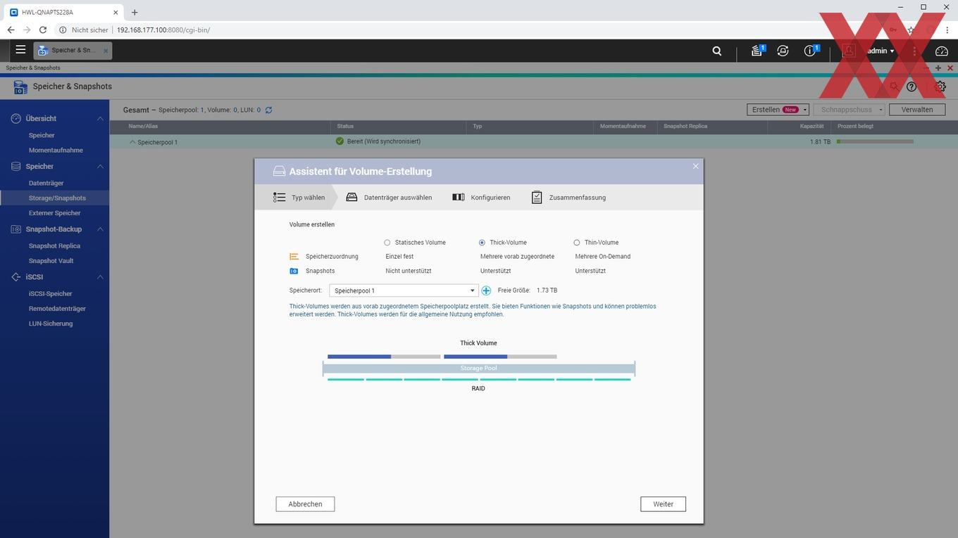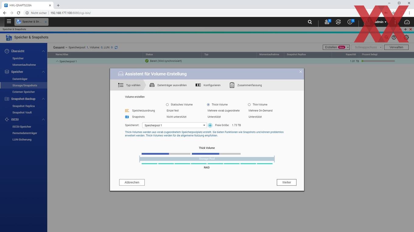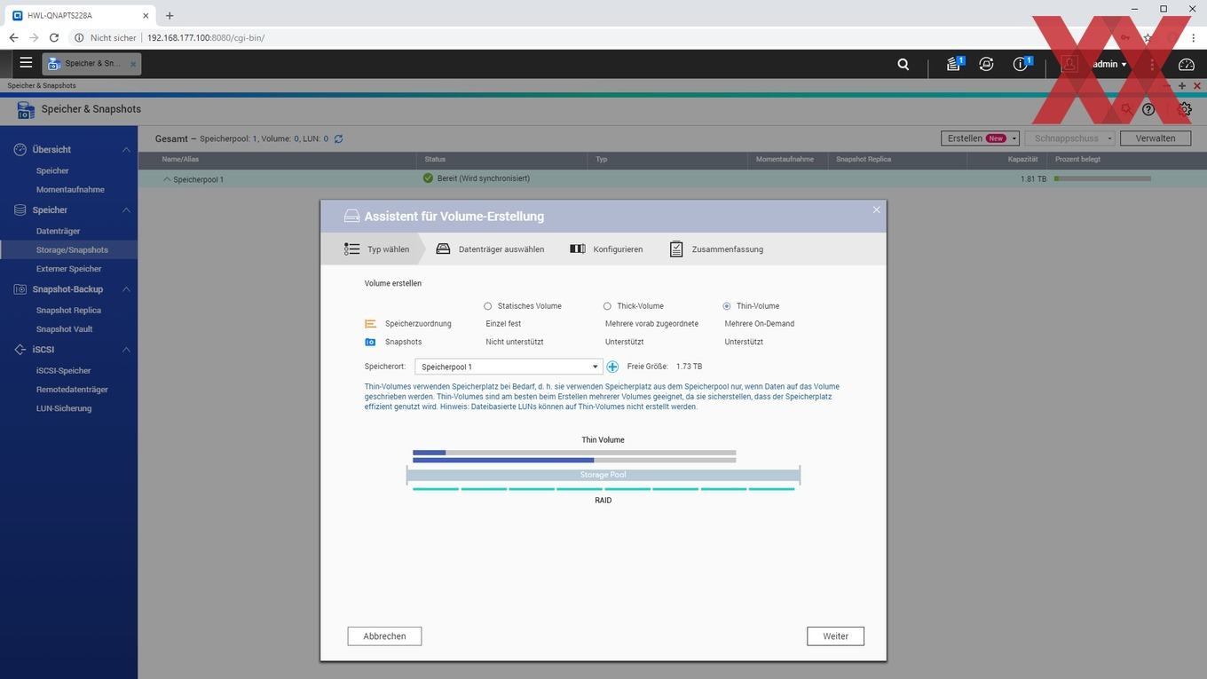 Alternativ dazu lässt sich anstelle eines direkten Volumes erst ein Speicherpool erstellen, in welchem dann ein oder mehrere Volumes flexibel eingebunden werden. Zur Auswahl stehen hier dann Thick- und Thin-Volumes. Bei Thick-Volumes wird der Speicherplatz bereits bei der Erstellung dem Volume zugewiesen und kann nachträglich nur vergrößert werden, sofern der Speicherpool noch nicht zugewiesenen Speicherplatz bietet. Bei Thin-Volumes wird der Speicherplatz des Pools den einzelnen Volumes im Speicherpool theoretisch je nach Bedarf zugewiesen. Es lassen sich also mehrere Volumes parallel verwenden, wobei der physische Gesamtspeicherplatz dann flexibel auf die Thin-Volumes aufgeteilt werden kann. Zu erwähnen gilt hier, dass das Thin-Provisioning (meist geringe) Einflüsse auf die Performance hat und auch die erneute Freigabe von Speicherplatz nach Löschung der Daten bei Thin-Provisioning teilweise nicht ganz so einfach ist. Die Frage ist hier, wie flexibel die Volumes benötigt werden.