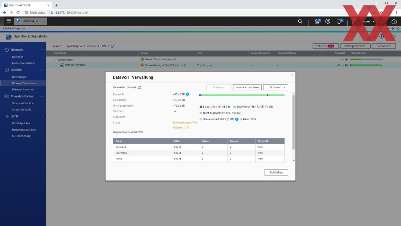 Die meisten Heim-User kommen in der Regel mit einem einzelnen statischen Volume aus und nutzen dann nur die "Verwaltung" über entsprechende Freigaben auf diesem Volume. Interessant werden bei QNAP Multi-Volumes über einen Speicherpool aber dann, wenn die Daten nur teilweise verschlüsselt werden sollen. Seit QTS 4.2 bietet QNAP auch eine ordnerbasierte Verschlüsselung an, also auf Basis eines freigegebenen Ordners. Allerdings hat die schon lange angebotene volumenbasierte Verschlüsselung einige Vorteile, wie z.B. Flexibilität bei langen Dateinamen/-pfaden. Über einen Speicherpool und Multi-Volumes ließe sich dann ein verschlüsseltes Volume parallel zu einem unverschlüsselten erstellen, ohne jeweils den Volumes eigene physische Laufwerke zuweisen zu müssen.