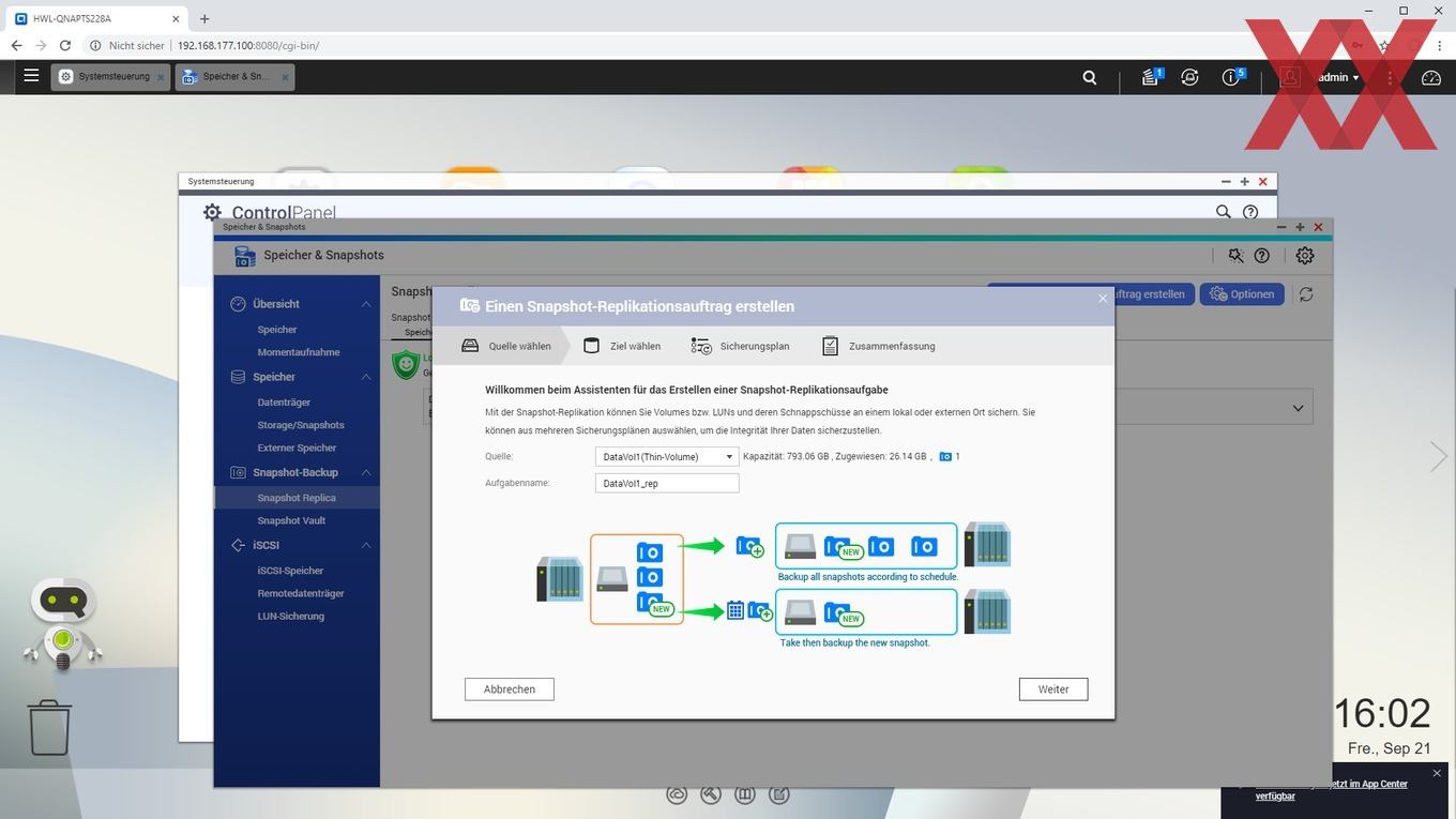 Snapshots werden bei QNAP auf Volume-Basis erstellt, wahlweise manuell oder automatisiert, bzw. auch mit Aufbewahrungsfrist. Weiterhin besteht auch die Möglichkeit, dass ein NAS mit QTS seine Snapshots per "Snapshot Replica" auf ein anderes QTS-NAS sichert. Snapshots können zur Datenwiederherstellung entweder in ein neues Volume "geklont" werden oder sie lassen sich als spezielle Unterverzeichnisse einblenden. Natürlich lässt sich auch das Volume direkt wieder auf den Zeitpunkt des Snapshots zurückbringen, allerdings sind dann wie bei anderen Lösungen auch alle nachträglichen Änderungen verloren.