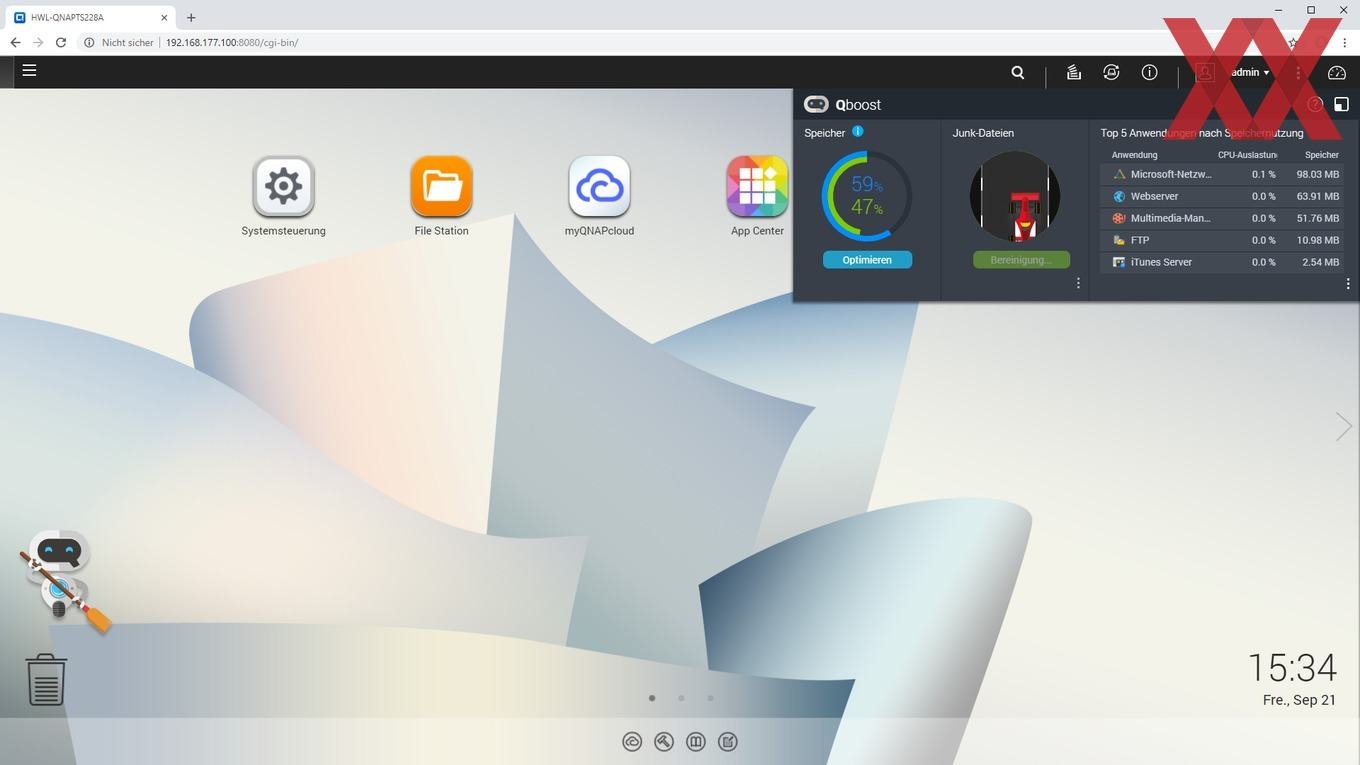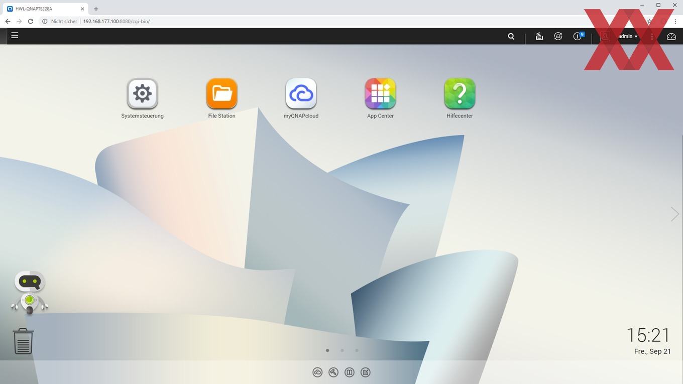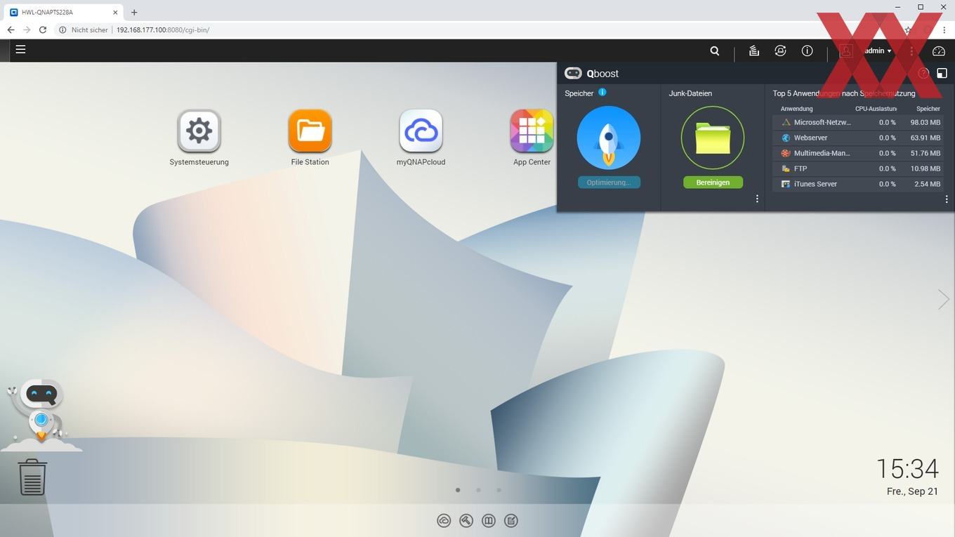 Die Oberfläche von QTS teilt sich in den eigentlichen Desktop mit den verschiebbaren und in Ordnern sortierbaren Icons und einer Taskleiste am oberen Rand auf. Über die Taskleiste lässt sich eine Art Schnellstartleiste ausklappen, die gerade aktiven Programme werden anzeigt und im Bereich rechts oben lassen sich Benachrichtigungen finden, bzw. auch ein Kontrollcenter aufrufen, welches die wichtigsten Systemparameter anzeigt.