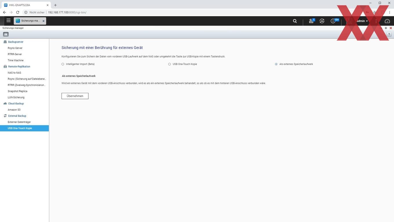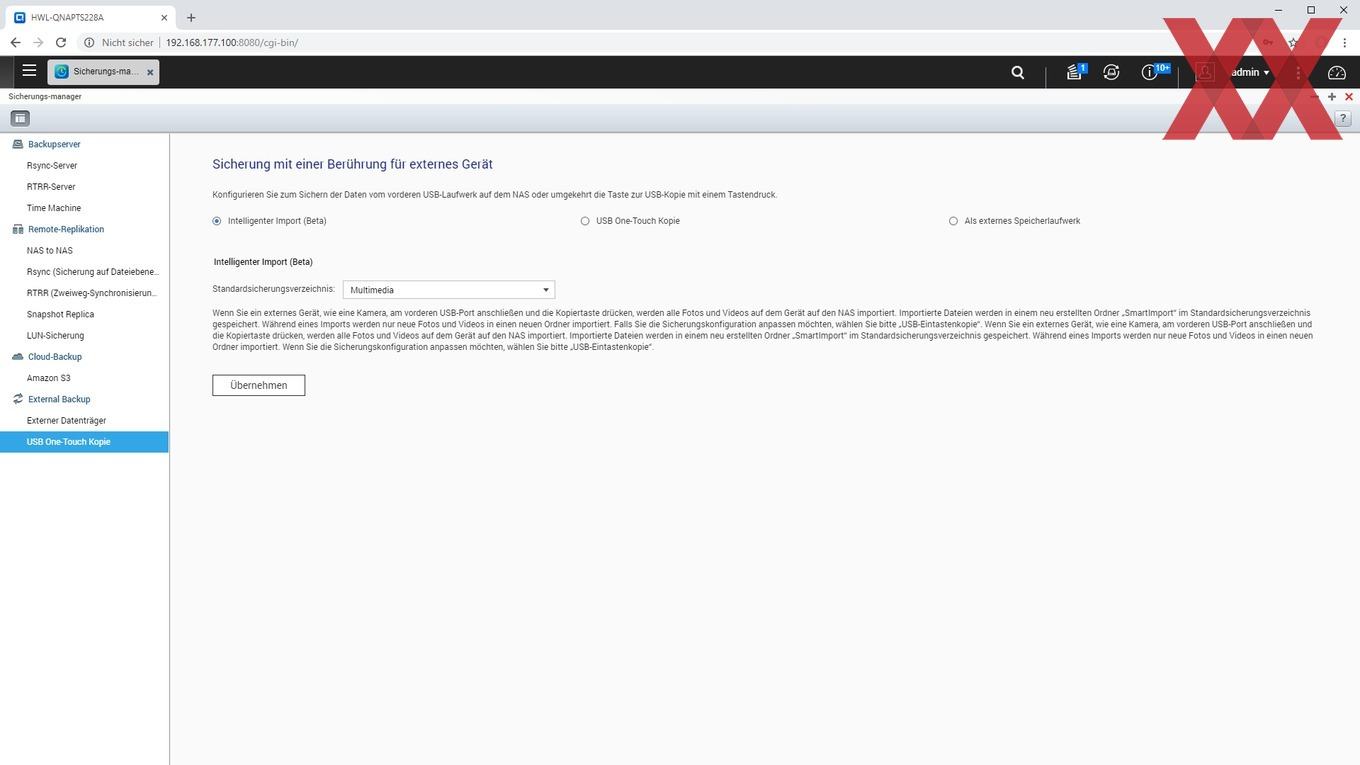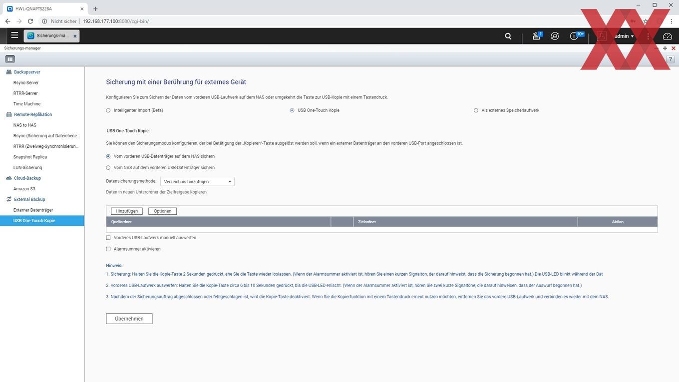 Für Datenträger steht an der Frontseite des TS-228A aber auch ein USB-3.0-Port zu Verfügung. Dieser kann mittels der direkt darüber liegenden Taste auch mit einer "One-Touch-Kopie"-Funktion genutzt werden. Im Sicherungsmanager kann eingestellt werden, was bei Druck der Taste passiert. Optionen sind ein "intelligenter Import" in ein Standardverzeichnis, das Kopieren definierter Ordner vom oder auf das NAS und die Nutzung als externes Laufwerk, was dann entsprechend eingebunden wird.