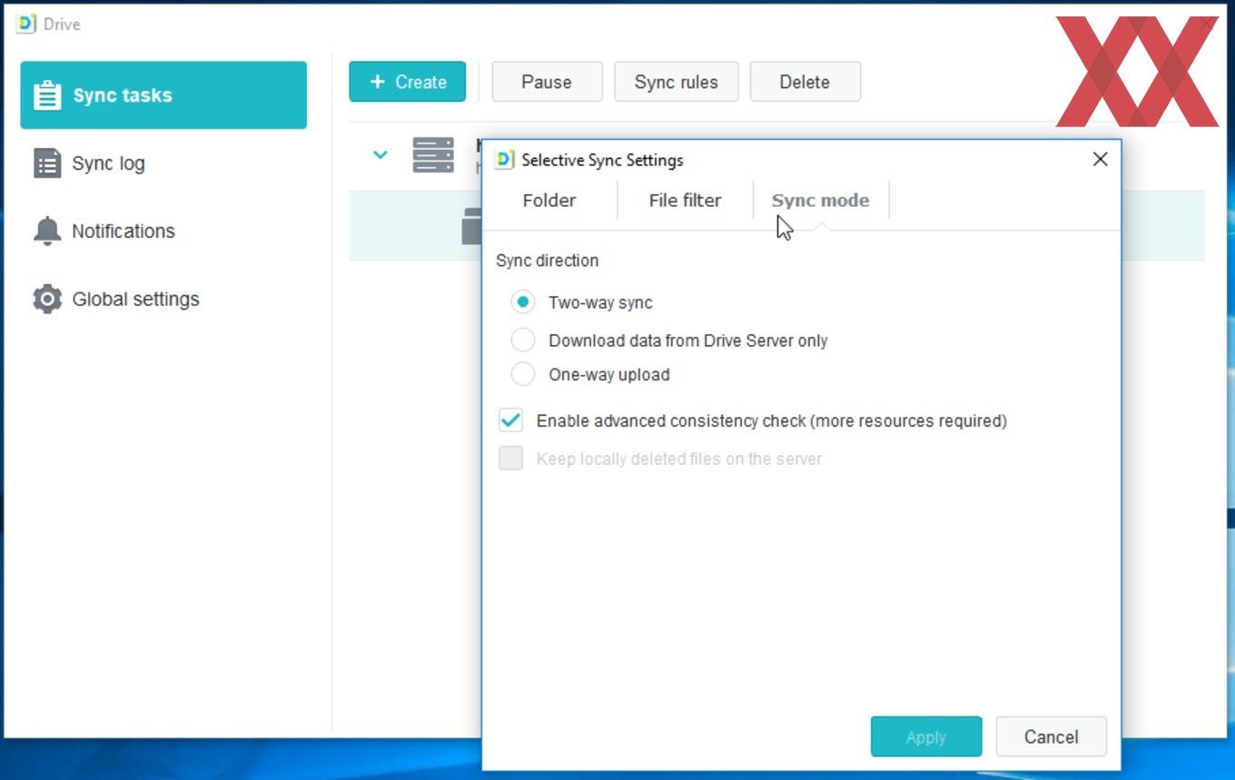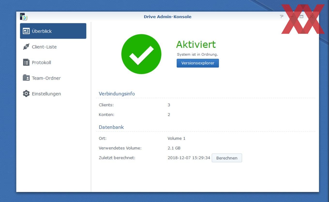 Synology Drive besteht aus mehreren Komponenten. Auf der Flashstation selbst läuft die Serverapplikation, welche über die Drive-Adminkonsole konfiguriert werden kann. Hier kann z.B. eingestellt werden, welche der gemeinsamen Ordner auf dem System für eine Nutzung durch Drive freigegeben werden und welche Versionierung verwendet wird.