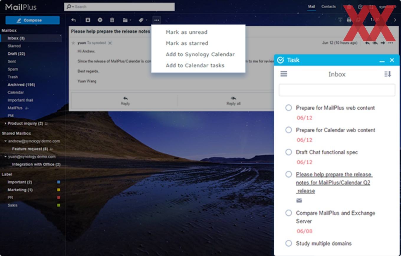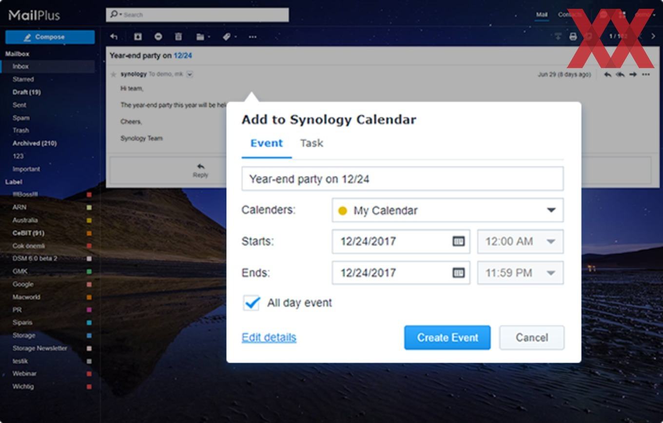 Als letzte Lösung bleibt noch Synologys Mailserver-Umgebung „MailPlus“ zu erwähnen, welcher den Betrieb eines privaten Mailservers ermöglicht, der einerseits umfangreiche Funktionen besitzt, aber über den webbasierten Client auch einfachen Zugriff bietet. MailPlus bietet eine Integration mit Synology Chat und Synology Calendar, was vielfältige Möglichkeiten bietet, sofern diese Lösungen parallel eingesetzt werden. So können Aufgaben und Ereignisse aus MailPlus gleich mit dem Kalender interagieren und für direkte Konversationen von MailPlus auf Chat gewechselt werden, plus noch etliche weitere Verzahnungen.