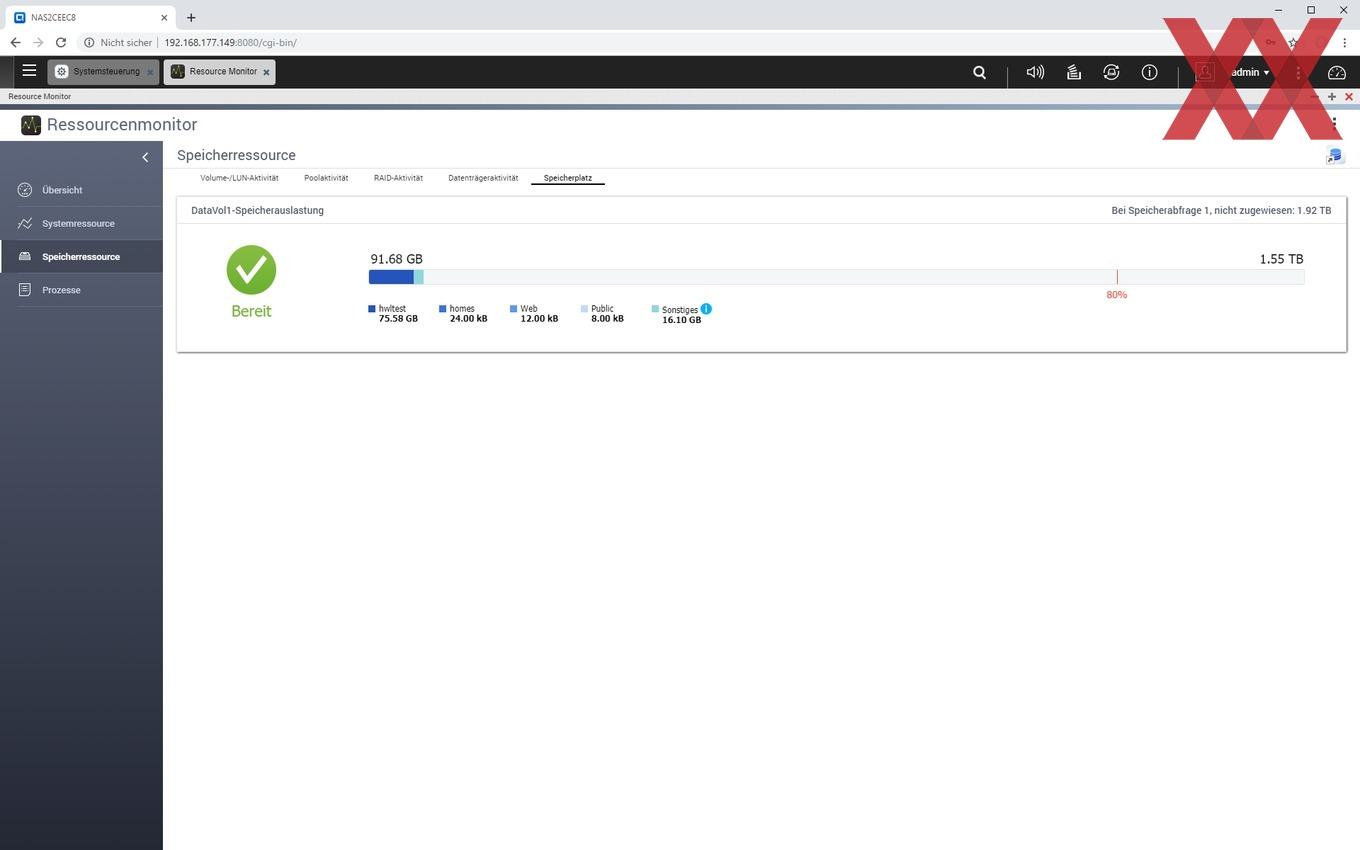 Die Verwaltung der Speicherkapazität ist bei einem NAS meist etwas komplizierter als das simple Anlegen einer Partition und anschießender Formatierung. Bei QNAP ist die Struktur dabei ähnlich wie bei anderen NAS-Systemen. Zuerst wird über die ausgewählten Laufwerke per ausgewähltem RAID-Modus ein Verbund erstellt, auch Speicherpool genannt. In diesem Speicherpool werden dann wiederrum ein oder mehrere Volumen angelegt, wobei es hier auch verschiedene Modi (Thick-/Thin-Volume) gibt. Bei einem Thick-Volume wird der gewünschte Teil des Speicherpools fest für das Volumen reserviert, wohingegen bei einem Thin-Volume dieser beim Schreiben dynamisch zugewiesen wird, was u.a. Vorteile bei mit der Zeit skalierenden Systemen bringen kann. Ein Nachteil insbesondere von Thin-Volumes kann allerdings aufgrund der Komplexität eine geringere Performance sein.