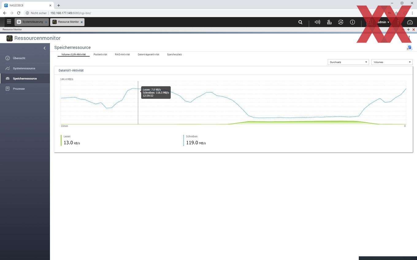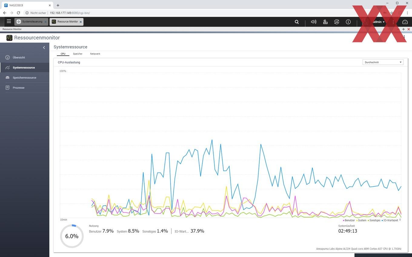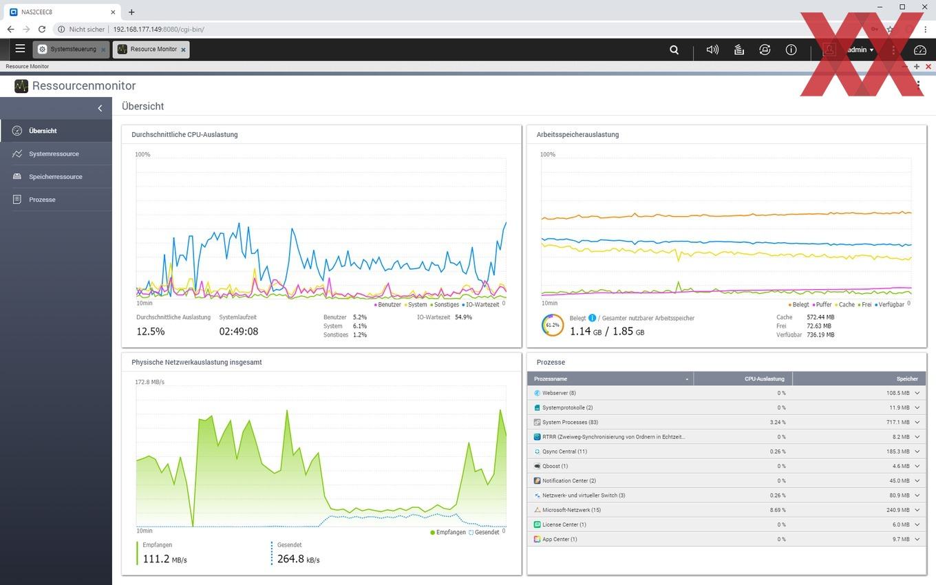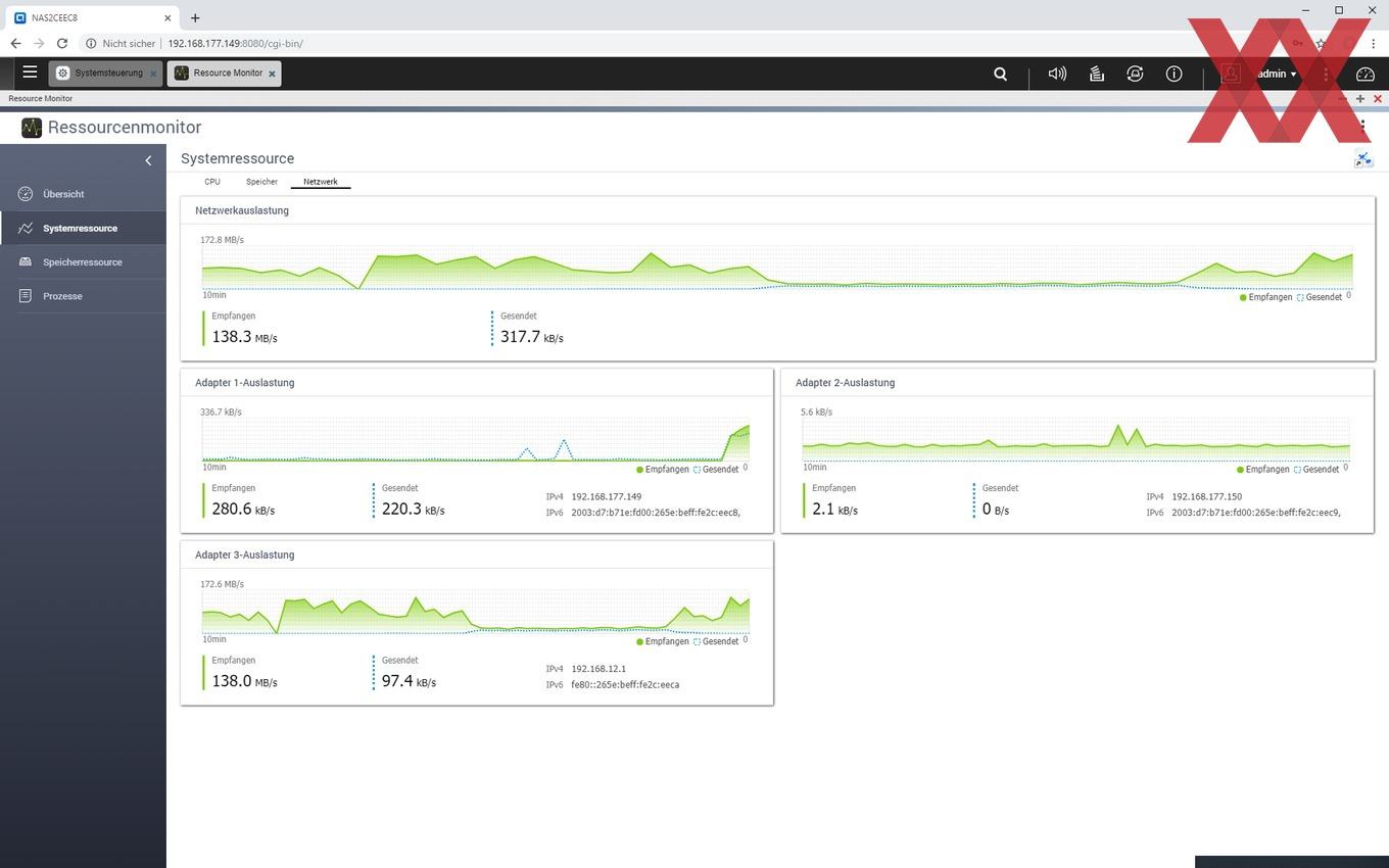 Der Ressourcenmonitor, welche die Aktivitäten und Auslastungen des NAS-Systems visualisiert, wurde mit jeder neuen QTS-Version weiterentwickelt und ist mittlerweile recht umfassend vom Inhalt und auch optisch attraktiver geworden. Die Übersichtsseite gibt einen guten Überblick über die Auslastung des NAS. In detaillierten Fenstern wird dann der jeweilige Verlauf der Systemressource je nach Typ in verschiedenen Formen dargestellt. Die Netzwerkauslastung wird beispielsweise sowohl global als auch aufgeschlüsselt nach den einzelnen Adaptern bzw. Bonds dargestellt. Auch die Aktivitäten der drei Laufwerke werden jeweils einzeln dargestellt. Eine Auflistung der aktiven Prozesse sowie deren Ressourcenverbrauch ist natürlich ebenfalls verfügbar.