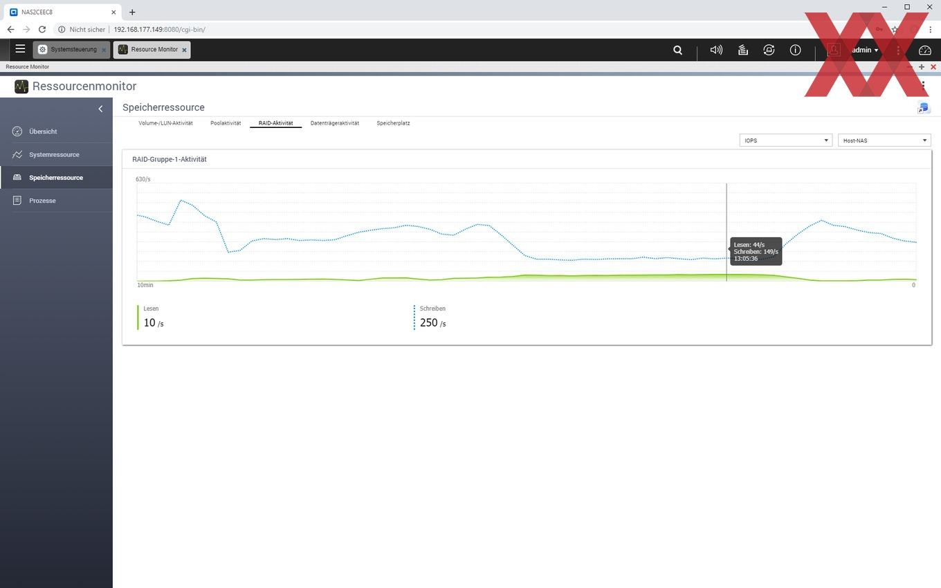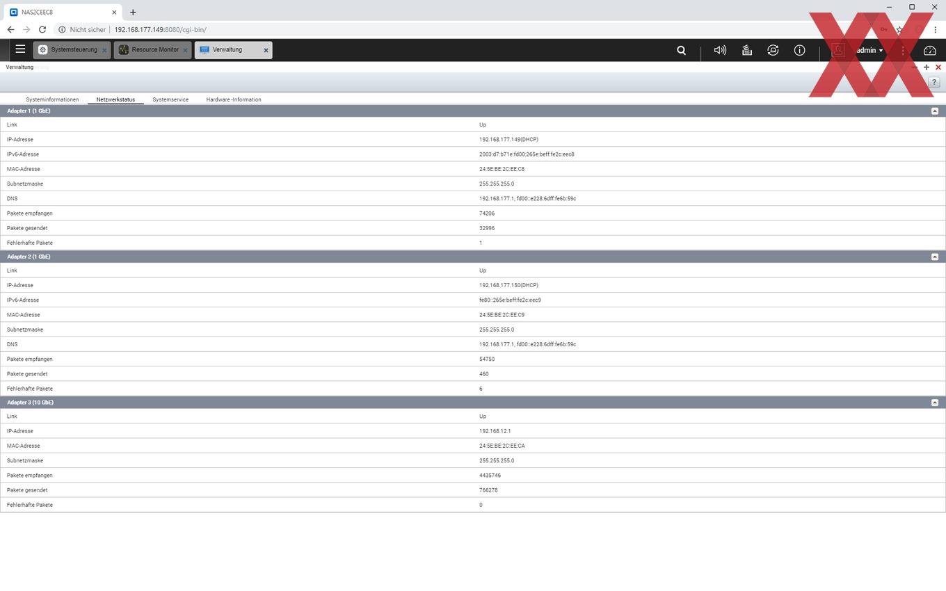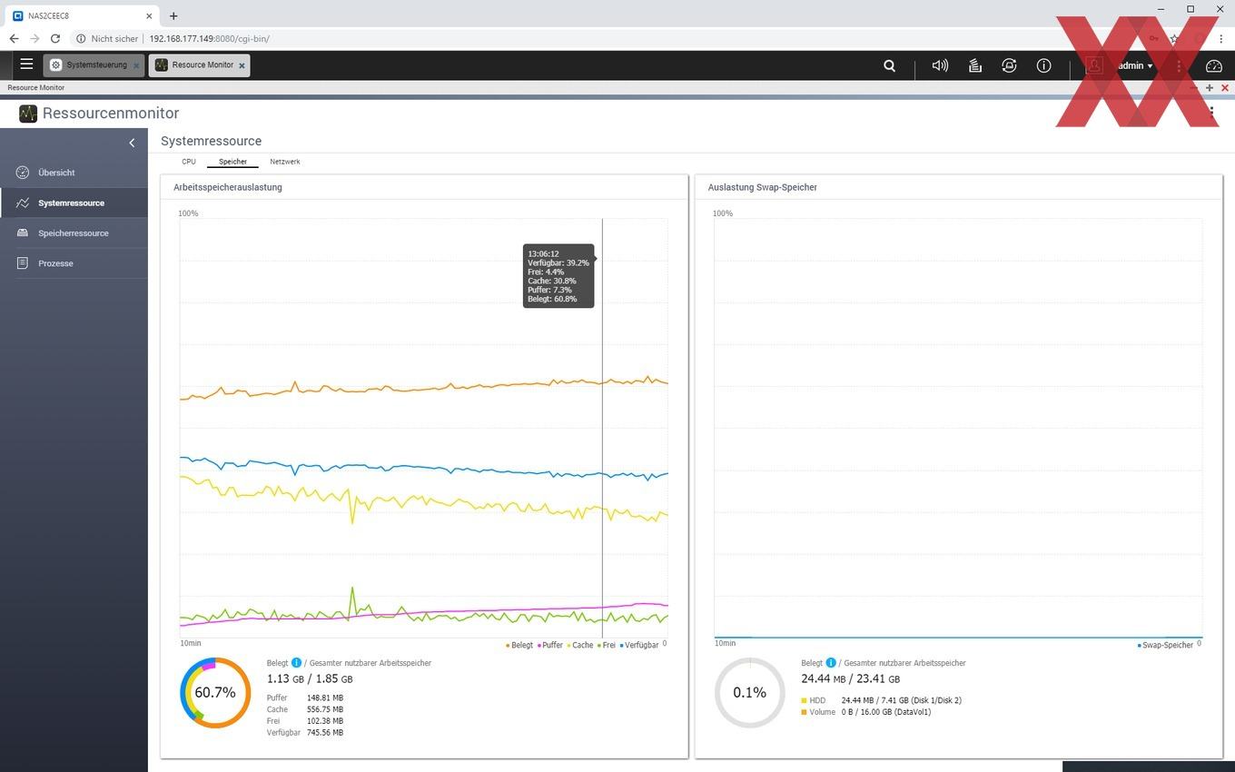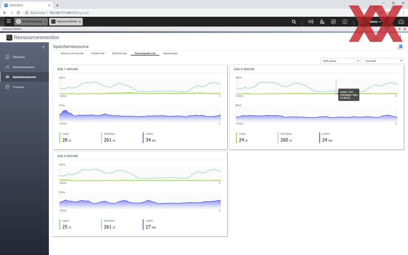 Der Ressourcenmonitor, welche die Aktivitäten und Auslastungen des NAS-Systems visualisiert, wurde mit jeder neuen QTS-Version weiterentwickelt und ist mittlerweile recht umfassend vom Inhalt und auch optisch attraktiver geworden. Die Übersichtsseite gibt einen guten Überblick über die Auslastung des NAS. In detaillierten Fenstern wird dann der jeweilige Verlauf der Systemressource je nach Typ in verschiedenen Formen dargestellt. Die Netzwerkauslastung wird beispielsweise sowohl global als auch aufgeschlüsselt nach den einzelnen Adaptern bzw. Bonds dargestellt. Auch die Aktivitäten der drei Laufwerke werden jeweils einzeln dargestellt. Eine Auflistung der aktiven Prozesse sowie deren Ressourcenverbrauch ist natürlich ebenfalls verfügbar.