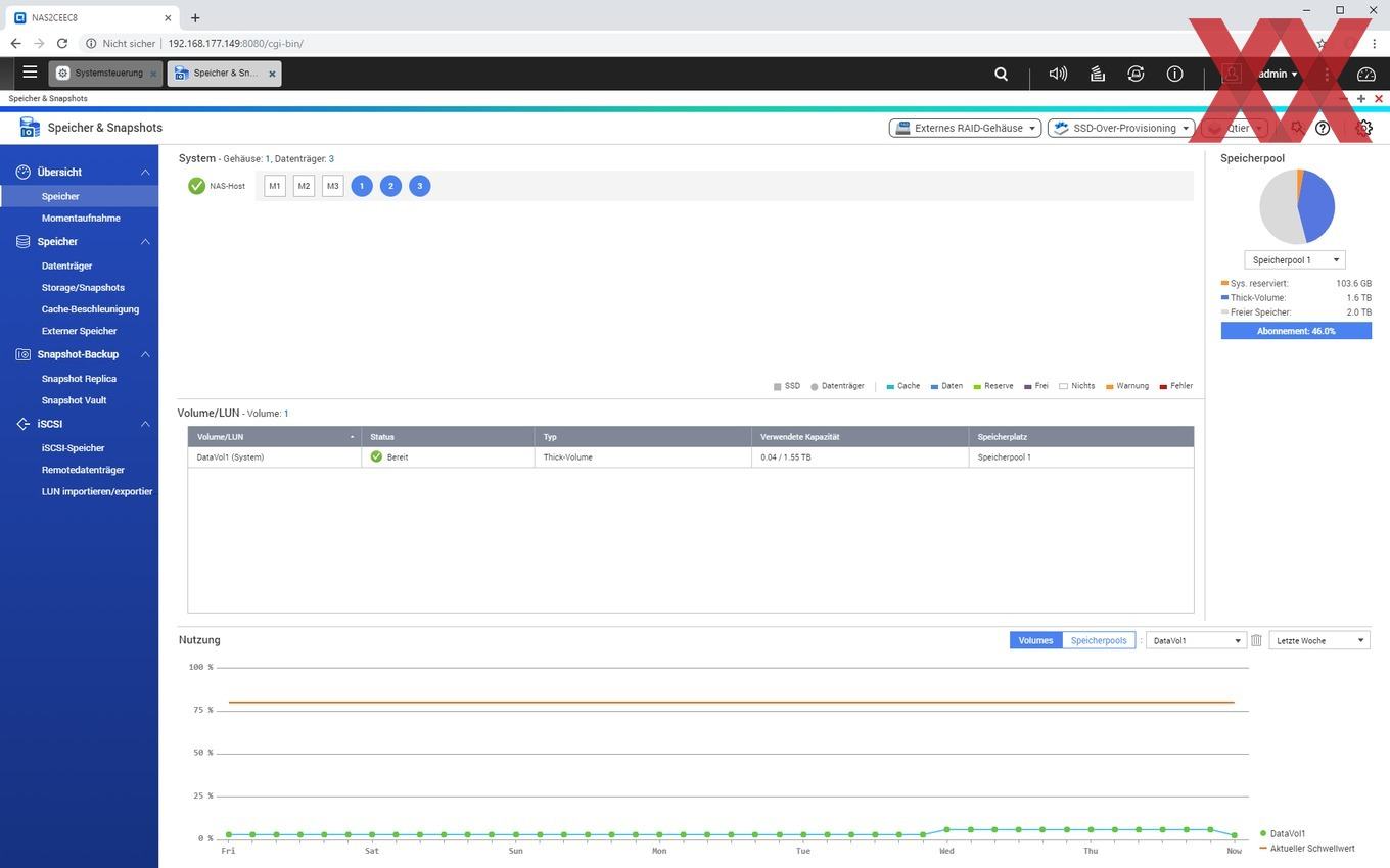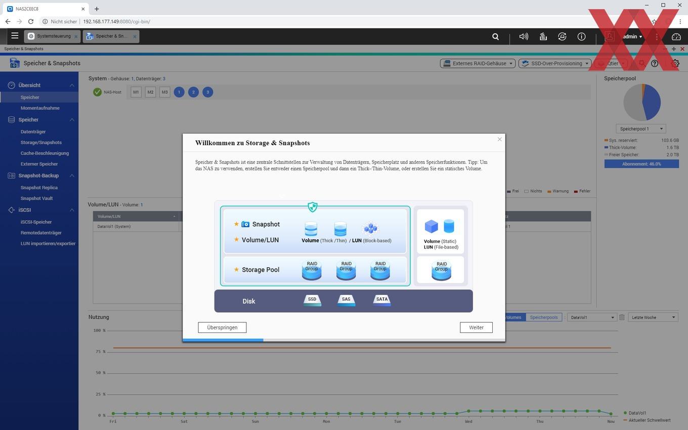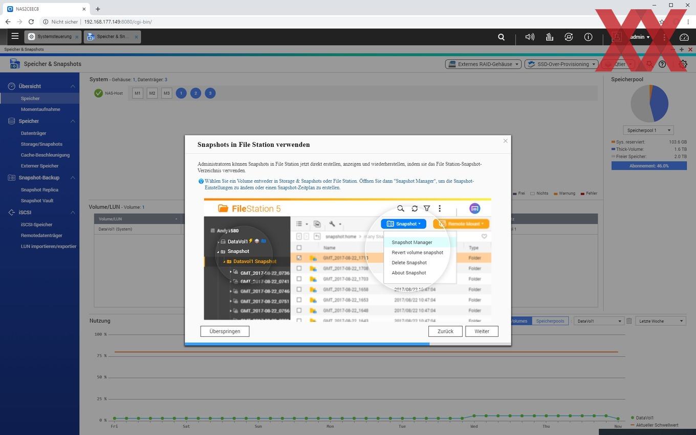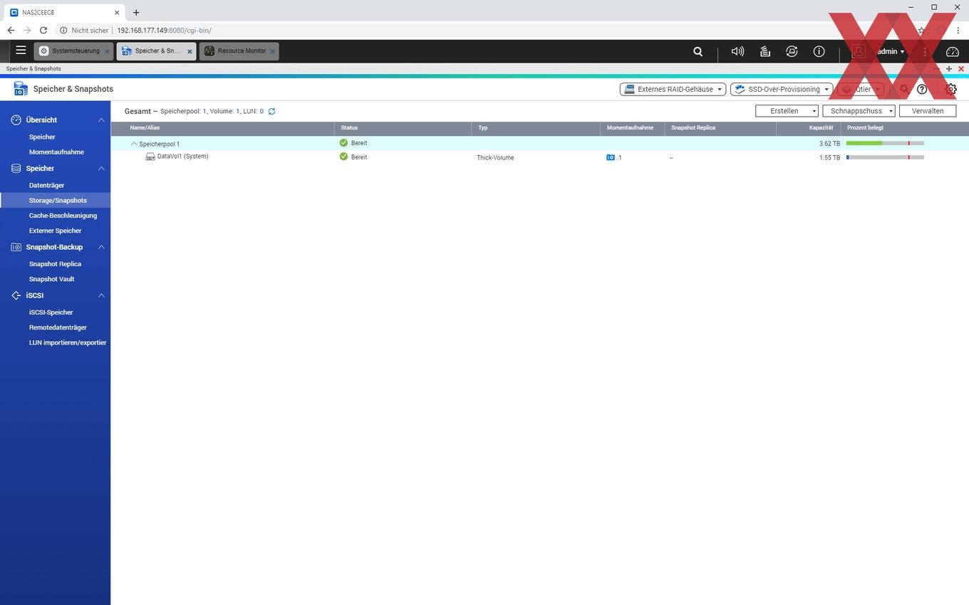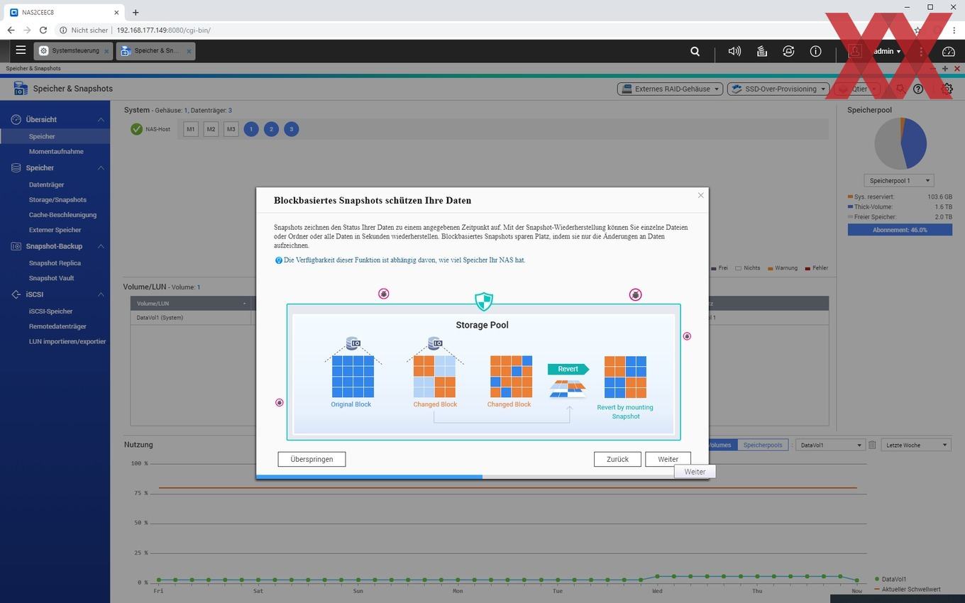 Um das Feature der "Snapshots", also der "Momentaufnahmen" nutzen zu können, ist es allerdings nötig, die Variante mit Speicherpool und Thick- und/oder Thin-Volumes zu verwenden.