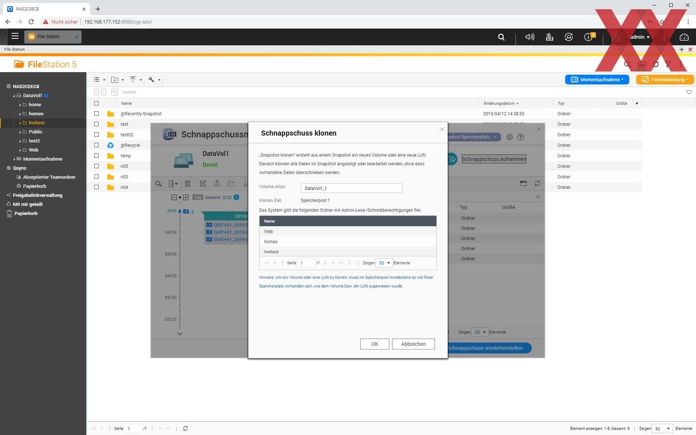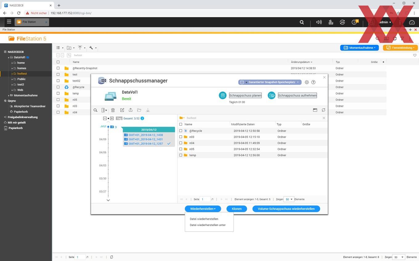Wer Snapshots anlegt, möchte sie vielleicht ja auch irgendwann nutzen. Dazu bestehen bei QTS Snapshot verschiedene Optionen. So kann das komplette Volumen auf den Stand zum Zeitpunkt einer Snapshot-Erstellung zurückgesetzt werden, was aber den Verlust von jeglichen danach gemachten Änderungen zur Folge hat. In der Praxis wird es vermutlich meist darum gehen, das Löschen oder Ändern einer Datei oder eines Ordners rückgängig zu machen. Dafür bietet sich die Option "Klonen" an, bei der aus dem Snapshot ein neues zusätzliches Volumen erstellt wird. Der User kann sich dann dort die benötigten Daten herausziehen und anschließend dann das aus dem Snapshot geklonte Volumen wieder löschen.