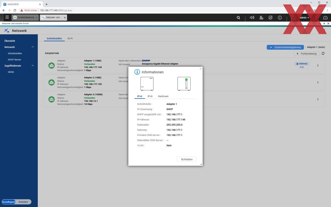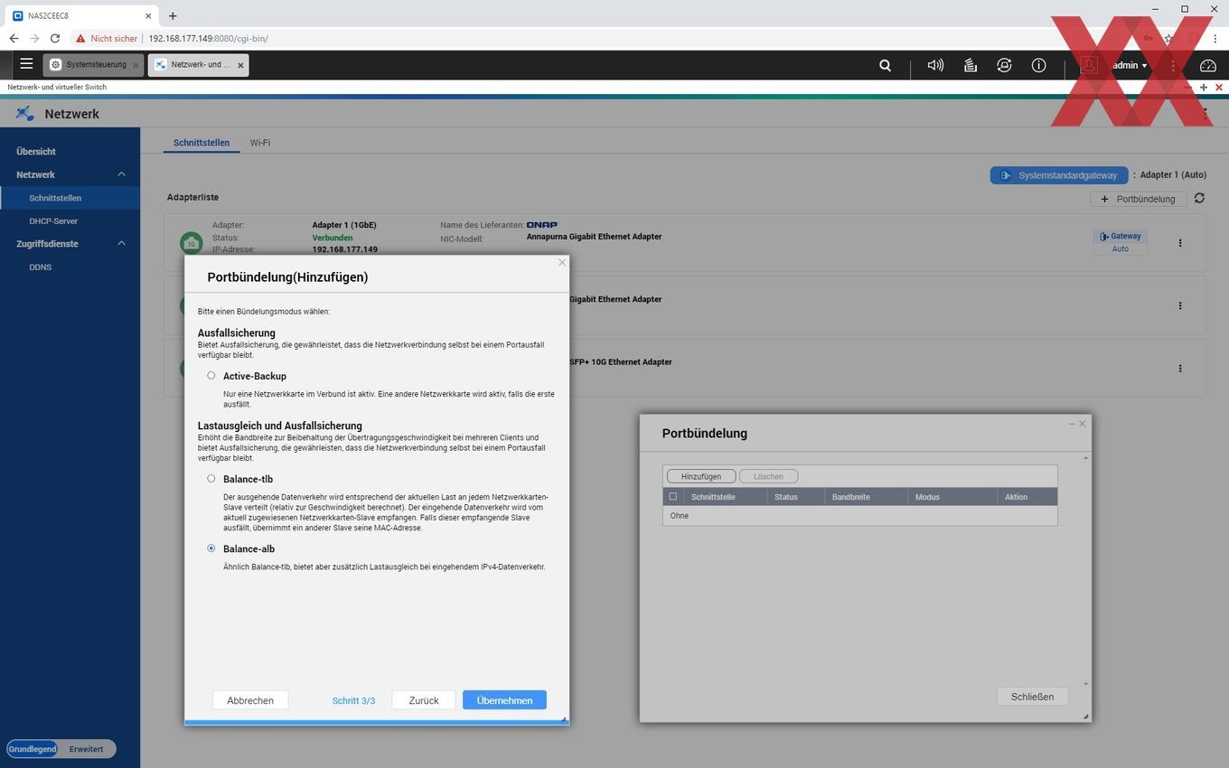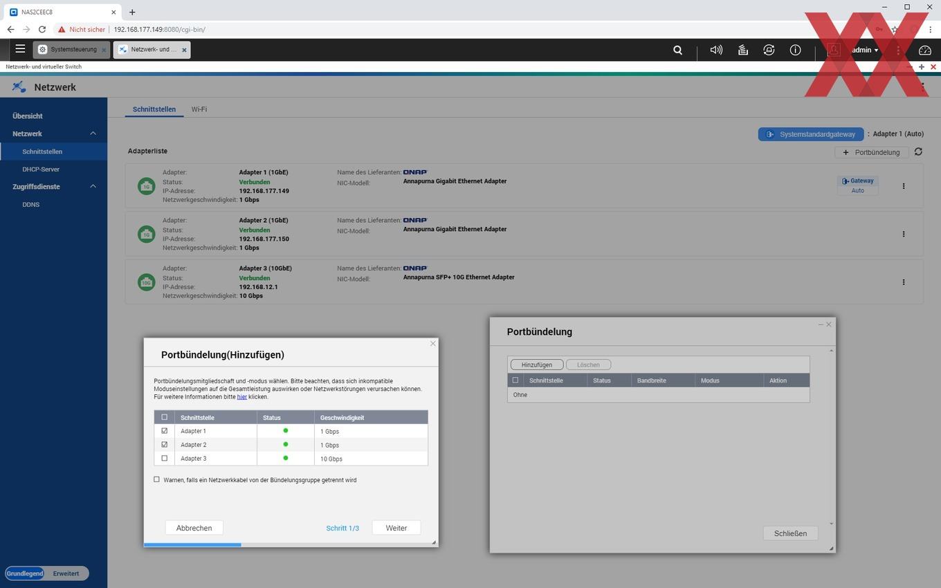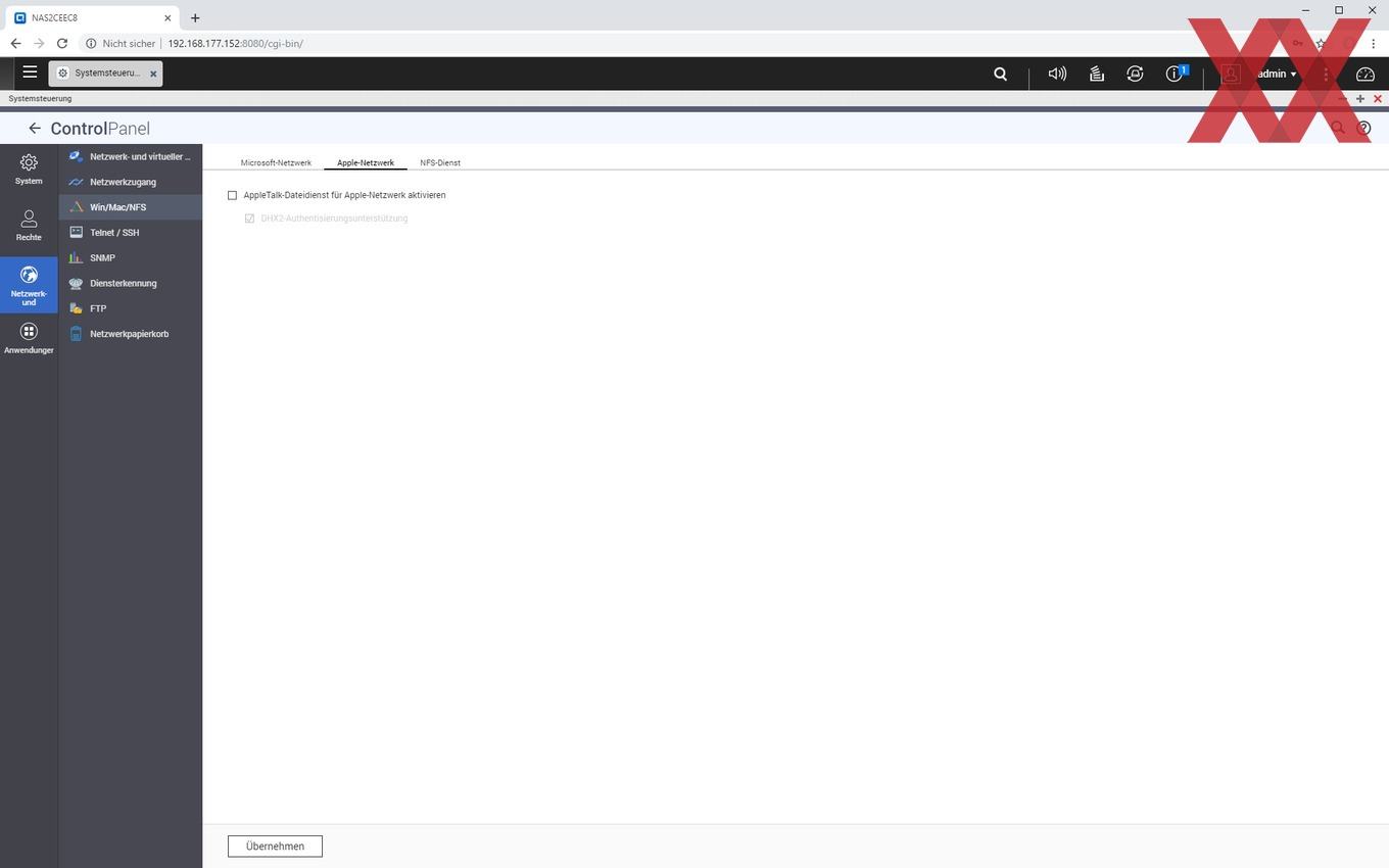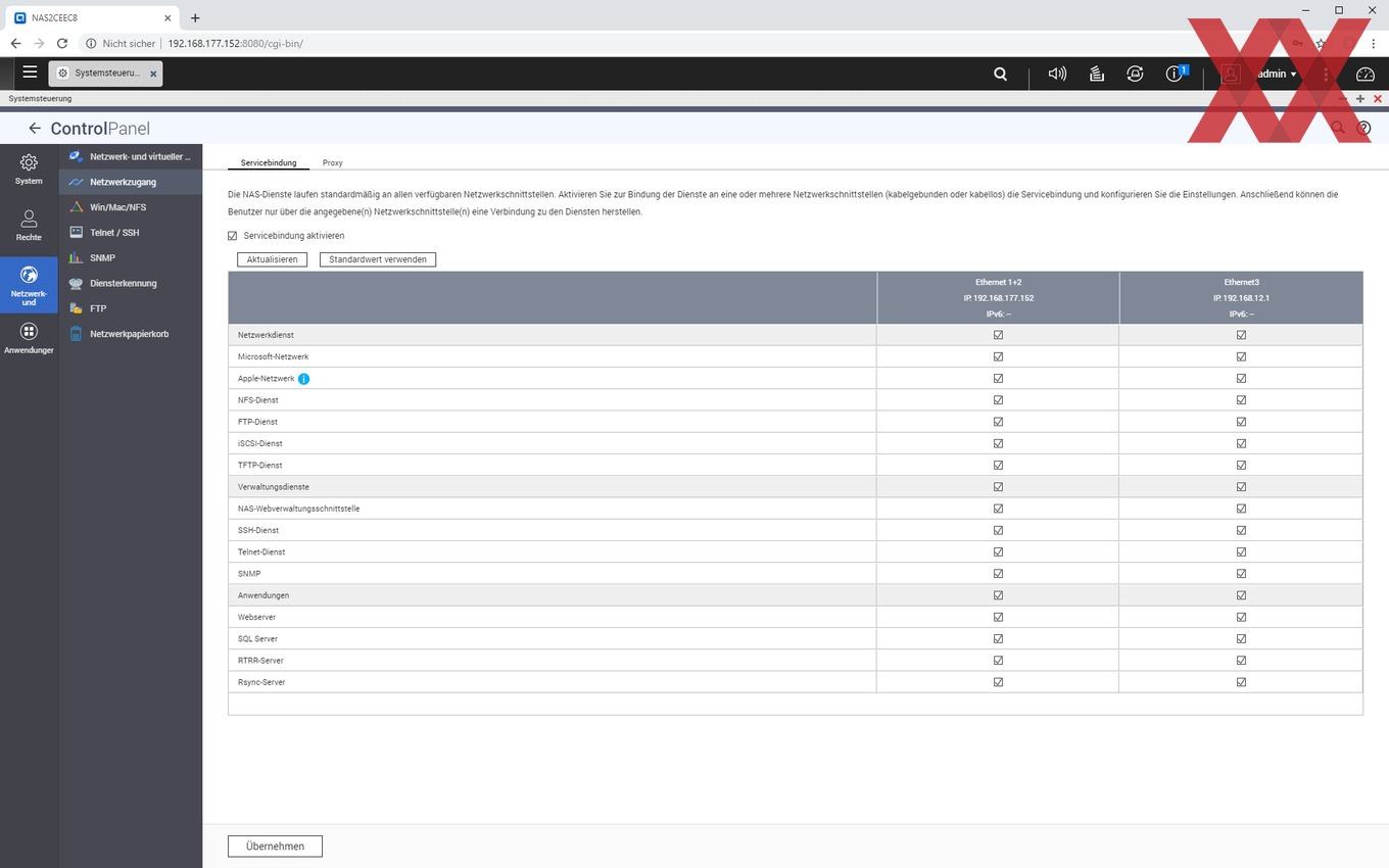 Unter "Rechte" erfolgt dann die Zugangssteuerung zu Gerät, Anwendungen und dem Speicherplatz. Im Wesentlichen geht es hier um Benutzer, Benutzergruppen und die Freigabeordner. Unter "Netzwerk und Dateiservices" wird die Konfiguration der Netzwerkschnittstellen sowie der verwendeten Kommunikationsprotokolle vorgenommen. Der vierte Punkt, "Anwendungen", ermöglicht die Konfiguration von bordeigenen Serverfunktionen wie DLNA, Web, Syslog oder TFTP.