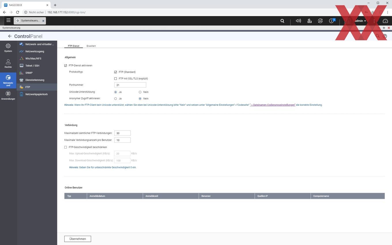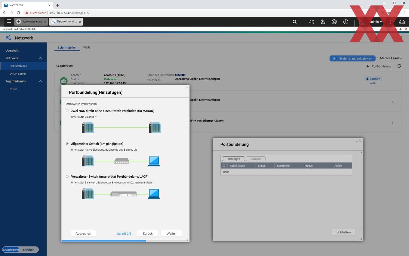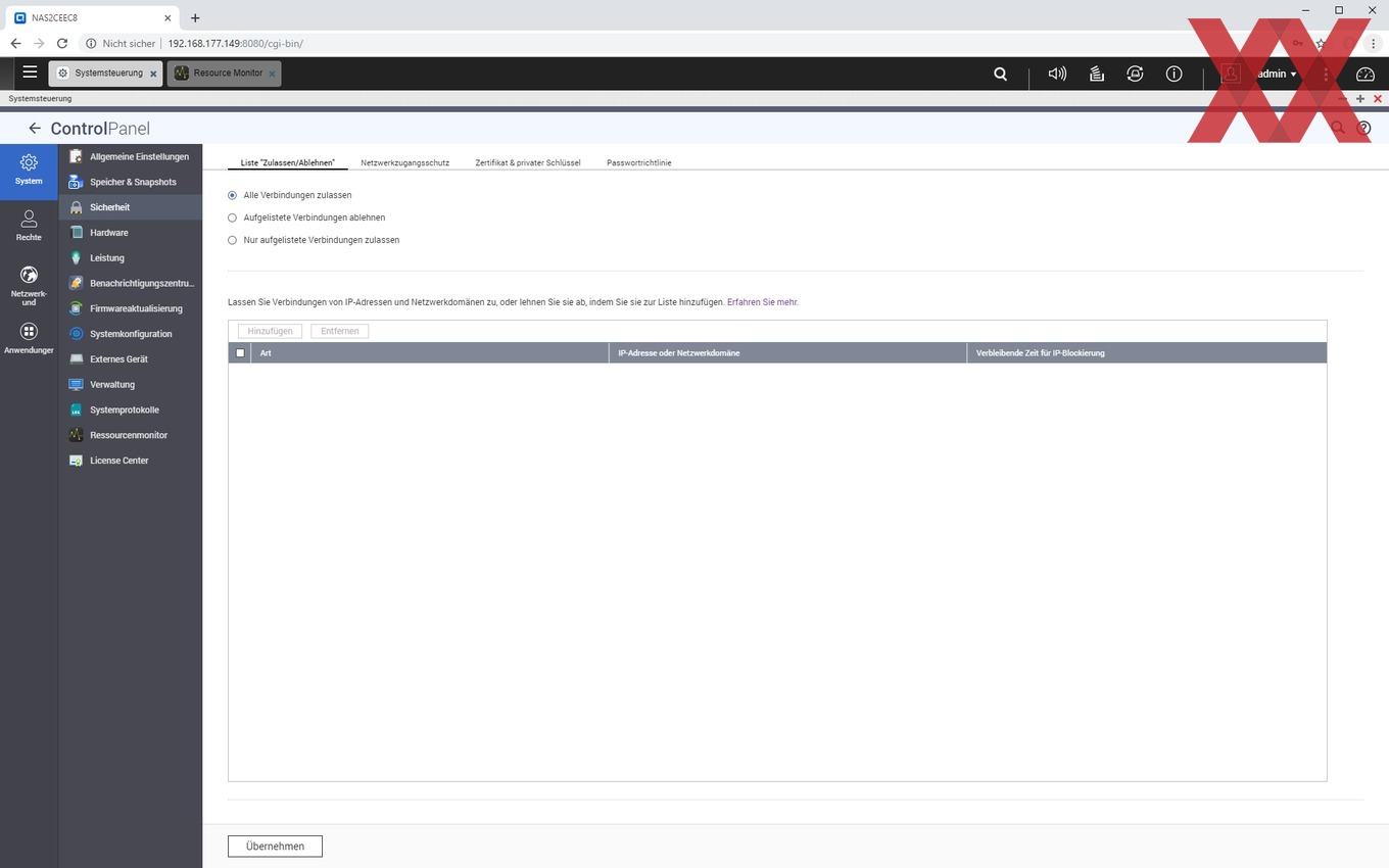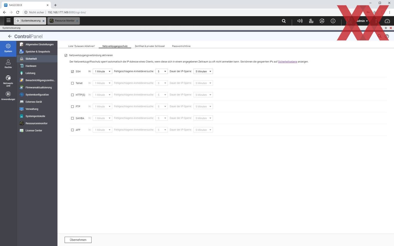 Unter "Rechte" erfolgt dann die Zugangssteuerung zu Gerät, Anwendungen und dem Speicherplatz. Im Wesentlichen geht es hier um Benutzer, Benutzergruppen und die Freigabeordner. Unter "Netzwerk und Dateiservices" wird die Konfiguration der Netzwerkschnittstellen sowie der verwendeten Kommunikationsprotokolle vorgenommen. Der vierte Punkt, "Anwendungen", ermöglicht die Konfiguration von bordeigenen Serverfunktionen wie DLNA, Web, Syslog oder TFTP.