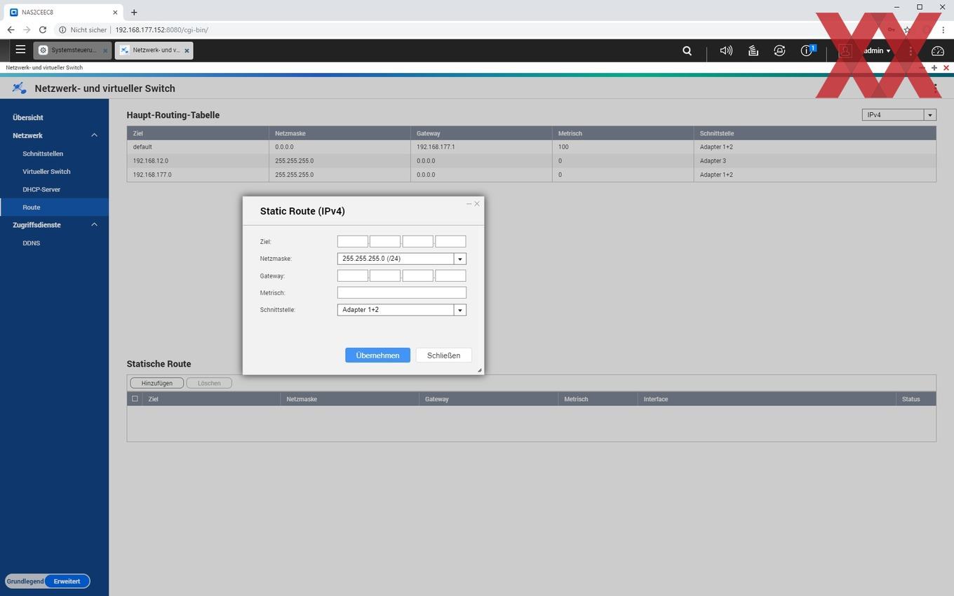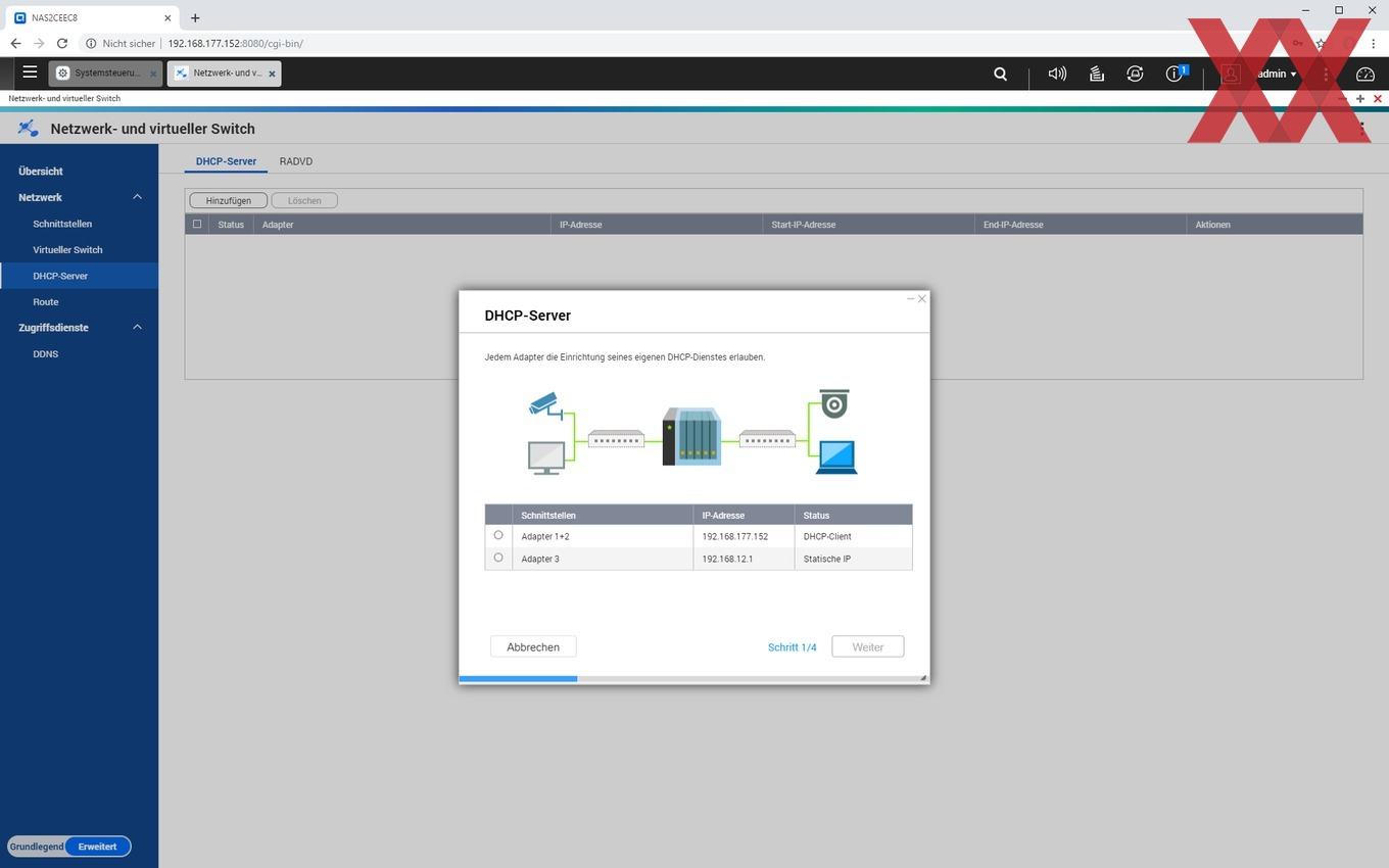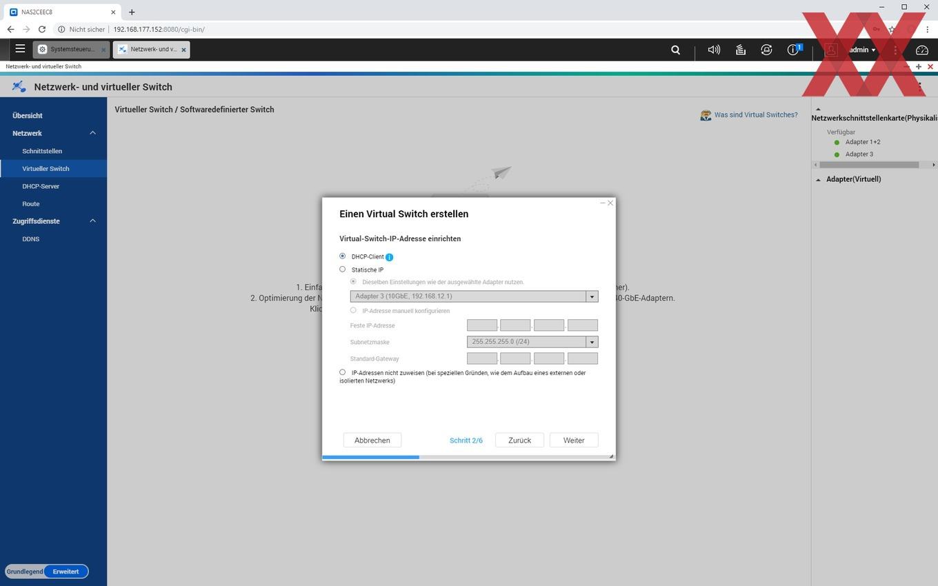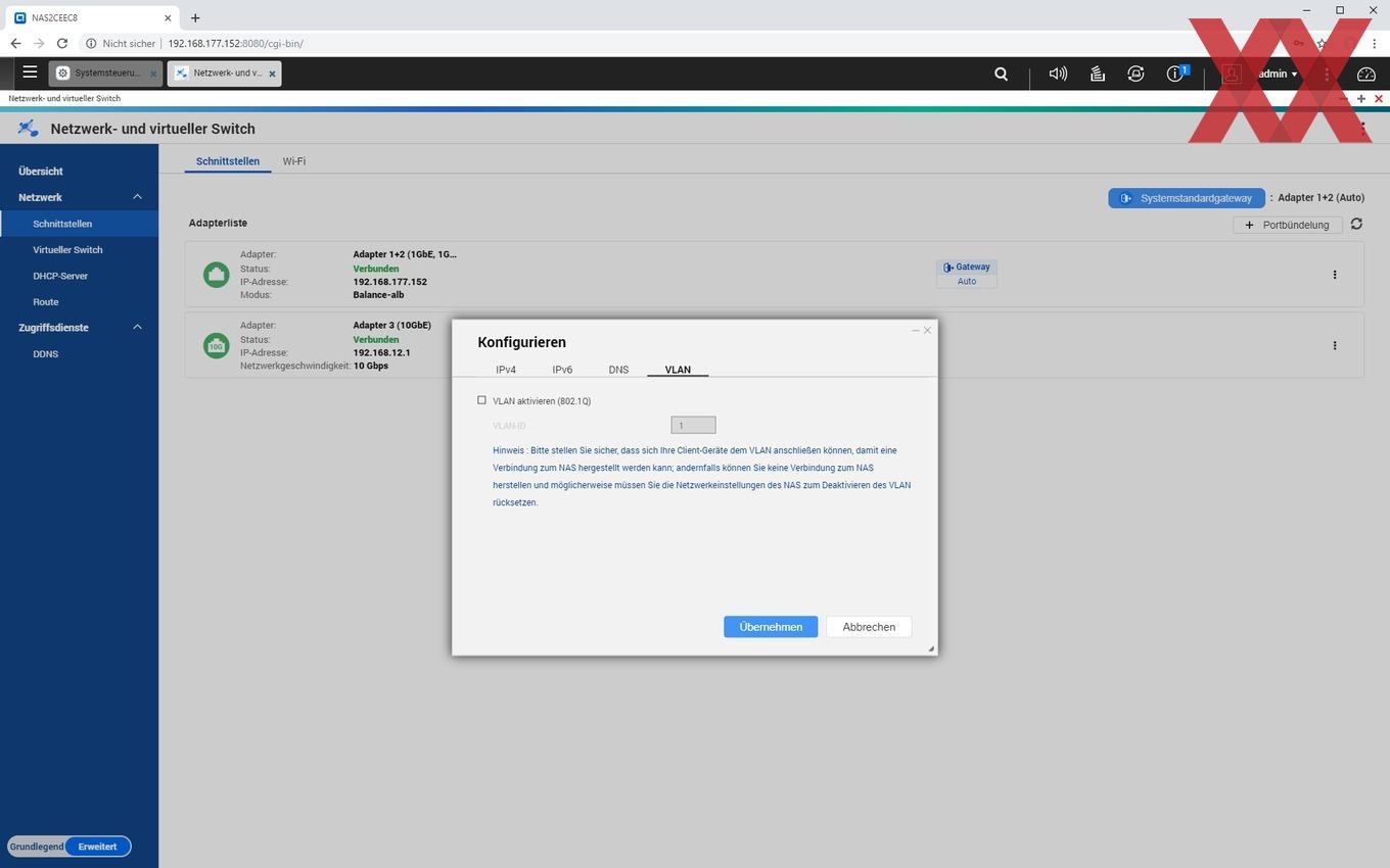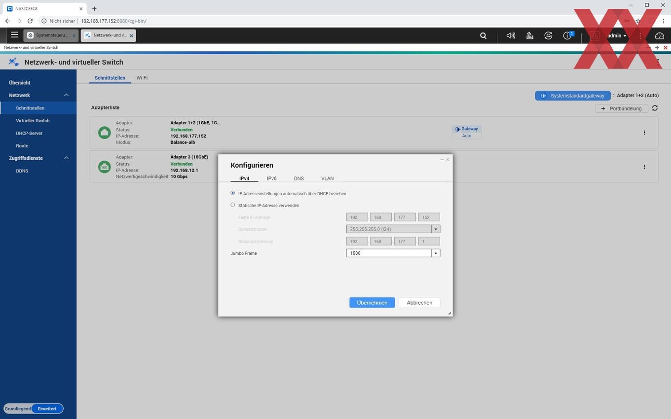 Unter "Rechte" erfolgt dann die Zugangssteuerung zu Gerät, Anwendungen und dem Speicherplatz. Im Wesentlichen geht es hier um Benutzer, Benutzergruppen und die Freigabeordner. Unter "Netzwerk und Dateiservices" wird die Konfiguration der Netzwerkschnittstellen sowie der verwendeten Kommunikationsprotokolle vorgenommen. Der vierte Punkt, "Anwendungen", ermöglicht die Konfiguration von bordeigenen Serverfunktionen wie DLNA, Web, Syslog oder TFTP.