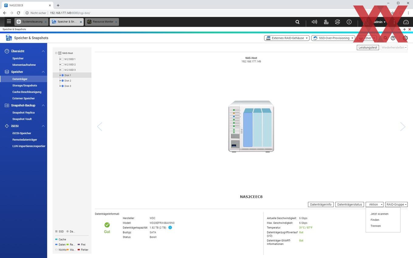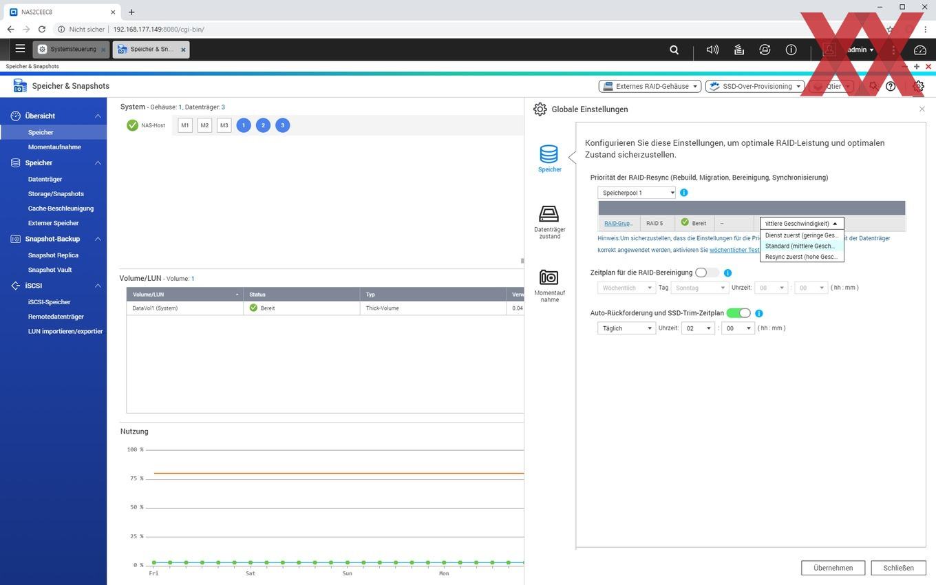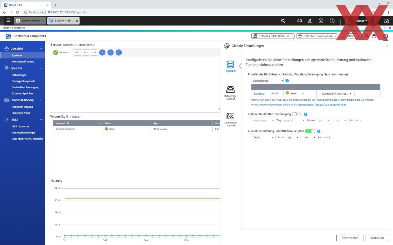 Auch wenn manches NAS mehr als Heimserver für alles Mögliche genutzt wird, so bleibt die Kernaufgabe eines NAS die Speicherung und Verwaltung von Daten. Die drei M.2-SATA-Slots in dem TS-332X sind wohl mehr als Beschleunigungsfeature zu sehen, denn sie tragen eher wenig zur Gesamtkapazität des NAS bei. Diese Aufgabe wird von den Festplatten in den drei 3,5-Zoll-Einschubslots übernommen. Der Sprung von zwei auf drei Laufwerke bietet auch neue Möglichkeiten bei der Speicherverwaltung.