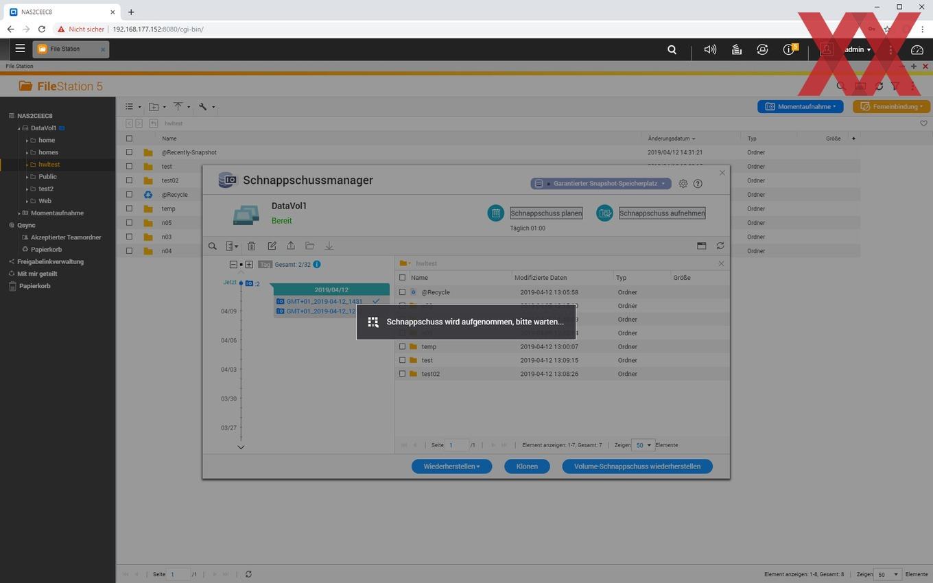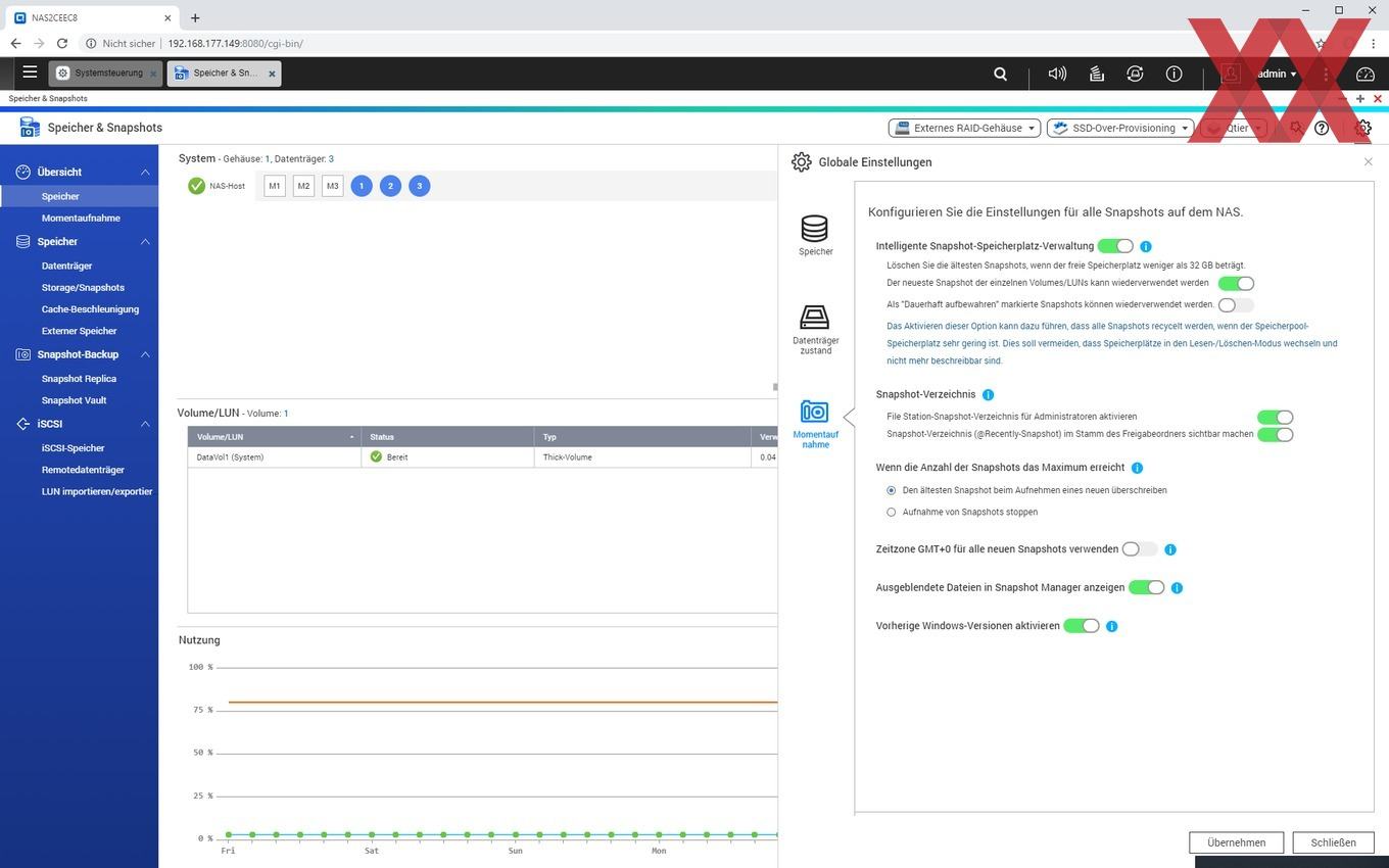 Die Verwaltung der Snapshot-Funktion hinsichtlich Speicherplatz und Replikation erfolgt unter Speicher & Snapshots in der Systemsteuerung. Die praktische Nutzung erfolgt dann über die File-Station. Hier können über den Schnappschussmanager entweder manuelle Sofortaufnahmen oder zeitgesteuerte Snapshots ausgelöst werden.