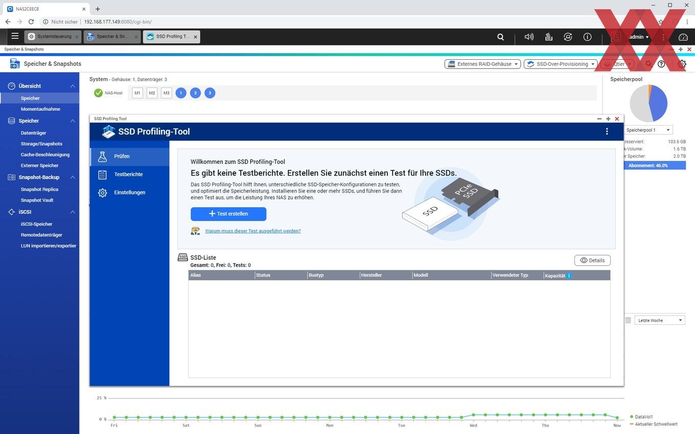 Freie Bereiche durch "Overprovisioning" erleichtern der SSDs das effiziente Management, z.B. beispielsweise durch einfaches Wegschreiben von neuen Daten anstelle einer Modifikation vorhandener Blöcke. Wenn allerdings bei schon gut gefüllten SSDs diese Reservebereiche unter Last volllaufen, bricht auch meist die Performance massiv ein. Einfache Consumer-SSDs haben meist recht kleine Reservebereiche, weil dieser Reserveplatz Geld bei der Produktion kostet, dessen Kapazität aber nicht an den Kunden verkauft werden kann. Bei SSDs für professionelle Anwendungen sieht das anders aus und dementsprechend weisen diese SSDs größere Reservebereiche auf, wodurch sie ihre Performance auch bei großer Last noch länger halten können. Indem nun QNAP bei den SSDs nur einen Teil der nominalen SSD-Kapazität nutzt, lassen sich auch Consumer-SSDs entsprechend "beschleunigen". QNAP hat dafür ein SSD Profiling Tool integriert, welches verschiedene Overprovisioning-Einstellungen (bis zu 60 %) testet und damit hilft, für das jeweilige SSD-Modell die beste Einstellung zu finden.