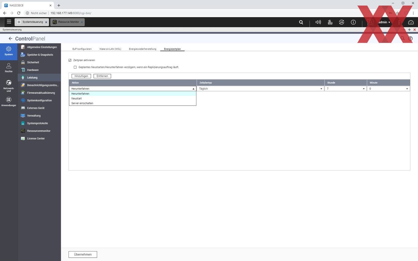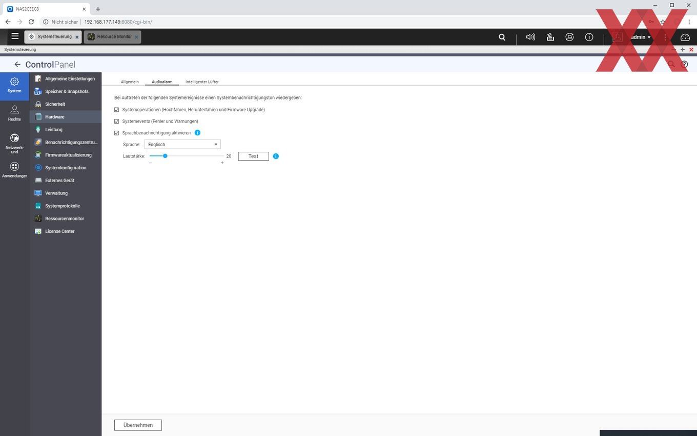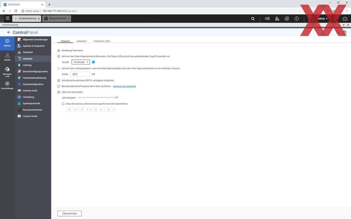 Die weiteren Optionen in der Systemsteuerung kennen wir bereits von anderen QNAP-Modellen, hier hat sich bei QTS 4.3.6 und dem TS-332X nicht viel Neues angesammelt. Wie bei allen modernen NAS-Systemen können auch beim TS-332X die LEDs - auch per Zeitplan gesteuert - gedimmt und es kann ein Ruhezustandsmodus für die Laufwerke eingestellt werden. Da im TS-332X ein kleiner Lautsprecher verbaut ist, können einige Systemmeldungen, welche sonst nur durch ein Piepsen signalisiert würden, auch per (englischer) Sprachausgabe ausgegeben werden.