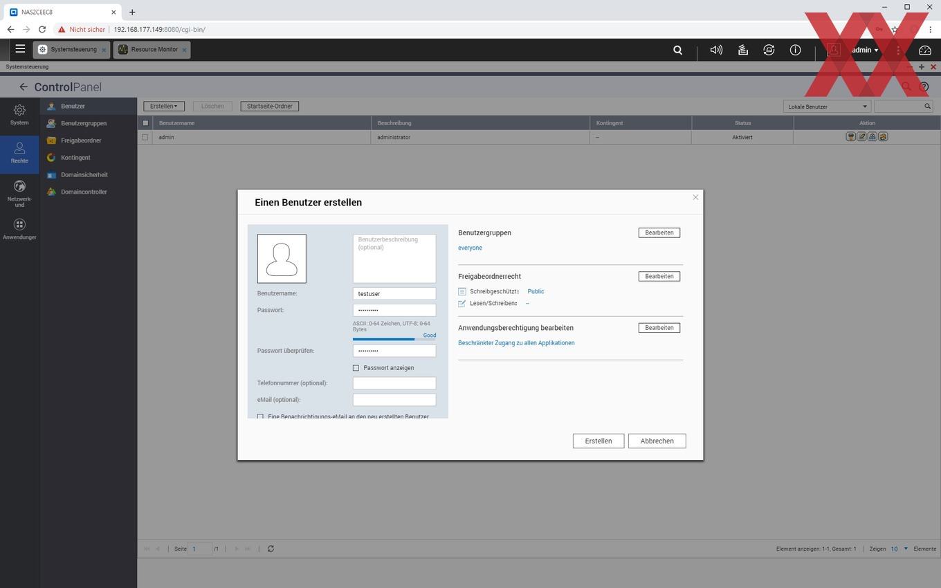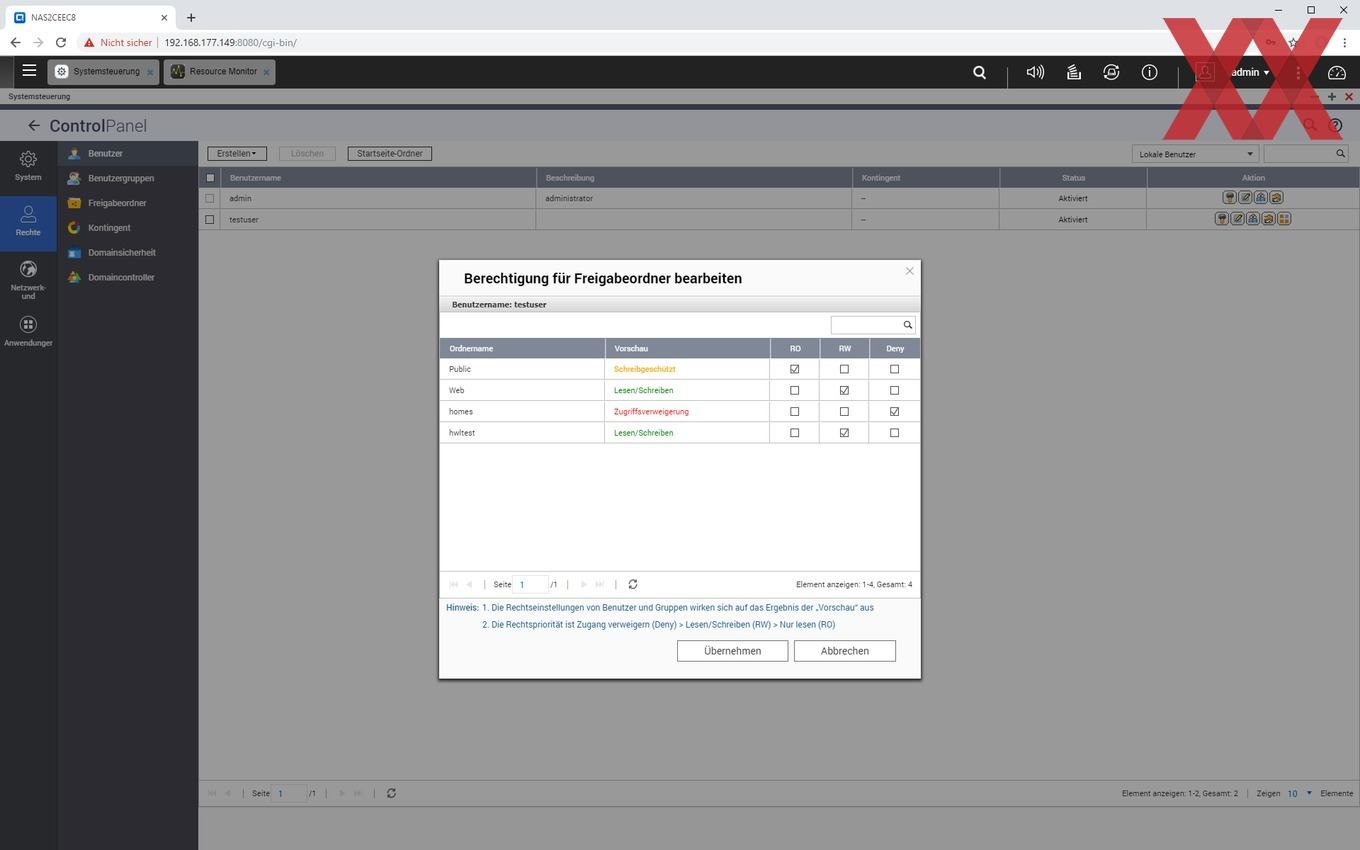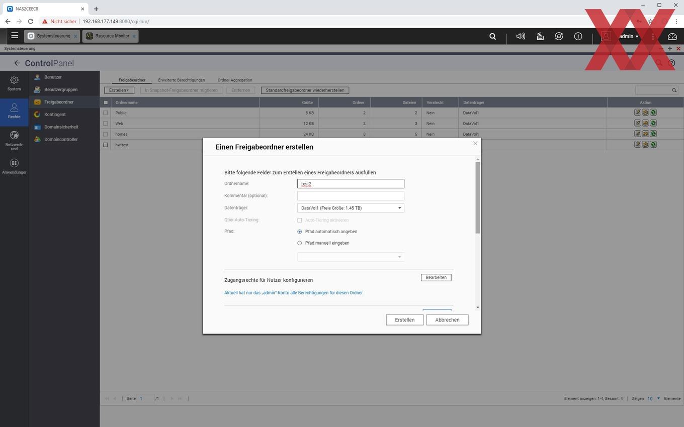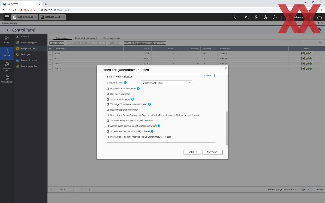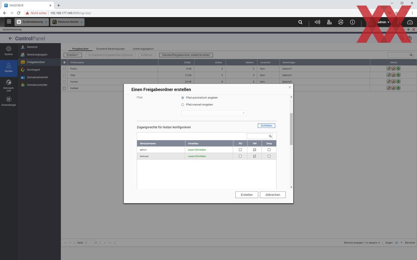 Bei der Rechteverwaltung für Benutzer und Freigabeordnern hat sich während der letzten QTS-Updates wenig verändert. Der Funktionsumfang ist gut, wenngleich wie allgemein bei QNAP etwas verschachtelter und etwas unübersichtlicher als z.B. bei Synology.