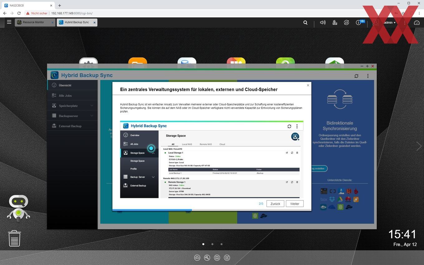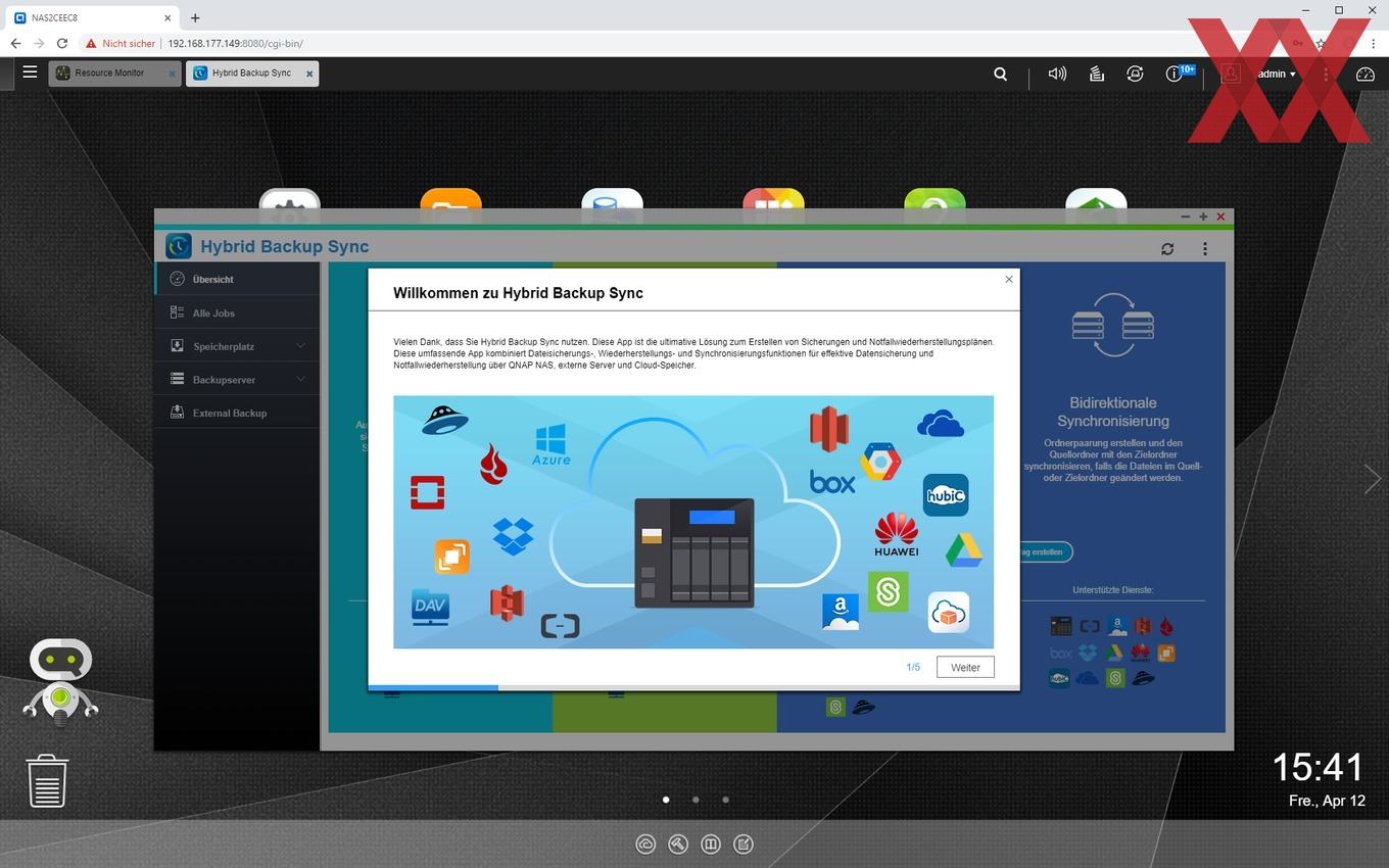 Die Einrichtung eines QNAP NAS erfolgt auf relativ einfachem Wege. Nach dem Einbau von einem oder zwei Laufwerken und dem Anschluss ans heimische Netzwerk startet man das Gerät. Nach einiger Zeit ist dann der Einrichtungsassistent über die IP des NAS im Browser aufrufbar. Welche IP das Gerät bekommen hat, lässt sich entweder im Webinterface des heimischen Routers oder über die QNAP Software "QFinder" herausfinden. QFinder ist ein Tool, welches QNAP auf seiner Website bereitstellt und das verschiedene Möglichkeiten bietet. Qfinder zeigt alle im Netzwerk gefundenen QNAP NAS an, ermöglicht ein schnelles Anmelden und auch die Einblendung eines Ressourcenmonitors auf dem Desktop des Rechners ist möglich.