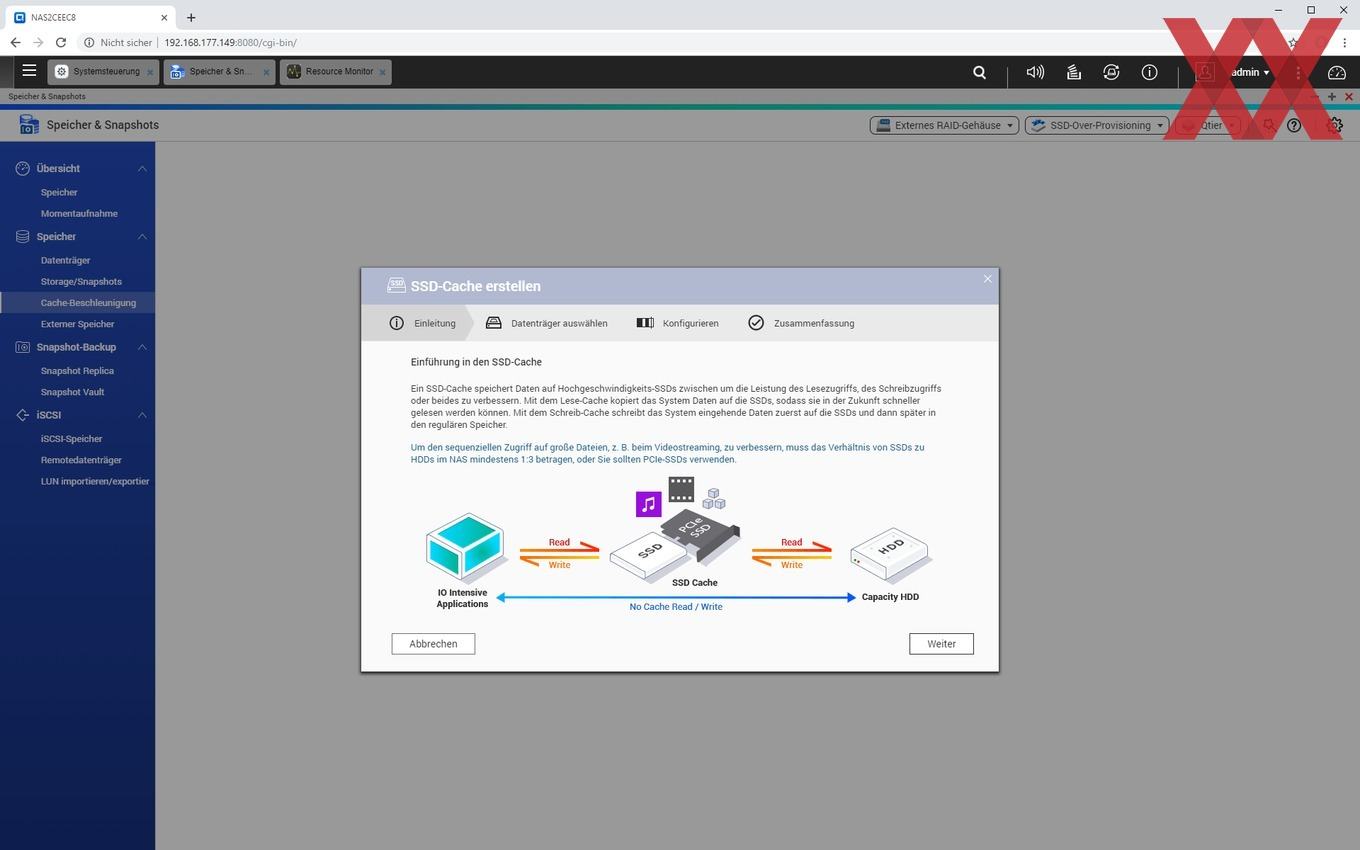 Ein weiteres Feature im Bereich der Speicherverwaltung ist der SSD-Cache. Das QNAP TS-332X ist hierfür dank seiner drei Slots für M.2-SATA-SSDs wie geschaffen. Mangels passender M.2-SATA-SSDs konnten wir die Funktion nicht selbst testen, aber dennoch ein paar Worte zu diesem Feature. Bei einem SSD-Lese-Cache werden häufig genutzte Daten auf den SSDs zwischengespeichert. Werden diese Daten erneut angefordert, können die Daten von den SSDs wesentlich schneller als vom Festplattenverbund geliefert werden. Ein Schreib-Lese-Cache ist ebenfalls möglich, benötigt aber aus Gründen der Datensicherheit zwei SSDs, aber kann auch das Schreiben von Daten auf dem NAS beschleunigen. Dabei gilt die Grundregel, dass insbesondere der Zugriff auf kleine und verteilte Daten beschleunigt wird. Typische Datenbankanwendungen werden beispielsweise deutlich beschleunigt, wohingegen der sequentielle Transfer von großen Datenmengen nicht von einem Cache profitiert.