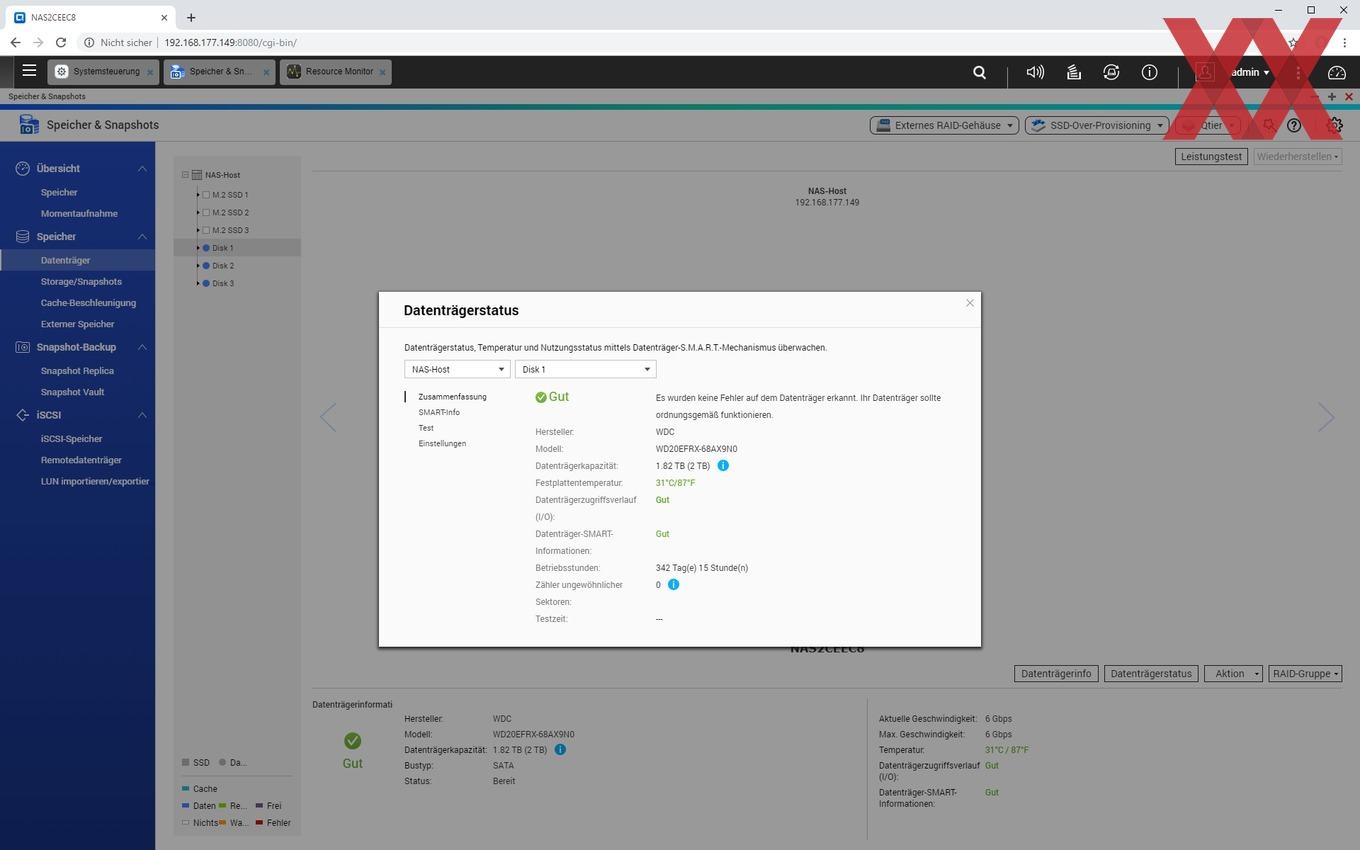 Wie auch bei anderen NAS-Systemen hat QNAP im Bereich der Speicherverwaltung eine Übersicht über die verbauten Laufwerke bzw. vorhandenen Slots integriert, welche auch einen Blick auf die "Gesundheit" der Laufwerke möglich ist, inklusive automatisierten Prüfungen und Anzeige der SMART-Daten. Seit kurzem (mit QTS 4.3.5) unterstützt QNAP auch das Ironwolf Health Management von Seagate.