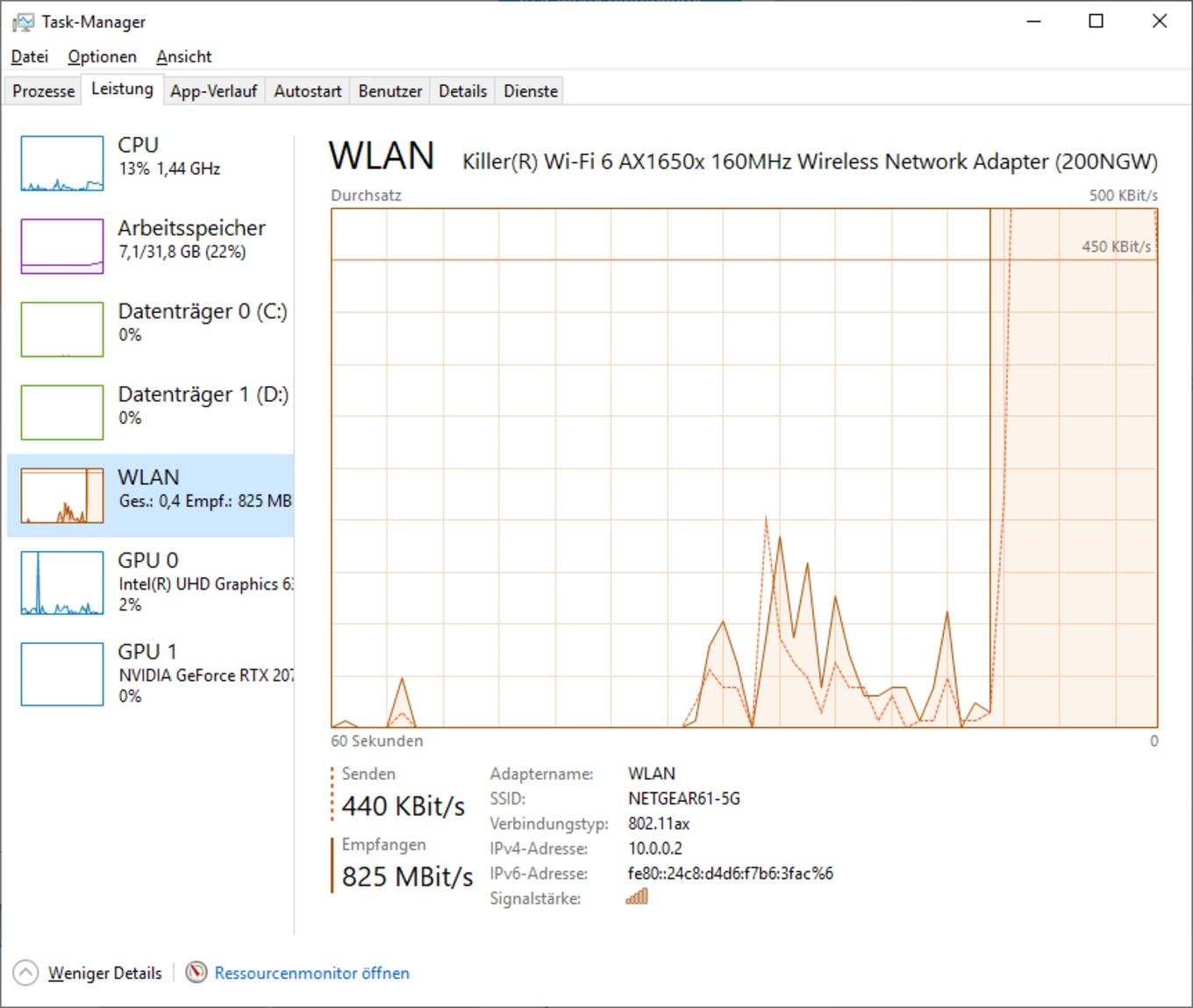 Im Zusammenspiel mit dem Netgear Nighthawk AX12 konnten wir mit dem Killer Wi-Fi 6 AX1650 Modul problemlos Datenraten von 825 MBit/s und mehr erreichen. Allerdings ist dies nur auf kurze Distanz der Fall, bei der maximal eine Mauer zwischen Router und Client sein darf. Mehr dazu aber später in den Benchmarks.