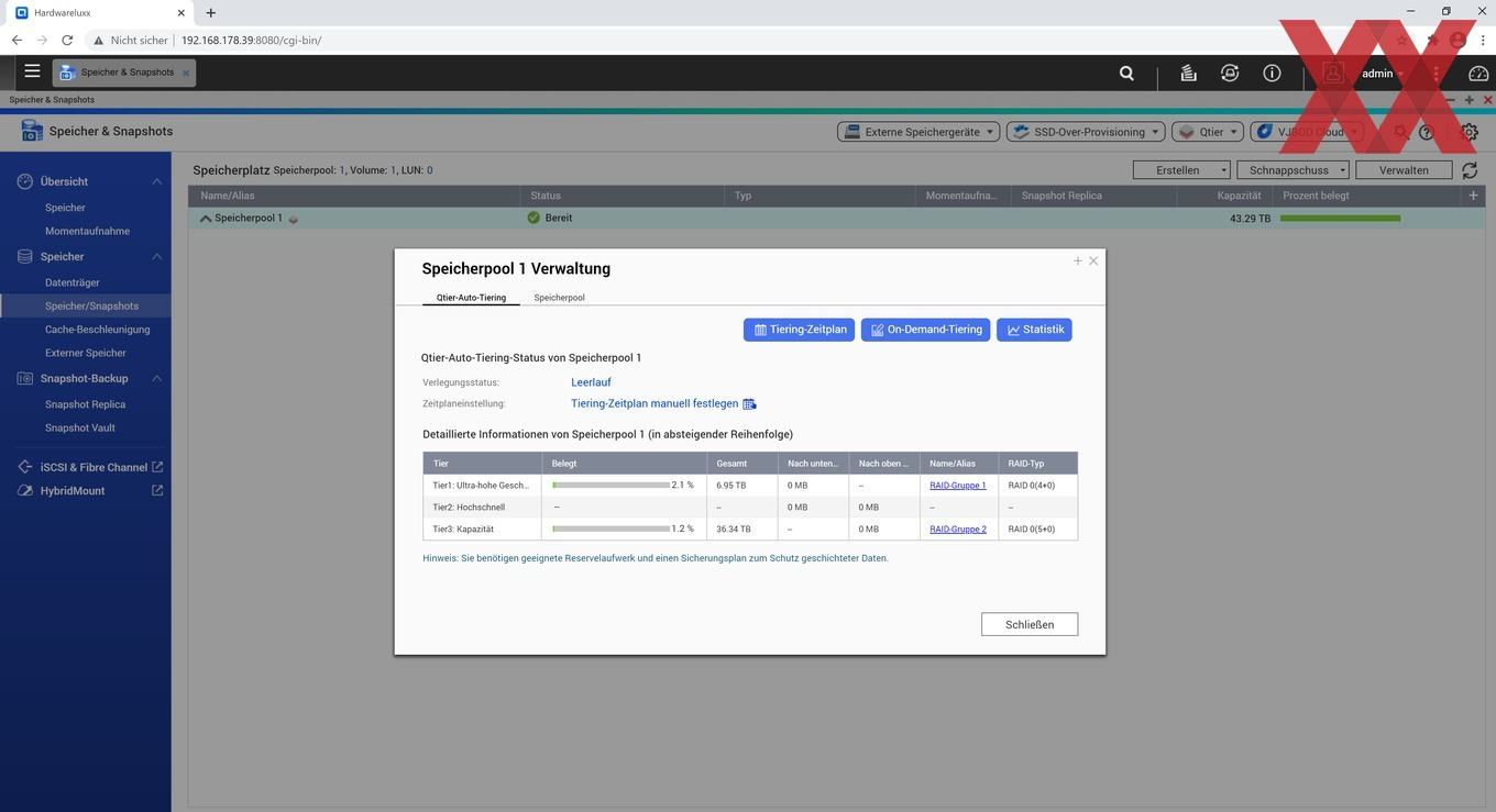 Unter Verwaltung des entsprechenden Pools bekommt man angezeigt, in welchem Bereich sich die "Hot" und "Cold" Daten befinden. Da wir nur SSDs (Tier1: Ultra-hohe-Geschwindigkeit) und HDDs (Tier3: Kapazität) verwenden, bleibt Tier2: Hochschnell leer. Tier2 würde nur aktiv werden, wenn SAS-Laufwerke zum Einsatz kämen.