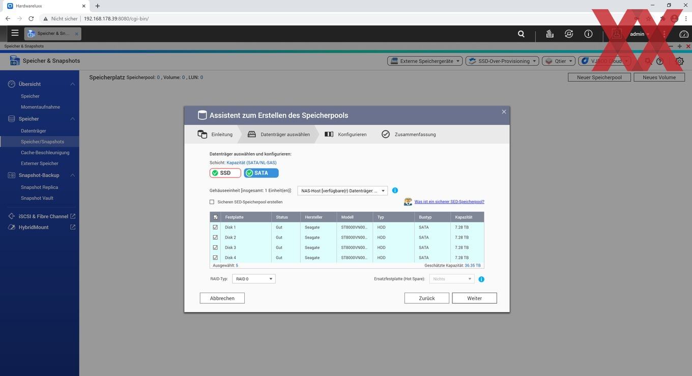Zunächst muss man auf den Knopf "SSD" klicken und die entsprechenden Datenträger auswählen, danach das Gleiche mit den HDDs. Man wählt seinen RAID-Typen aus und gibt gegebenenfalls noch einen oder mehrere Ersatzdatenträger (Hot Spare) an.