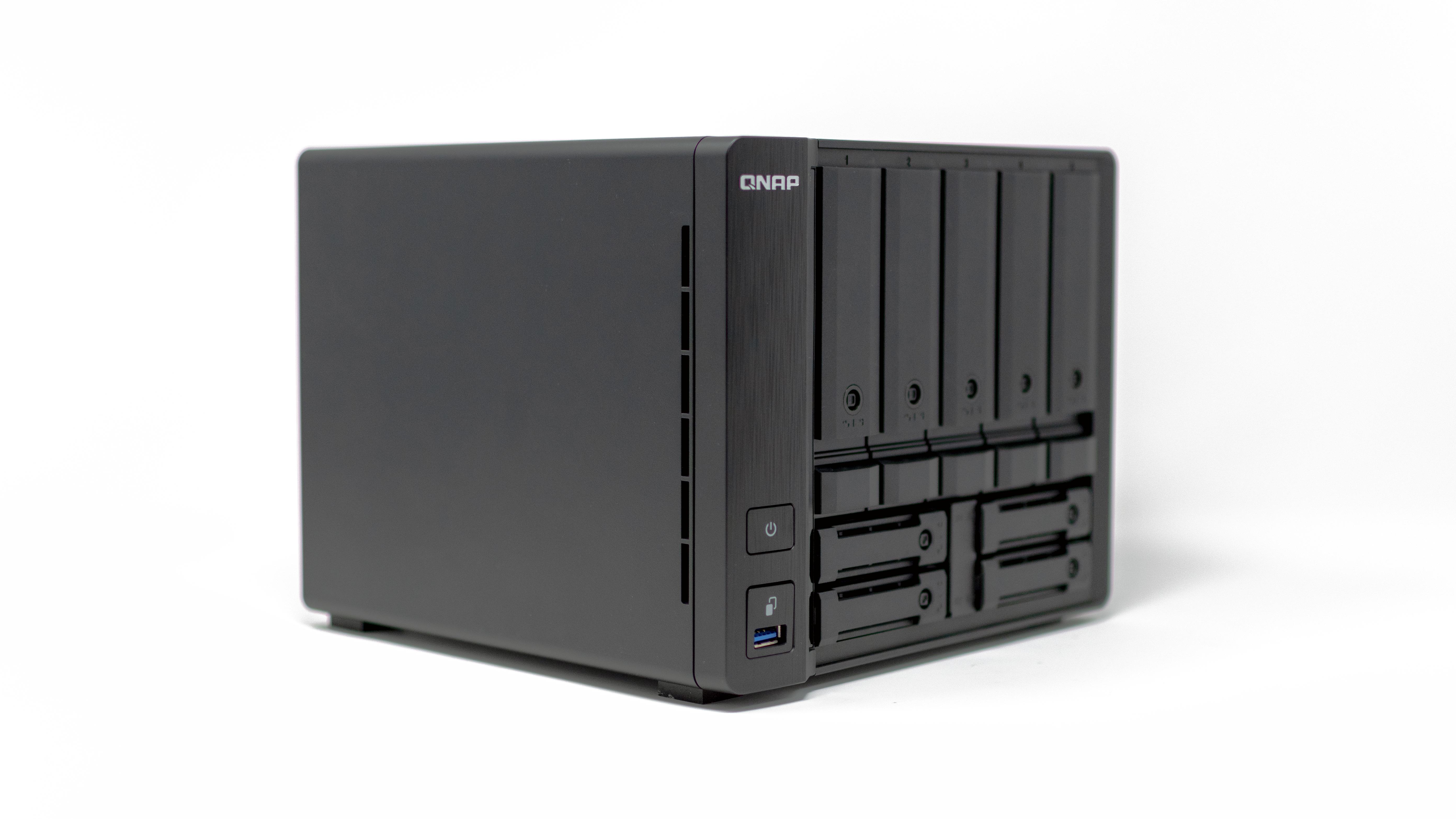 Die Firma QNAP macht mit der Turbo Station TS-932PX-4G fast alles richtig. Sie bietet ein 9-Bay-NAS mit einem Gesamtvolumen von nur 9,2 Litern, welches bis zu fünf 3,5-Zoll- und vier 2,5-Zoll-Laufwerke aufnehmen kann. Darüber hinaus sind ab Werk bereits jeweils zwei 2,5GbE-RJ45- und 10GbE-SFP+-Anschlüsse verbaut, die Portbündelung oder Failover bieten, was es in dieser Preisklasse bei keinem anderen Hersteller gibt. Der verwendete 140-mm-PWM-Lüfter von der Firma Power Logic macht einen ordentlichen Eindruck, wenngleich er etwas leiser sein könnte. Sobald aber Hochleistungs-Festplatten wie die von uns verwendeten Seagate IronWolf 8 TB ST8000VN022 eingebaut sind, spielt die Lautstärke des Lüfters ohnehin keine Rolle mehr. Im reinen SSD-Betrieb hört man diesen mit einem leichten Luftrauschen raus.