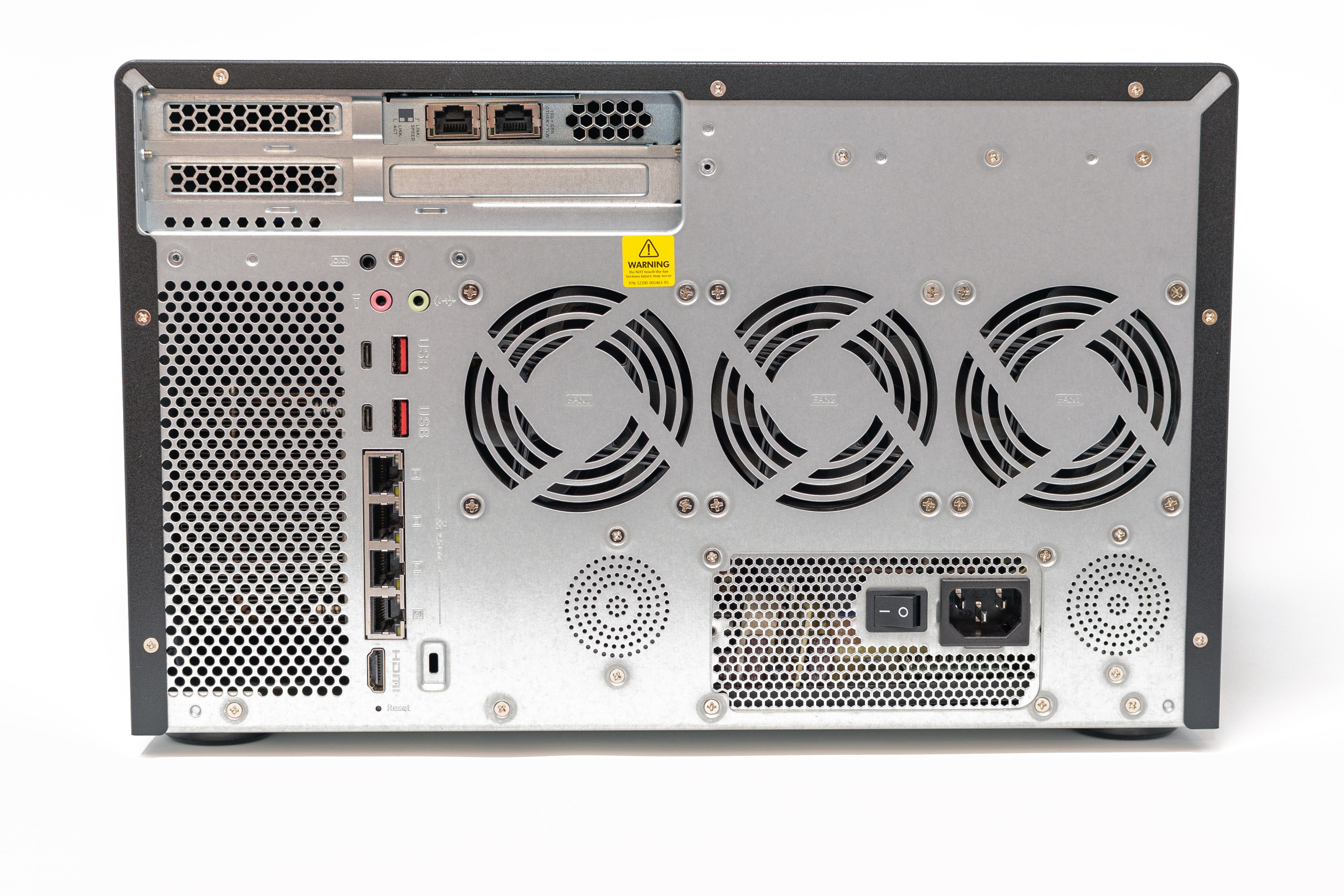 So unscheinbar die Front wirkt, so vollgepackt mit einer Vielzahl an Anschlussmöglichkeiten zeigt sich die Rückseite der QuTS hero TVS-h1288X-16G. Oben links befinden sich die drei PCIe-Erweiterungsslots, wovon einer bereits durch die 10GbE-Karte belegt ist. Direkt darunter liegen die Audioeingänge und -ausgänge zum Anschluss von Lautsprecher und Mikrofon. Vier der fünf USB-3.2-Gen-2-Anschlüsse mit einer Übertragungsrate von bis zu 10Gbps befinden sich zwischen dem Luftaustrittsgitter des Prozessors und der drei Gehäuselüfter. Insgesamt werden vier 2,5GbE-Anschlüsse, sowie der HDMI-1.4b-Ausgang direkt von der Hauptplatine zur Verfügung gestellt. Unten rechts befinden sich das 550 W starke SFX-Netzteil und die beiden internen Lautsprecher.
