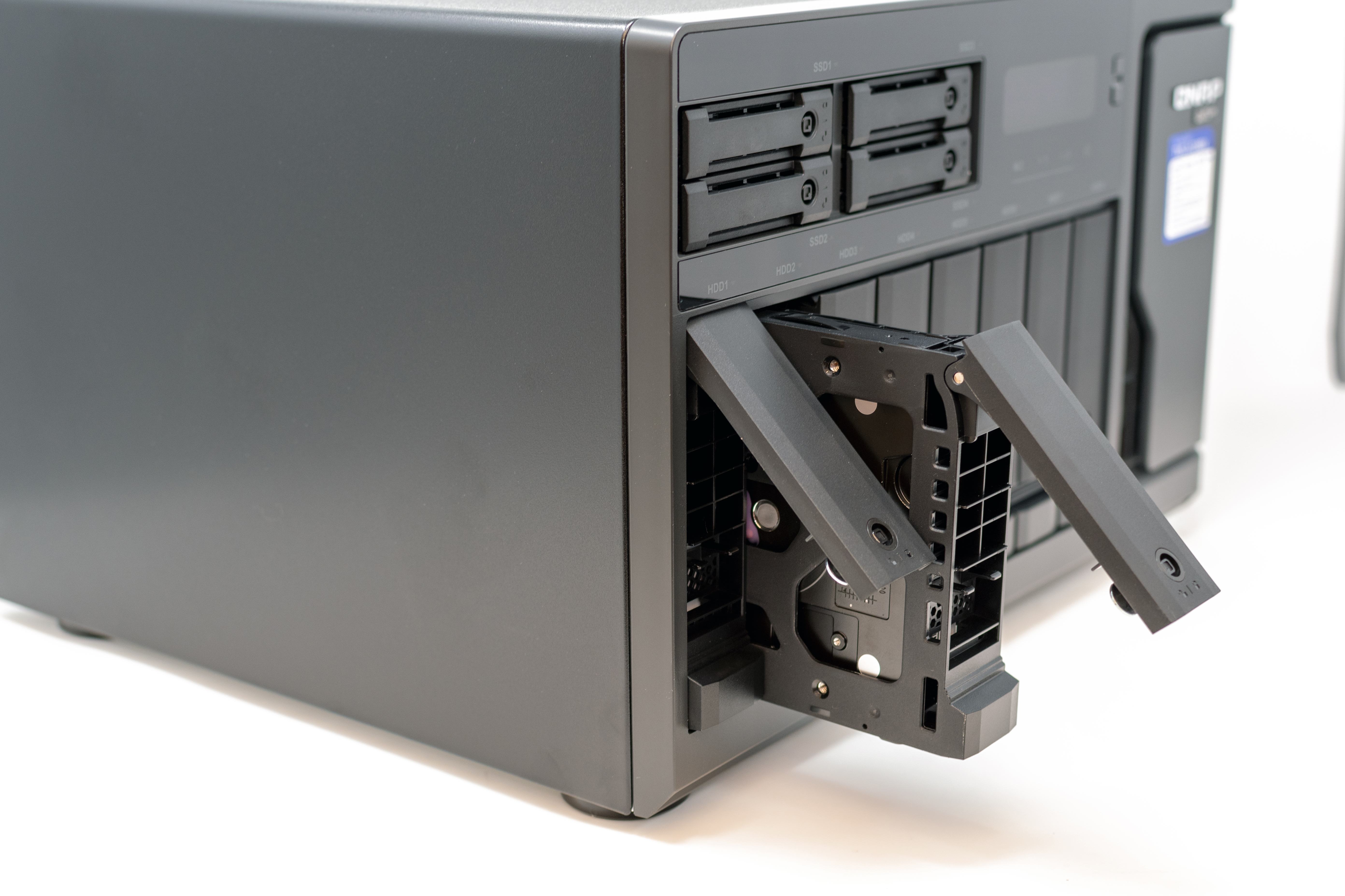 Um die Laufwerkseinschübe der QuTS hero TVS-h1288X-16G herausnehmen zu können, muss der optional verschließbare Klappmechanismus von unten mit dem Finger nach vorne gezogen werden. Dadurch wird die obere Verriegelung geöffnet und man kann mit einem leichten Zug den Einschub herausziehen.