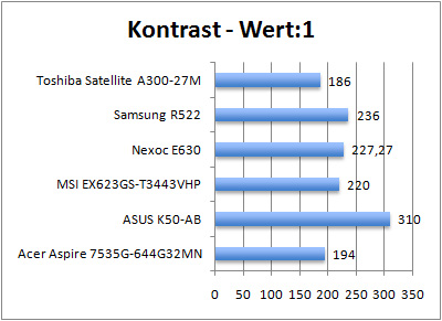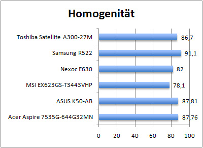 Während die maximale durchschnittliche Helligkeit mit einem Wert von 214 cd/m² respektive einer maximalen Helligkeit von 244 cd/m² liegt, zeigt sich das verbaute Panel hinsichtlich der Homogenität nicht von seiner besten Seite. Mit einer Ausleuchtung von gerade einmal 78,10 Prozent liegt es recht deutlich auf dem letzten Platz. Besonders Samsungs R522 kann sich hier erneut deutlich absetzen. Einschränkungen müssen aber nicht nur bei der Ausleuchtung, sondern auch beim Kontrast-Verhältnis in Kauf genommen werden. Mit einem Wert von 220:1 gehört es zwar nicht zu den schwächsten Modellen, hat hier jedoch einzig Glück, dass sich auch keiner der übrigen Testprobanden mit Ruhm bekleckern kann.