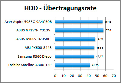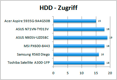 Sehr gut kann sich die verbaute Festplatte verkaufen. Das von ASUS gewählte Modell kann sich an die Spitze unseres Testfelds setzen, wenn es um den Durchsatz geht. Hinsichtlich der Zugriffszeit ordnet sie sich im guten Mittelfeld ein.