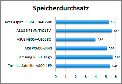 Auch der Speicherdurchsatz liegt auf dem zu erwartenden Level. Natürlich können unsere Core2-Modelle nicht mit den neuen Geräten mithalten, die bereits auf den Core i7 setzen und damit einen in der CPU integrierten Speichercontroller auf der Habenseite vorweisen können. In der Praxis ist der Unterschied allerdings nur dann bemerkbar, wenn viele speicherintensive Anwendungen genutzt werden.