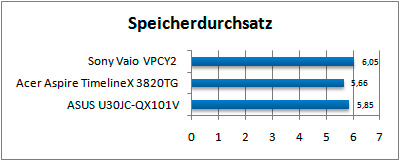 Beim Speicherdurchsatz merkt man dem Y21 an, dass sein Prozessor genau genommen ein Core-i-Ableger ist, denn in dieser Disziplin fällt der Pentium nicht hinter seine großen Geschwister zurück, sondern kann sich sogar an die Spitze setzen.