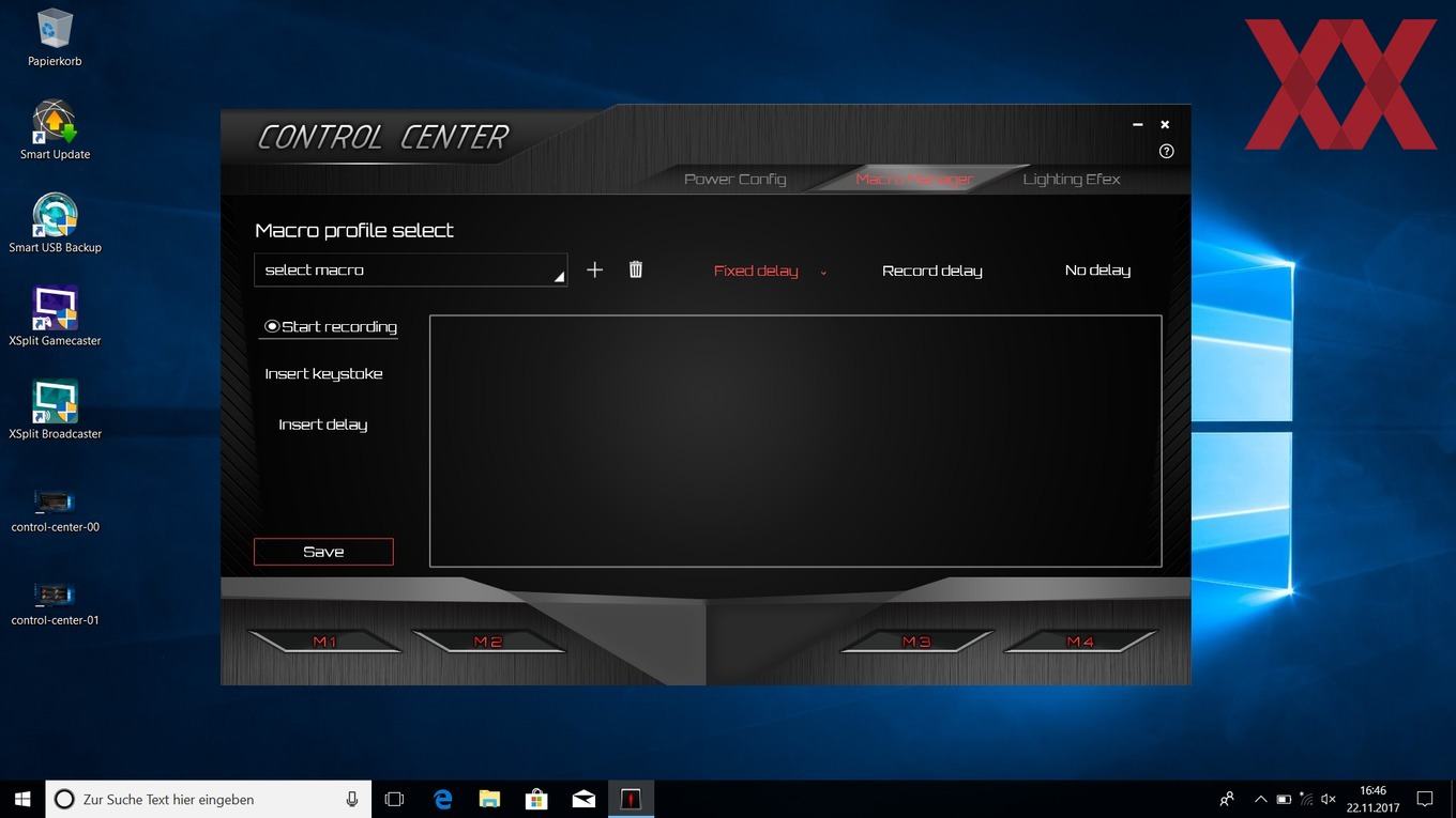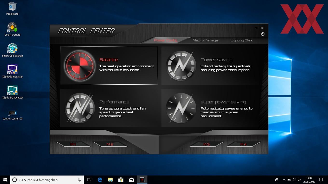 Herzstück auf Seiten der Software ist beim Gigabyte SabrePro 15W das Control Center. Darüber lassen sich alle wichtigen Funktionen anpassen und einstellen. Während unter "Power Config" das Systemprofil ausgewählt werden kann, wonach der Prozessor je nach ausgewähltem Profil seine Geschwindigkeiten automatisch anpasst und damit das Gerät vielleicht sogar etwas sparsamer macht, können im "Makro Manager" die vier Makro-Tasten, welche oberhalb der eigentlichen Tastatur untergebracht sind, programmiert werden. Die Hintergrundbeleuchtung der Tastatur lässt sich über das Control Center ebenfalls einstellen. Dabei kann die Tastatur in vier Zonen eingeteilt werden, die dann jeweils mit einem eigenen Farbprofil versehen werden können. Auch zahlreiche Beleuchtungseffekte sind möglich, darunter ein Pulsieren der Helligkeit, ein herzschlag-ähnlicher Effekt oder aber ein dauerhaftes Aufleuchten der LEDs. Gegenüber den teureren High-End-Modellen des Hauses lassen sich allerdings nicht mehr einzelne Tasten separat beleuchten.