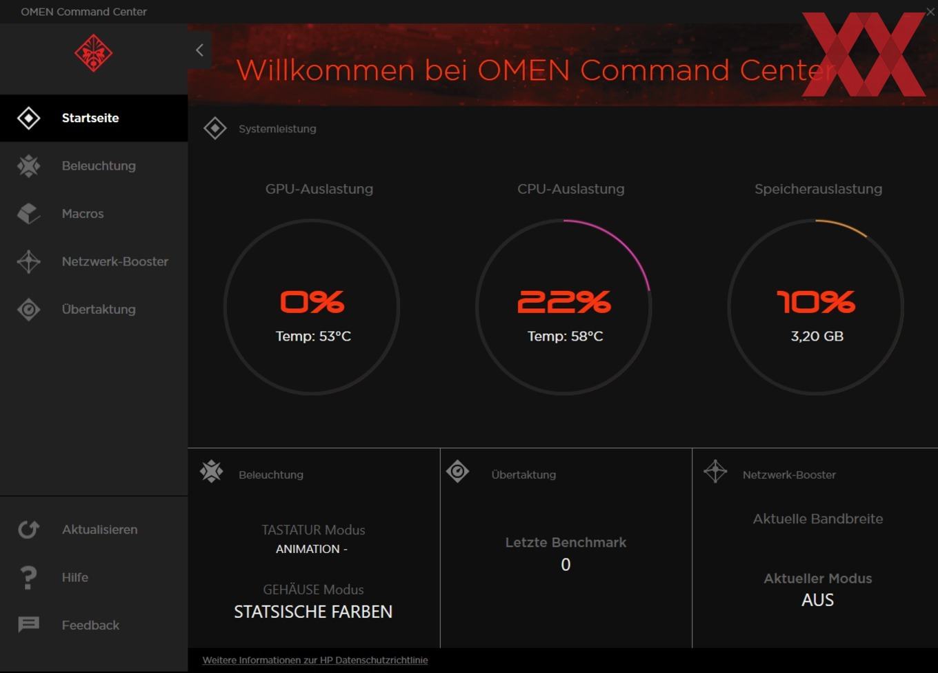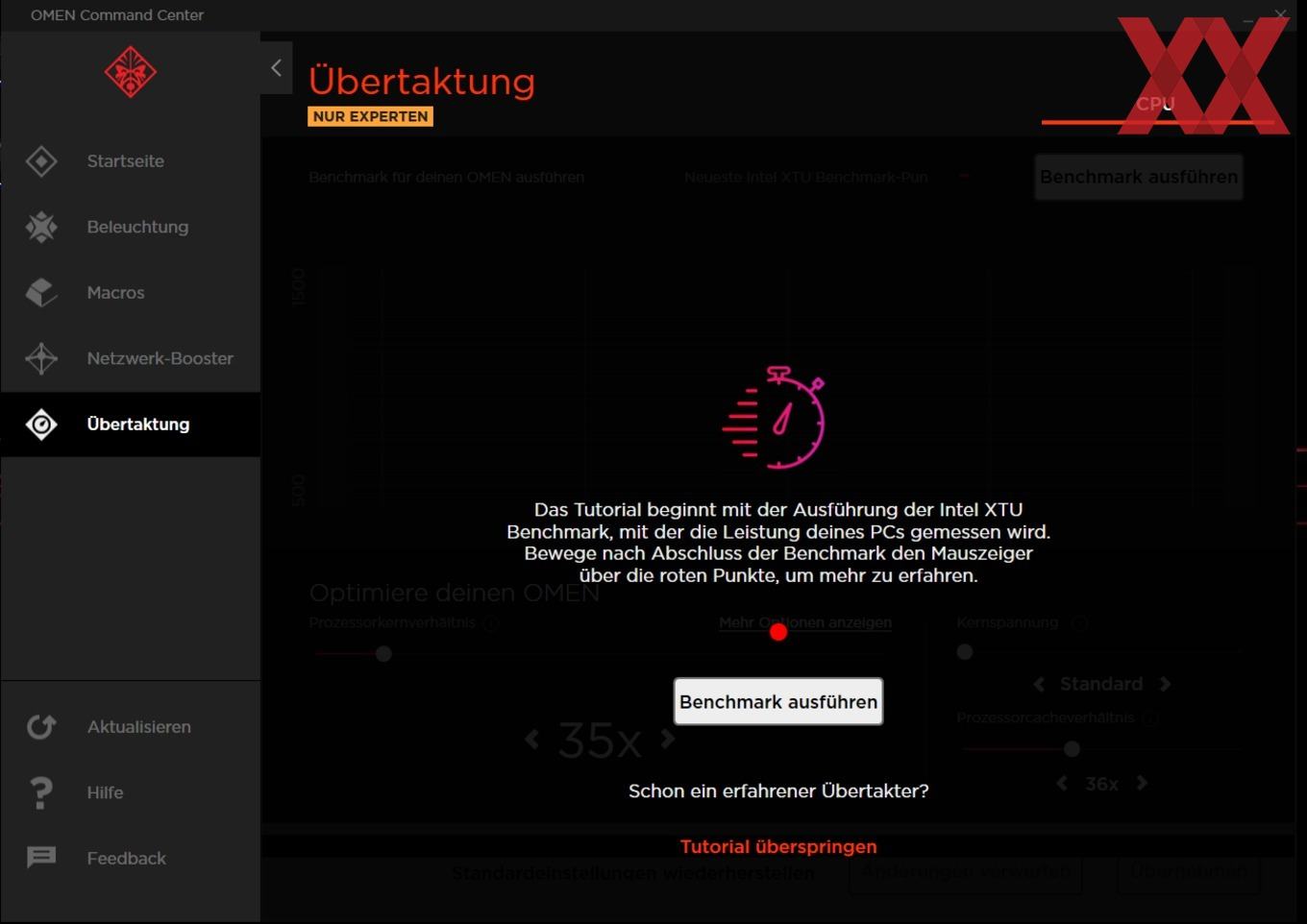 Auch wenn das BIOS bzw. UEFI nur sehr rudimentäre Einstellungen ermöglicht, unterstützt HP ein Overclocking der CPU über das hauseigene Omen-Command-Center-Tool. Das macht ein Übertakten per Schieberegler besonders einfach, obendrein wird die Stabilität in einem eigenen Benchmark überprüft. In kurzen Tests konnten wir den Takt problemlos um gut 300 MHz steigern.