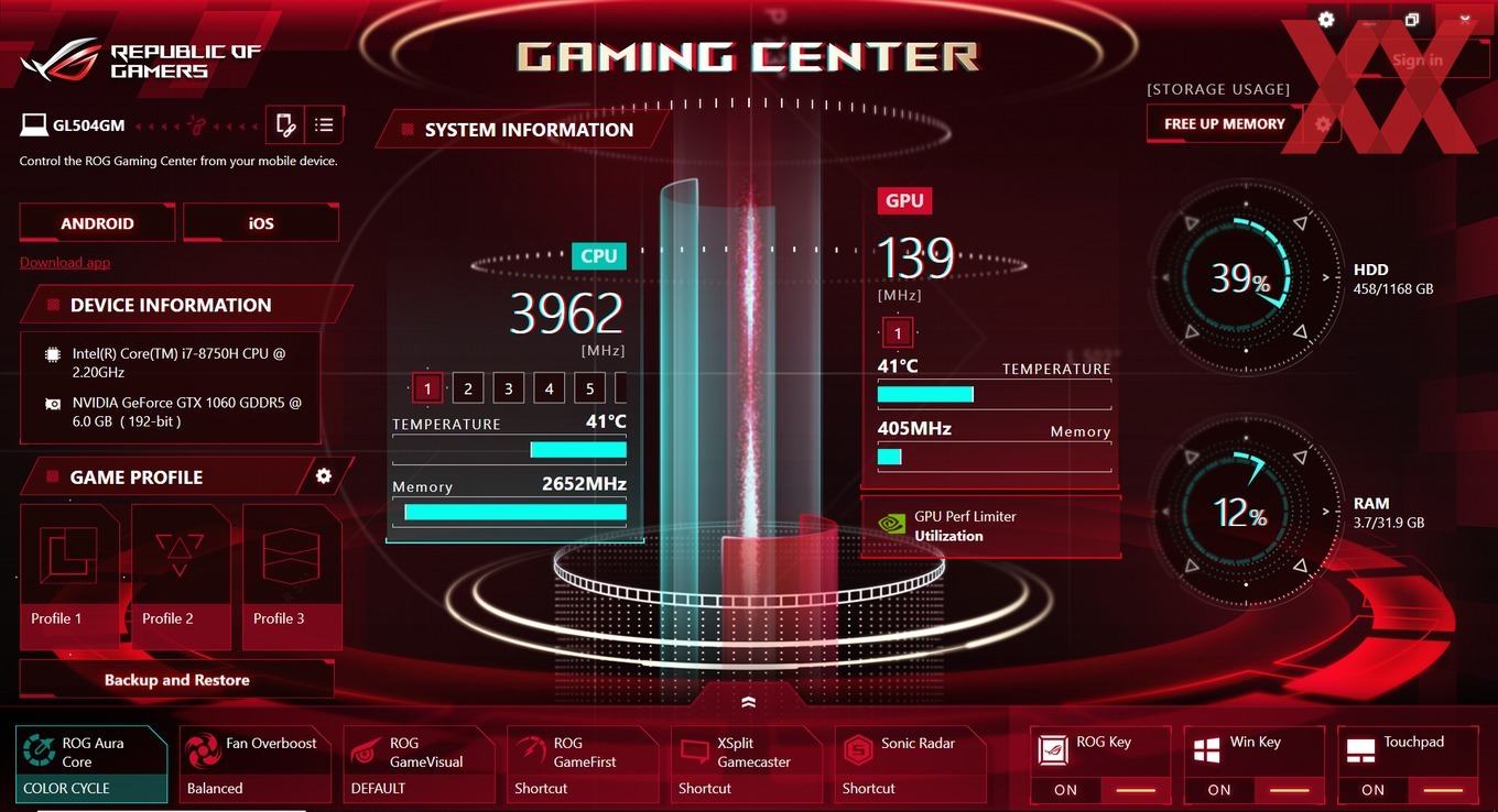 Wie schon das ASUS ROG Zephyrus M aus unserem letzten Test verfügt auch das ASUS ROG Strix Hero II GL504 über eine reichhaltige Software-Ausstattung. Ein Highlight ist hier abermals das Gaming Center, welches durchaus als zentrale Anlaufstelle für die wichtigsten Einstellungen des Notebooks herangezogen werden kann. Das Tool liefert nicht nur Auskunft über die aktuell anliegenden Taktraten von Prozessor und Grafikkarte und liest deren Temperaturen aus, sondern gibt auch Auskunft über die Auslastung des Arbeits- und Massenspeichers. Die Lüftergeschwindigkeit kann ebenso in drei verschiedenen Profilen angepasst werden, wie die Steuerung der Makrotasten, der Windows-Taste und des Touchpads, welche sich abschalten lassen, um ein versehentliches Auslösen beim Spielen zu verhindern.