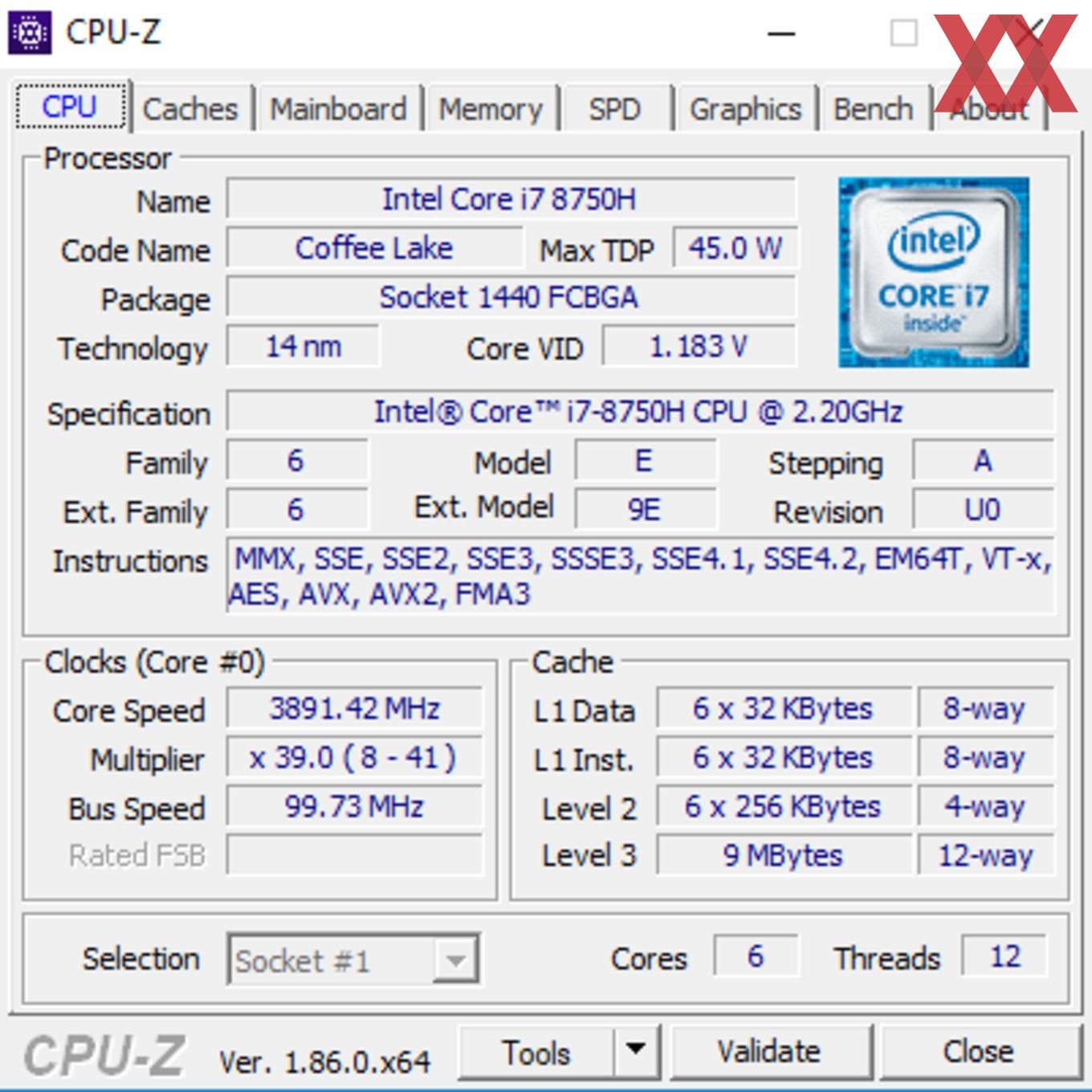 Im Gegensatz zum Vorgänger auf Kaby-Lake-Basis besitzt unsere CPU 50 % mehr Rechenkerne und bietet somit sechs statt wie bisher nur vier Cores, die obendrein Unterstützung für das SMT-Feature bieten und damit bis zu zwölf Threads zur gleichen Zeit verarbeiten können. Um den Intel Core i7-8750H weiterhin in die TDP-Klasse von 45 W einsortieren zu können, musste Intel die Taktraten teilweise deutlich nach unten korrigieren. Während sich der Intel Core i7-7700HQ noch mit Geschwindigkeiten von 2,8 bis 3,8 GHz ans Werk macht, ist der Core i7-8750H mit einem Grundtakt von 2,2 GHz deutlich niedriger getaktet. Trotzdem soll dank eines höheren Turbo-Taktes von bis zu 4,1 GHz auch die Single-Core-Performance gegenüber dem Vorgänger verbessert worden sein. Das gilt jedoch nur, wenn ein einziger Core ausgelastet wird, denn bei Belastung aller sechs Kerne, sind es beim Maximal-Boost 3,9 GHz.