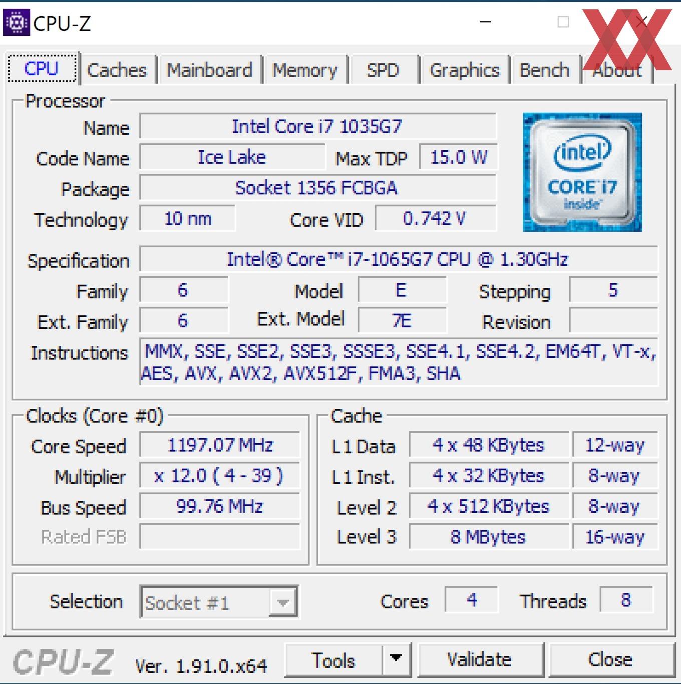 Herzstück des neuen Dell XPS 13 9300 ist ein Ice-Lake-Prozessor der zehnten Core-Generation von Intel. Dell verbaut wahlweise den Intel Core i5-1035G1 oder den Core i7-1065G7, welcher neben einer schnelleren CPU-Lösung auch eine performantere Grafiklösung bietet. Das von uns getestete Flaggschiff-Modell setzt natürlich auf das schnellere Modell von beiden – anders als fälschlicherweise von CPUz ausgelesen. Der Intel Core i7-1065G7 wird im 10-nm-Verfahren gefertigt und ist ein sparsamer Ultrabook-Prozessor mit vier Sunny-Cove-Kernen, die sich je nach Anwendungsgebiet mit einer Geschwindigkeit von 1,3 bis 3,9 GHz im Turbo ans Werk machen und dank SMT-Support acht Threads gleichzeitig verarbeiten können. Dazu gibt es einen 8 MB großen L3-Cache. Die TDP wird von Intel mit sparsamen 15 W angegeben.