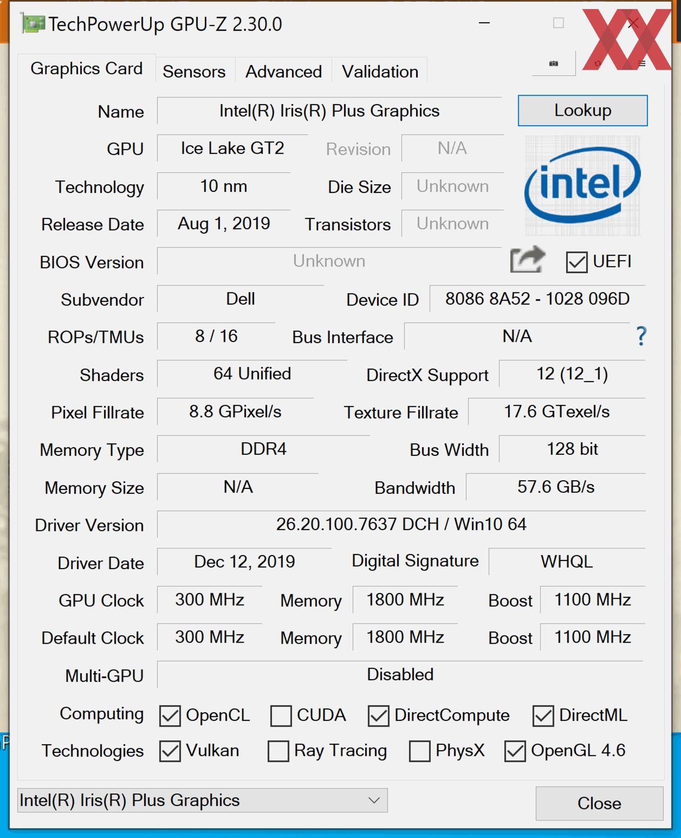 Um die 3D-Beschleunigung kümmert sich beim Dell XPS 13 9300 wieder einmal mehr, die in der CPU integrierte Lösung. Die Ice-Lake-CPU setzt hier auf die Gen11-Grafikeinheit, die einen Zwischenschritt zur ersten, wirklich neuen GPU-Architektur von Intel namens Xe darstellt und im Maximalausbau bis zu 64 Execution-Units mit einem Takt von bis zu 1,1 GHz bietet. Damit wird eine Rechenleistung von bis zu 1,12 TFLOPS bei FP32-Berechnungen, bzw. 2,25 TFLOPS bei halber Genauigkeit erreicht. Ihren Videospeicher zwackt sich die Intel Iris Plus Graphics direkt vom Hauptspeicher ab, was standardmäßig bis zu 1.024 MB sein können. Unser Sample ist mit insgesamt 16 GB LPDDR4X-Arbeitsspeicher im schnellen Dual-Channel-Modus ausgerüstet, der es auf stolze 3.733 MHz bringt.