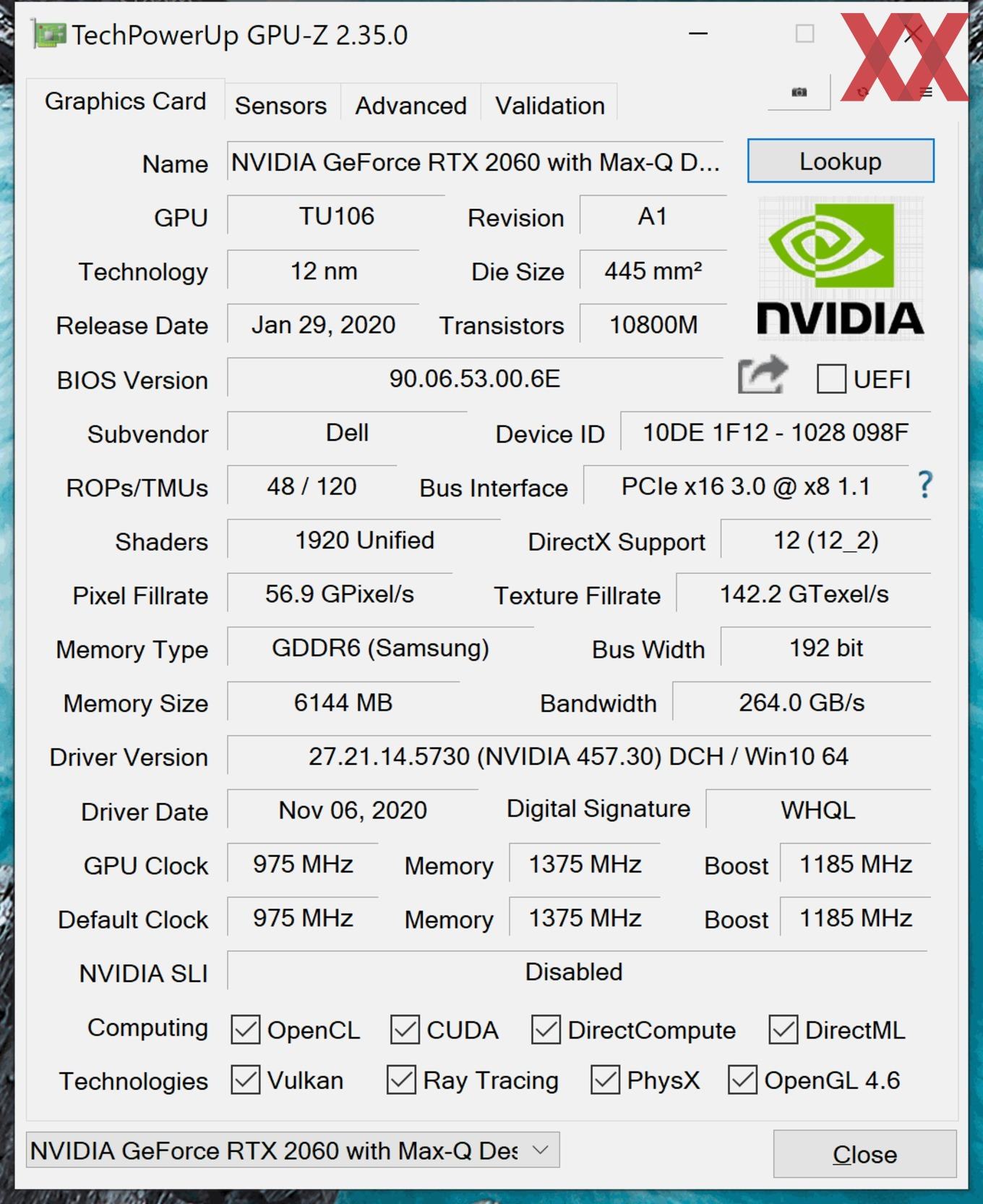 An den Speichercontroller schließt Dell zwei DDR4-Module im Dualchannel-Modus zusammen, die sich mit 3.200 MHz ans Werk machen und insgesamt 16 GB bieten. Die integrierte Grafiklösung des Prozessors wird jedoch nur im 2D-Betrieb genutzt, denn für umfangreiche 3D-Berechnungen oder zusätzliche Render-Aufgaben bietet unser Testmodell eine dedizierte NVIDIA GeForce RTX 2060 Max-Q an. Sie ist etwa 5 bis 10 % langsamer als die reguläre Variante und entspricht technisch fast 1:1 dem Desktop-Modell, womit sich die Leistungseinbußen demgegenüber in Grenzen halten. Der Grafikchip baut auf der TU106-GPU auf, die 10,8 Milliarden Transistoren auf 445 mm² unterhält. Zur Verfügung stehen insgesamt 1.920 Shadereinheiten sowie ein 6 GB großer GDDR6-Videospeicher, der über ein 192 Bit breites Interface anbindet. Die Taktraten belaufen sich auf bei unserem Testgerät auf 975/1.185/1.375 MHz.