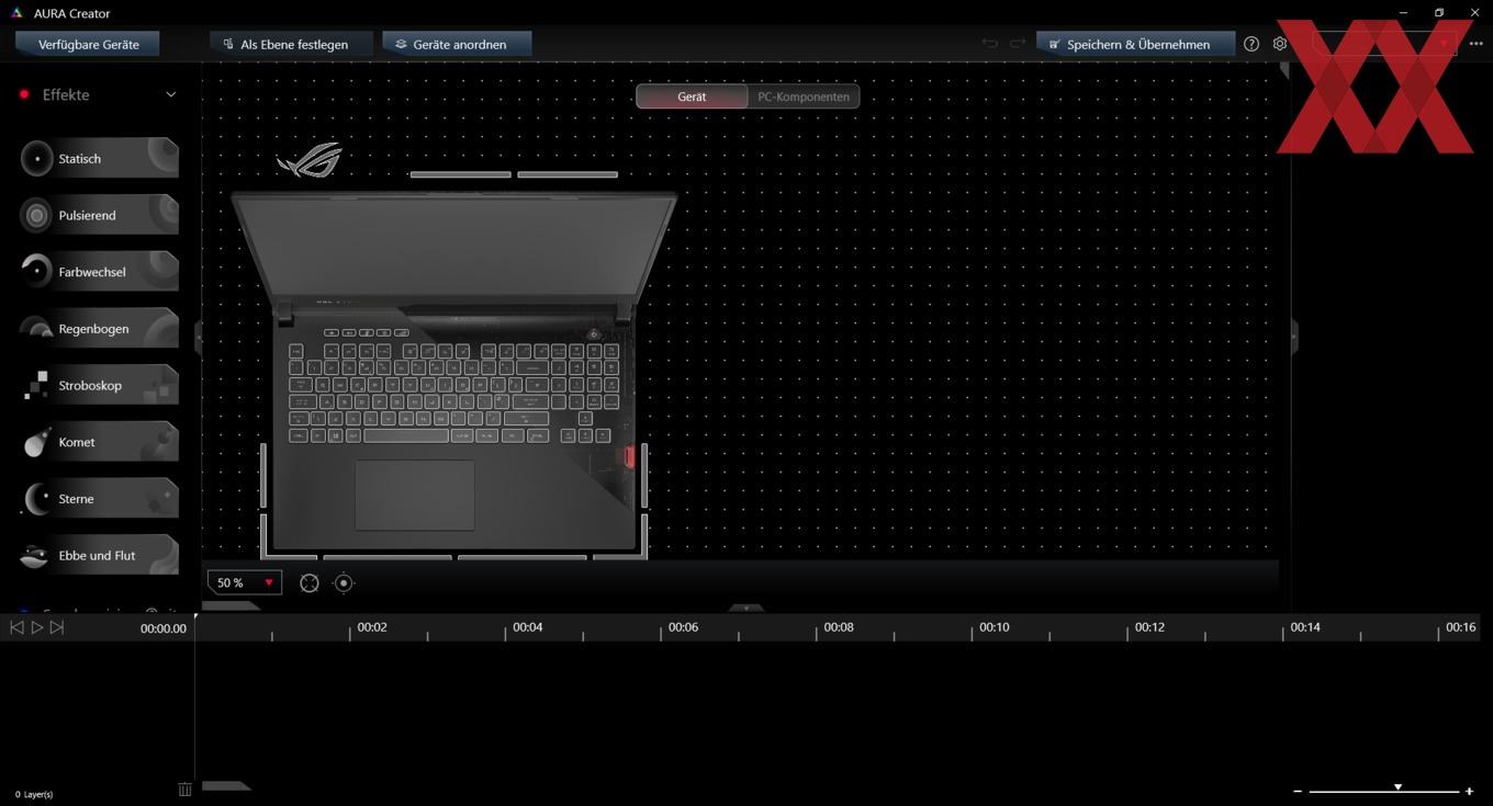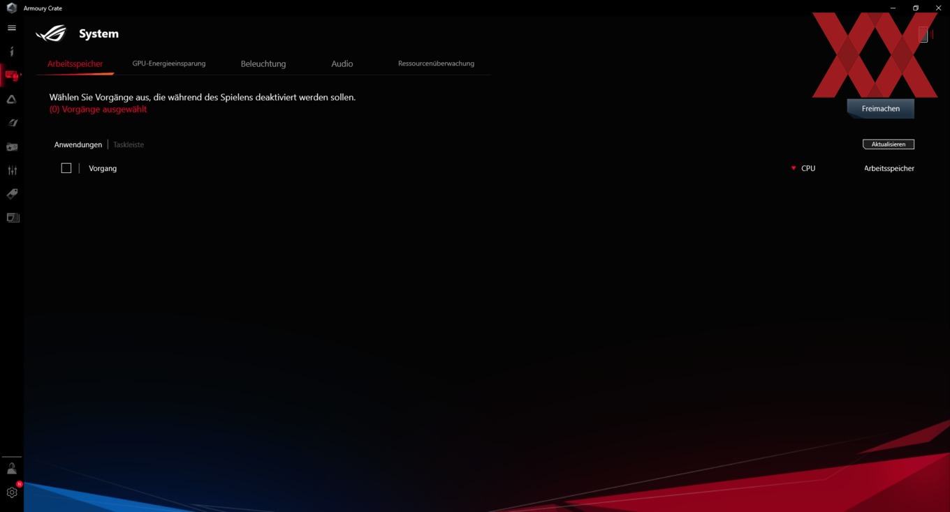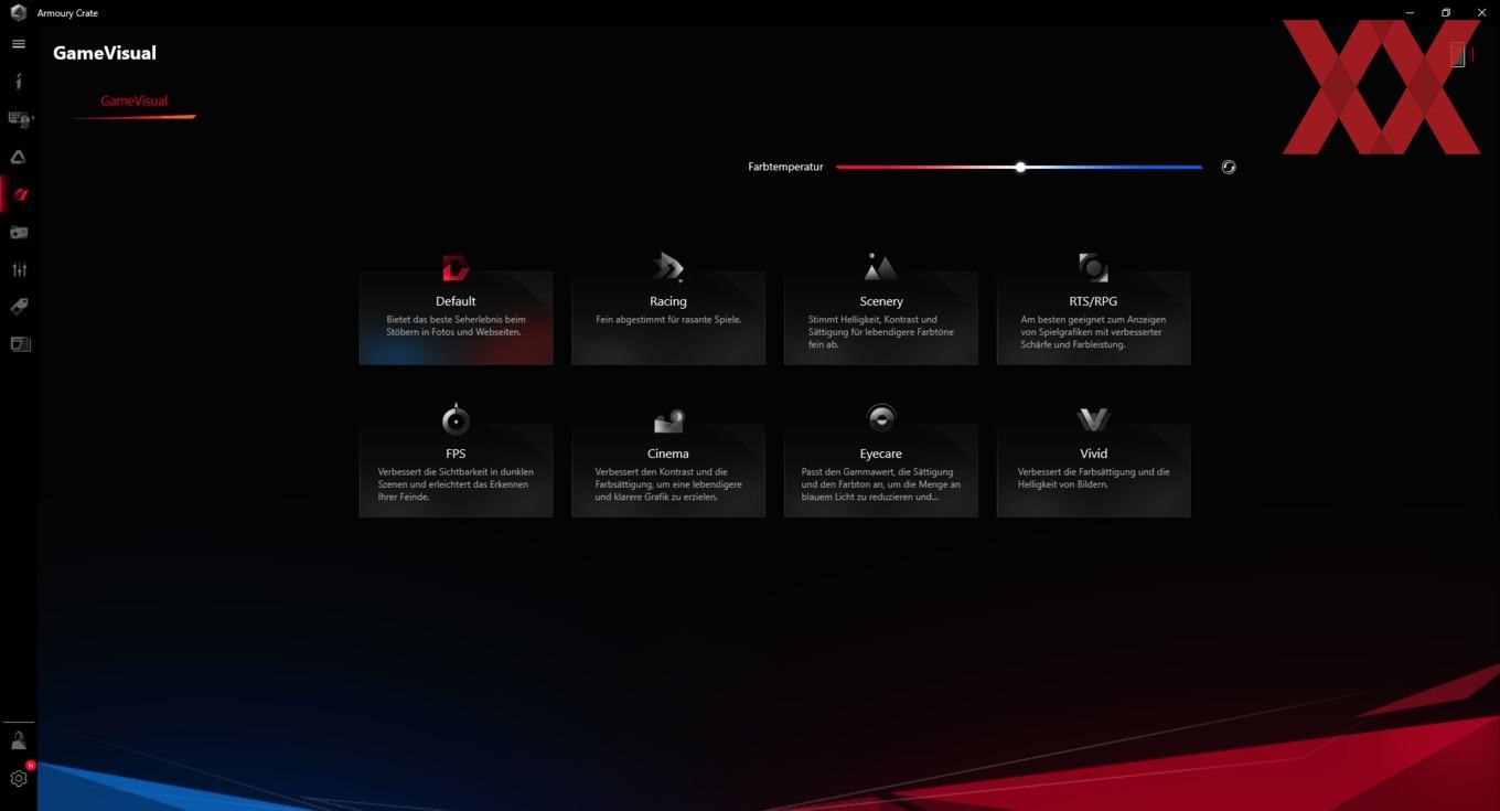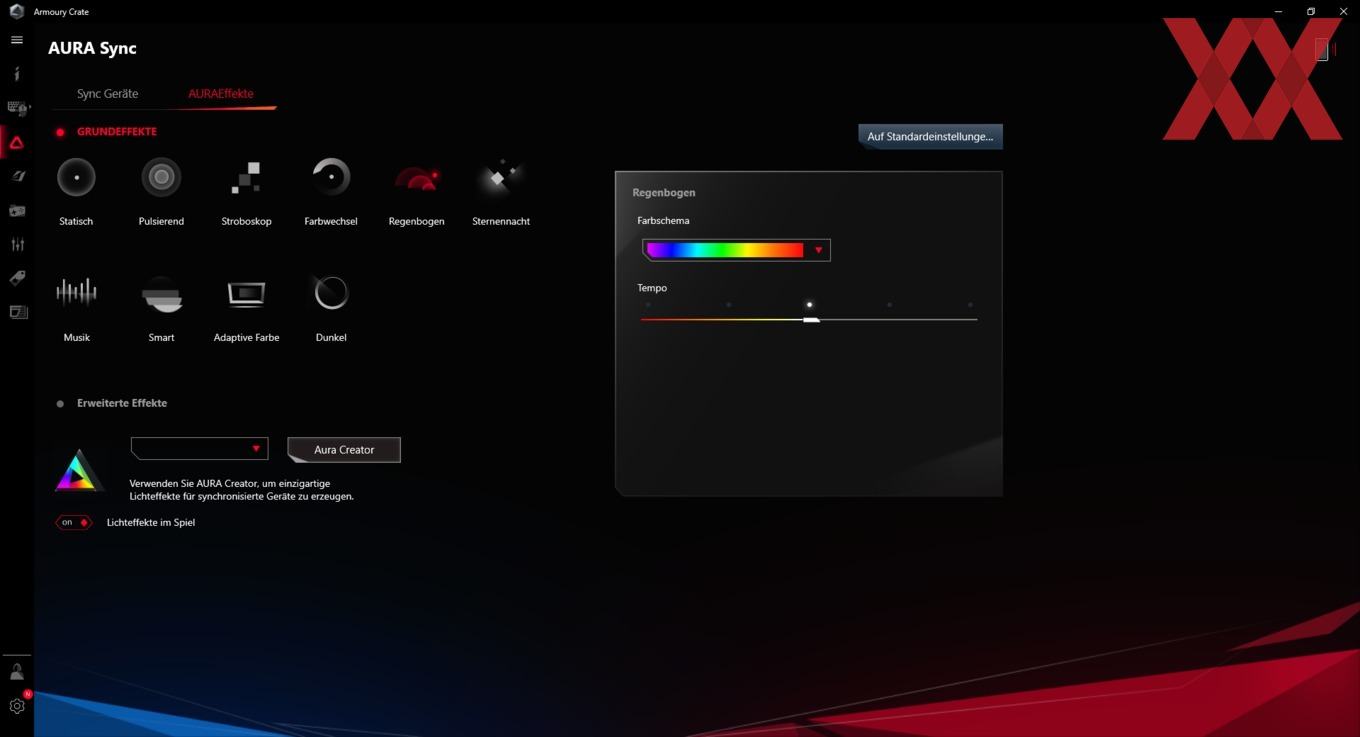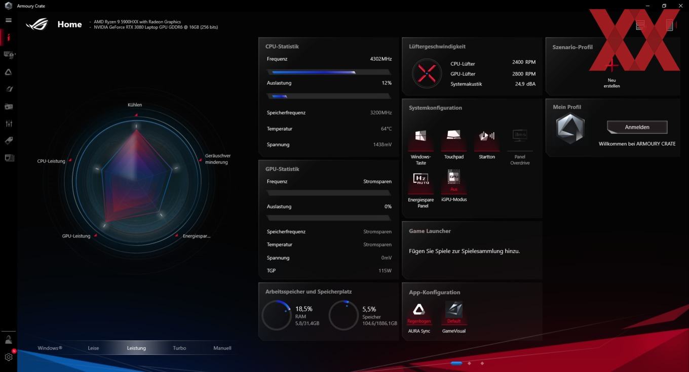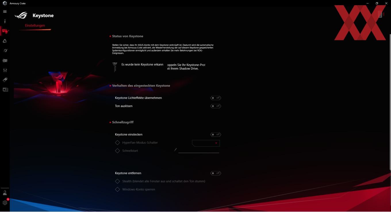 Highlight bei der Software ist natürlich das Armoury-Crate-Tool, welches als zentrale Anlaufstelle für alle wichtigen Einstellmöglichkeiten des ASUS ROG Strix SCAR 17 dient. Hier lassen sich nicht nur die Taktraten des AMD Ryzen 9 5900HX oder der NVIDIA GeForce RTX 3080 auslesen, sondern auch deren Temperatur-Werte und Auslastung sowie die Speicherbelegung des Arbeits- und Massenspeichers. Die Lüftergeschwindigkeiten können ebenfalls eingesehen werden. Per AURA Sync wird die RGB-Beleuchtung der Tastatur, des ROG-Logos auf dem Bildschirmdeckel und des Leuchtstreifens an der Stirnseite konfiguriert. Hier stehen zahlreiche vorgefertigte Beleuchtungseffekte sowie eine beliebige Farbe zur Auswahl. Die Einstellungen lassen sich dann direkt im Keystone-Stick ablegen, oder das versteckte Laufwerk für die geschützten Daten aktivieren.